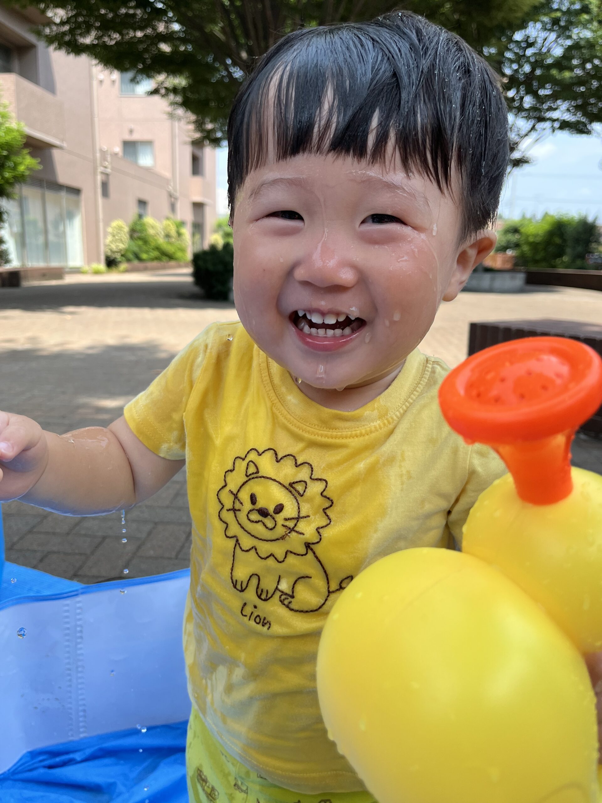 テラスでは、バケツやジョウロを使って水遊び。水をパシャパシャ自分にかけて、「あーー!つめたい!」「もっとやる~!」と、とびきりの笑顔。