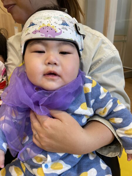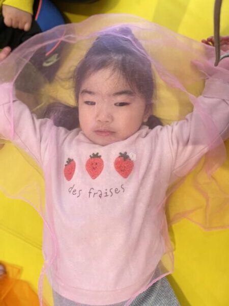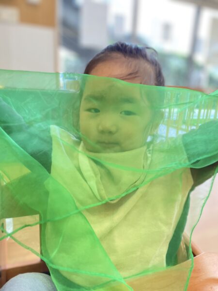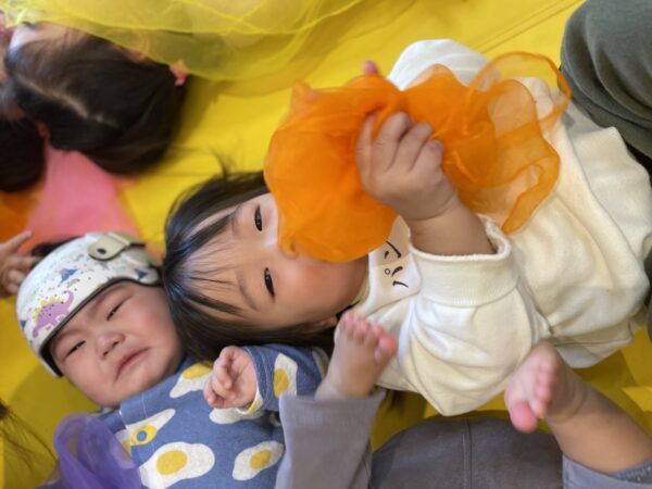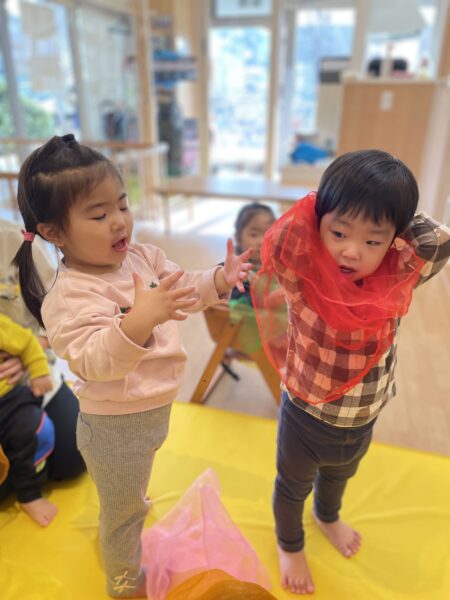 スカーフを使い、風ふくなのわらべ歌で、北風を表現します。