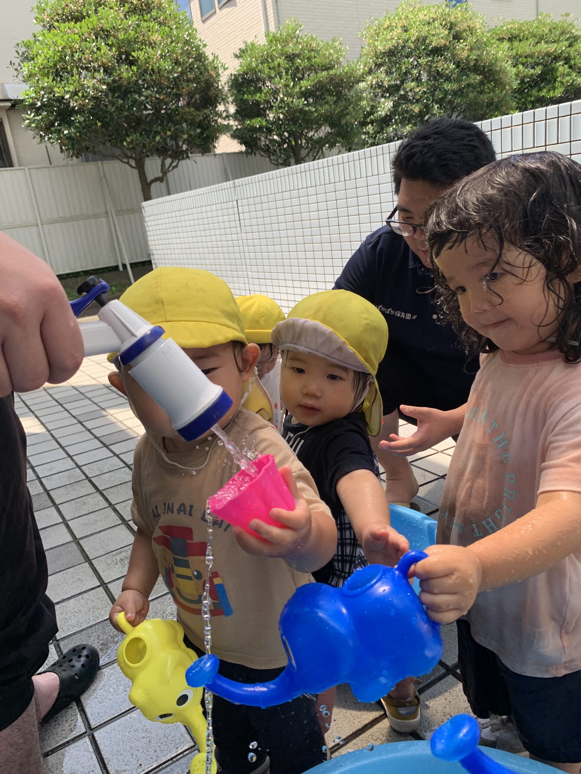 ホースから出る水を手で受けて「シャワーみたい!」と