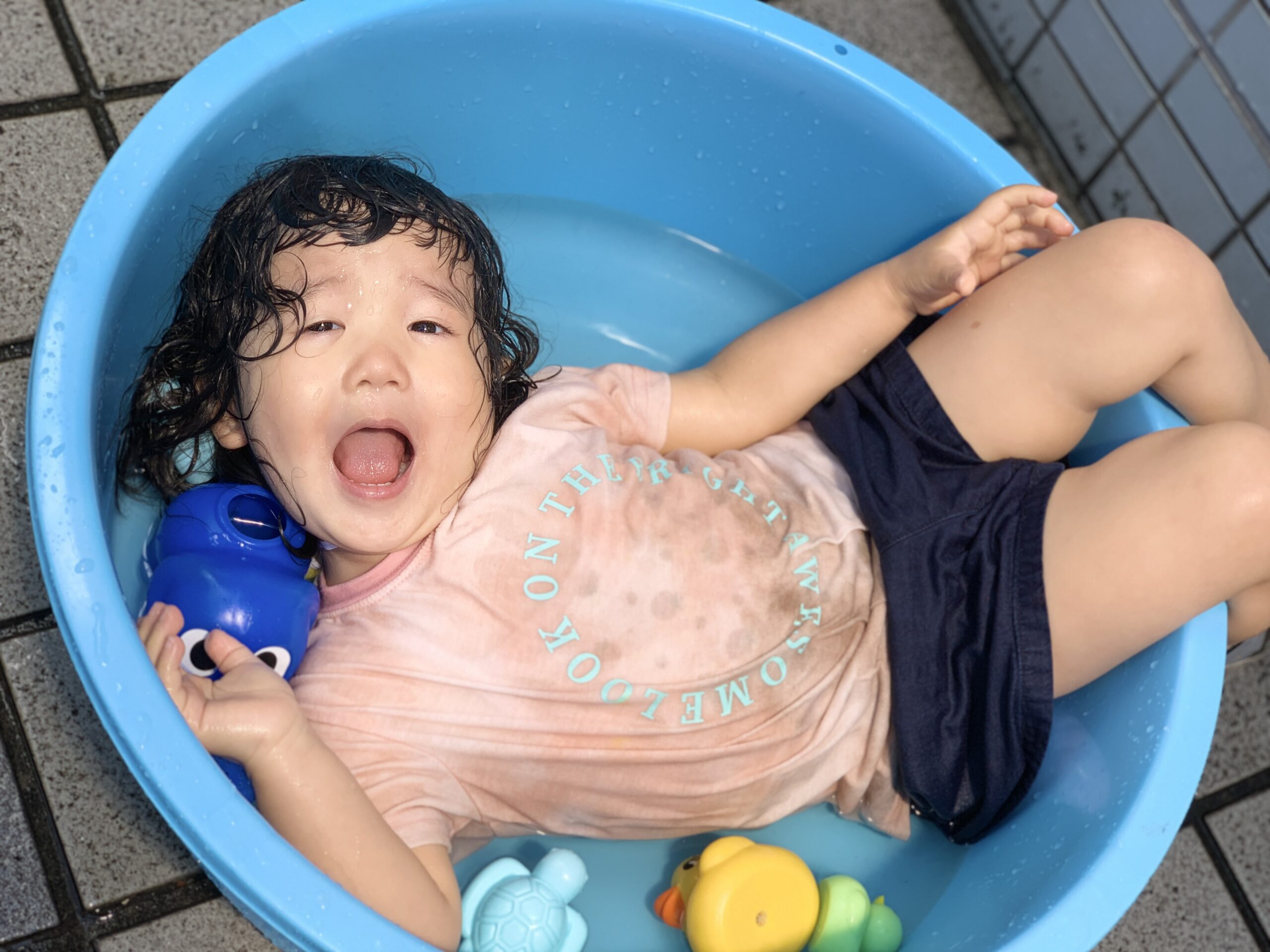 タライの中に浮かべたおもちゃを見て「わあ〜!ういてる!」