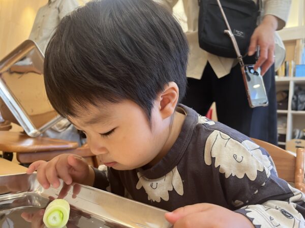 ニラに驚く0歳さんの姿が微笑ましかったです。0歳さんには、「においのとおりみち」を目で見えるように手をあおいで風を作り、「風で運ばれるね」とイメージを共有。1歳さんは「クンクン」「ふんふん」とリズムで嗅ぐ遊びにして、においの強弱の切り替えを楽しみます。2歳さんは「においメーター」を指で作り、弱→中→強の3段階で自己評価。「いまは真ん中!」と自分の感じ方を言葉に。「つーん」「あまい」「くさい」「おいしそう」と、表現のバリエーションも増えました。先生が「お料理のとき、どのにおいがすると食べたくなる?」と問いかけると、「たまねぎ!」「にんにく!」と好きがはっきり。「じゃあ、においがしたら『近くにお料理がある』ってわかるね」と生活と学びの橋渡しをしました。