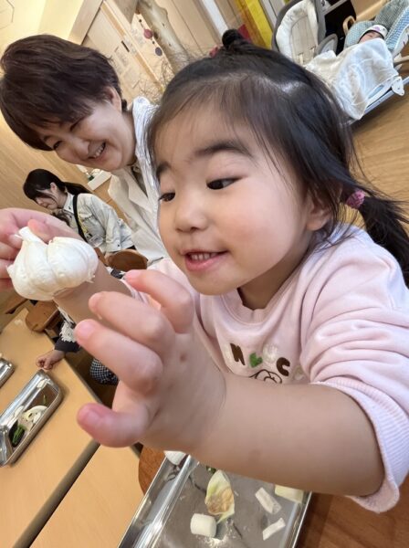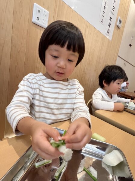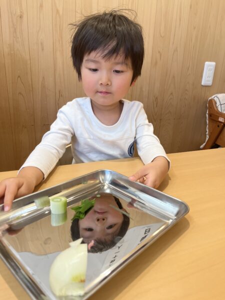 今日は保育室でサイエンス+。ネギ、たまねぎ、にんにく、にらを並べて「どんなにおい?」を確かめました。
