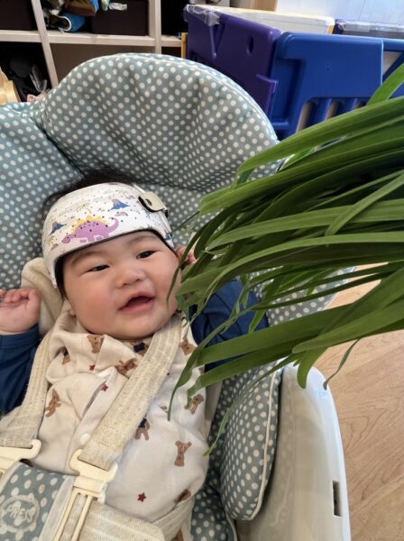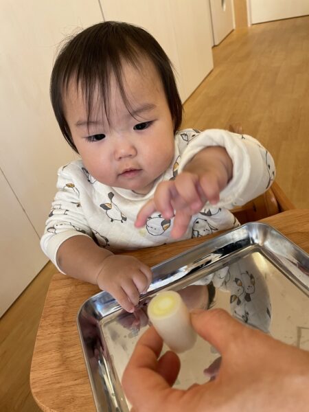 0歳さんたちも挑戦!ネギを触って確かめて、見て体験をしました。