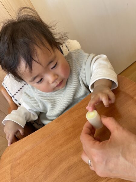 先生が「まずは遠くからクンクンってしてみよう」と声をかけると、2歳さんが嗅ぐ前から顔をしかめて「やだ〜!くさいにおい?」と身構え。「ちょっとずついこうね、いやだったら離れてもいいよ」と個別対応保育で安心の選択肢を伝えます。1歳さんはネギを前にして「なにこのにおいー!?」と笑って面白反応。「おもしろいね、どんな感じ?」に「くさい!」と即答。0歳さんは先生と一緒にそっと近づき、「少しだけね」と言いながら、手を添えて空気だけ嗅ぐ体験からスタートしました。
