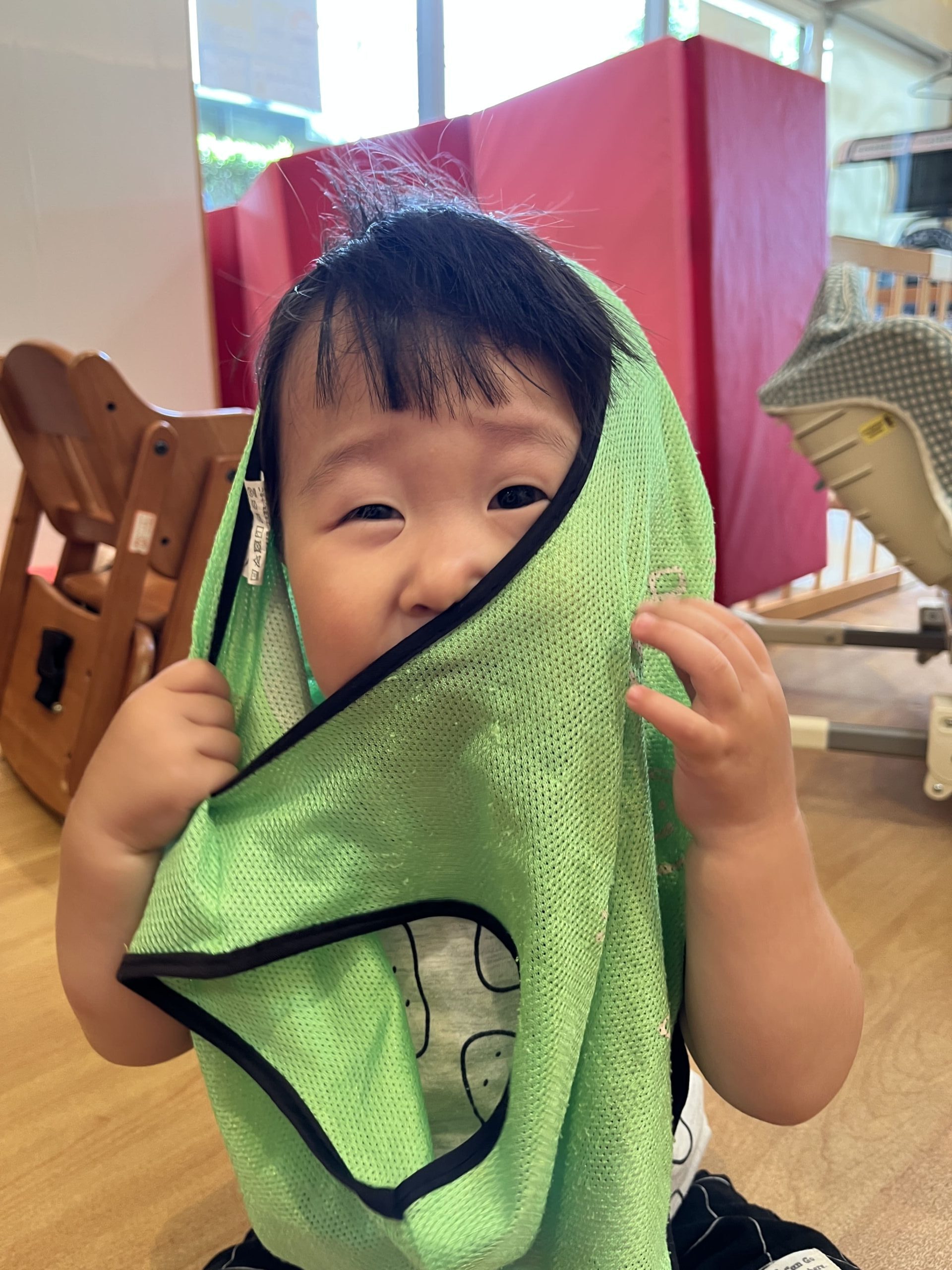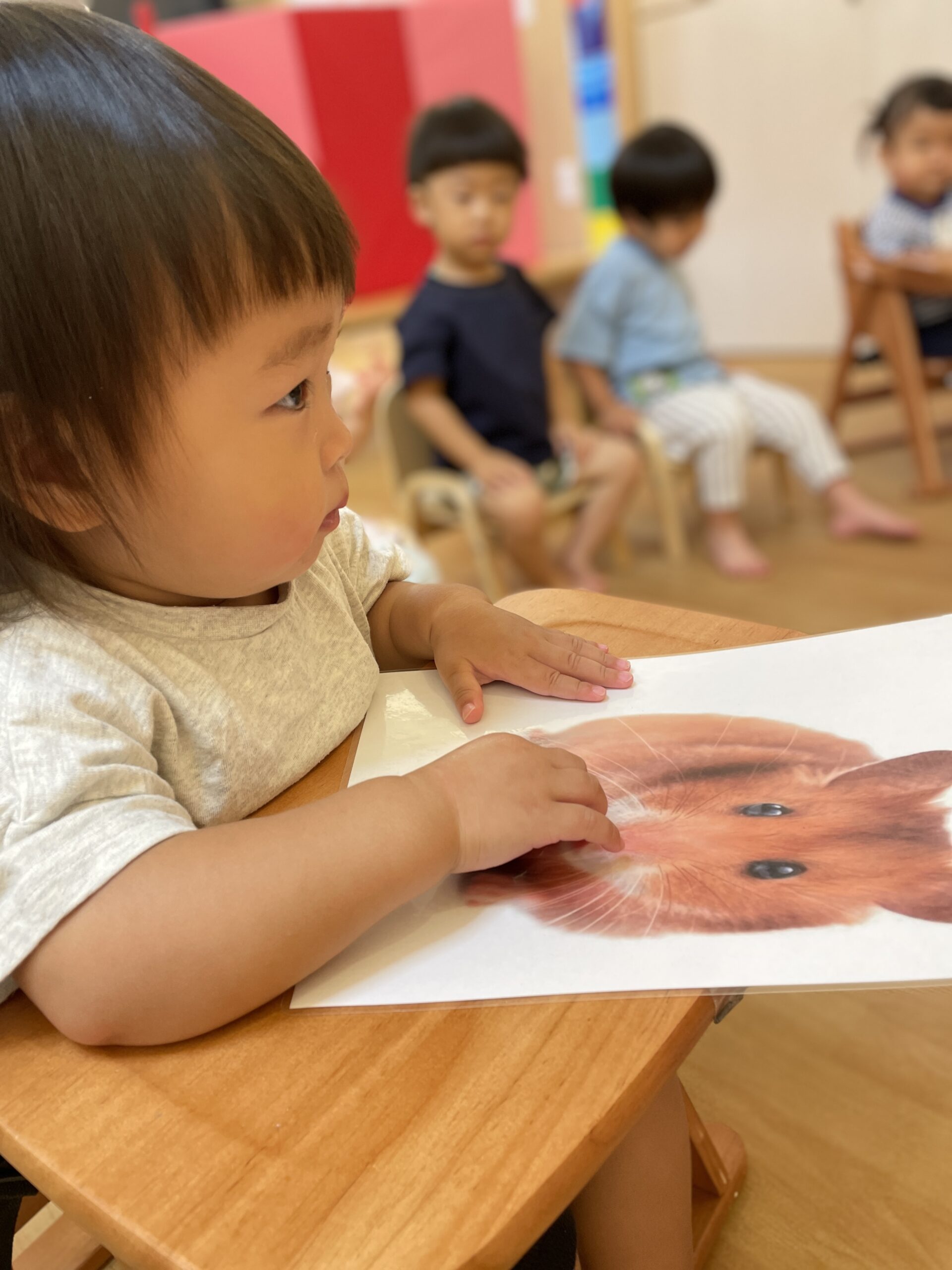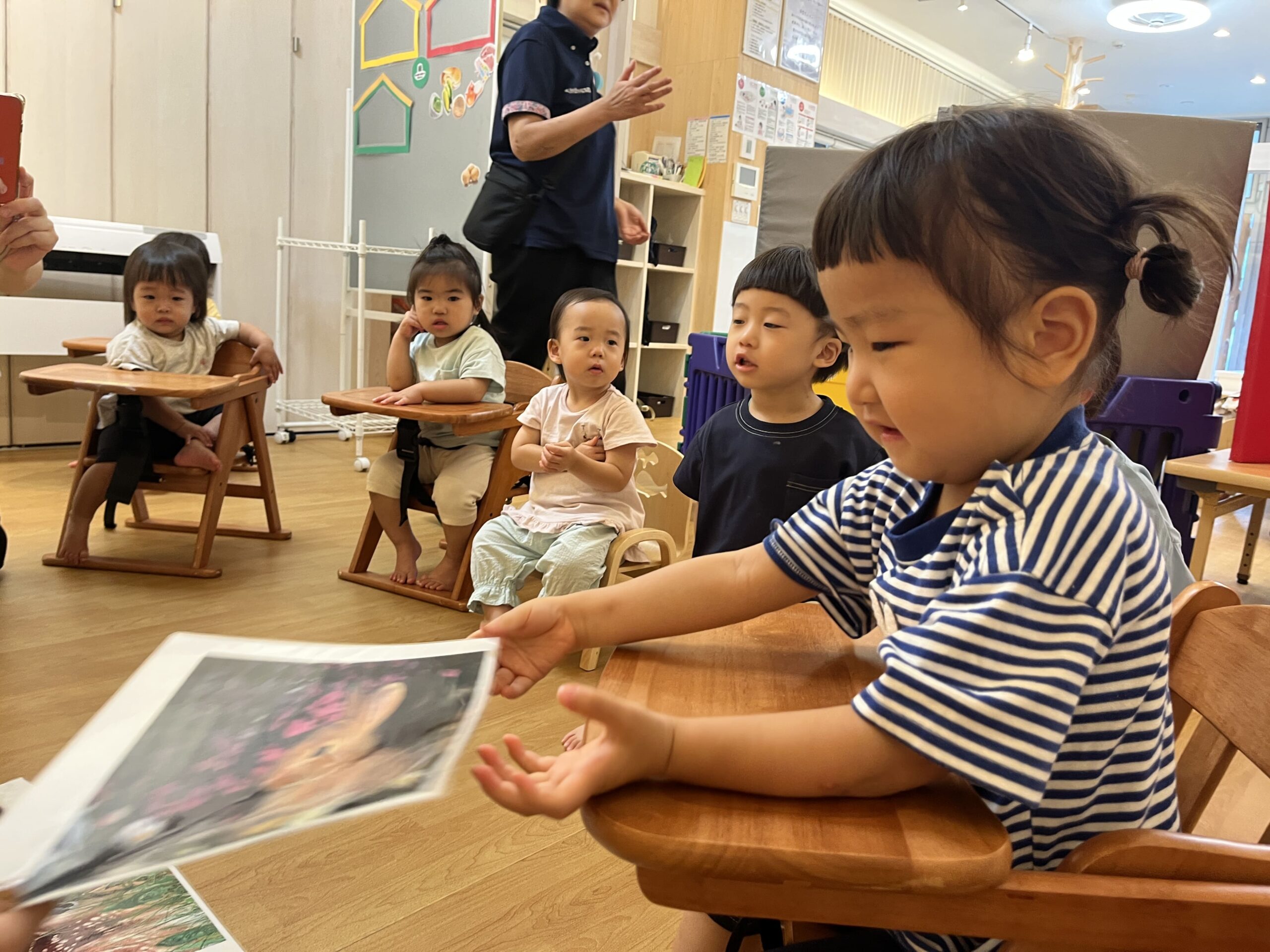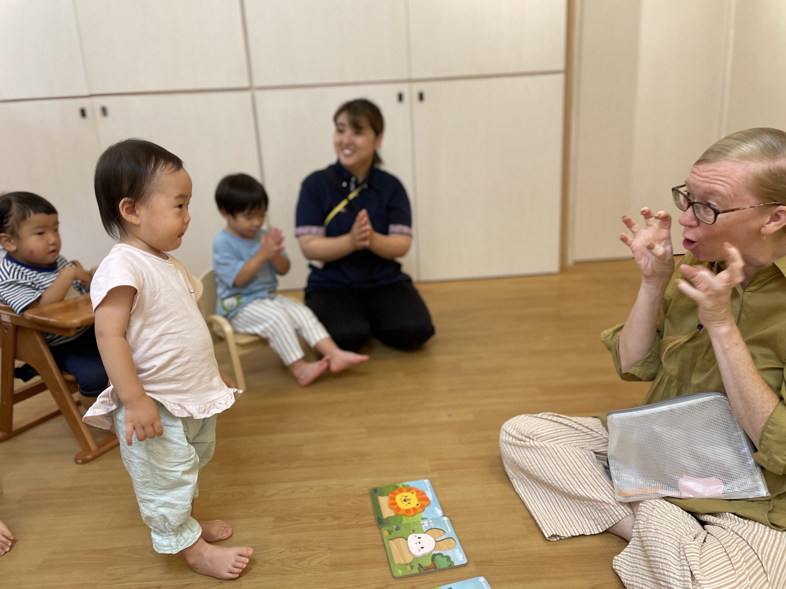 英語遊びの途中から参加したお友だち。おはよーのご挨拶に、みんなにっこり♡可愛らしい姿です。