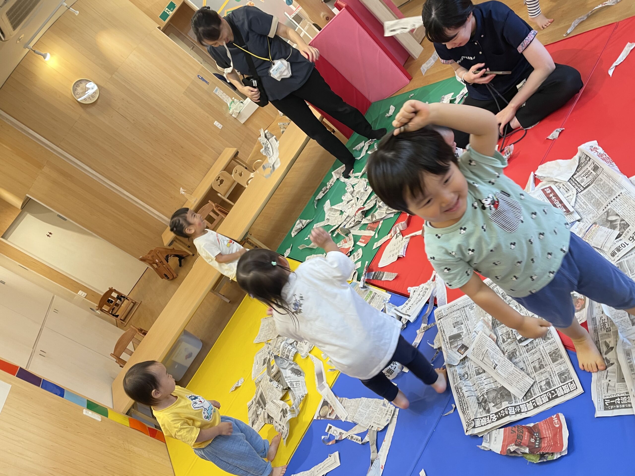 新聞紙を思いきりビリビリ破って、丸めたり、上に投げてヒラヒラ落としてみたり。子どもたちの「びりびり~!」「みてみて、たくさんになった!」の声が響きました。新聞紙の感触を楽しみながら、感性と発想がどんどん広がります。