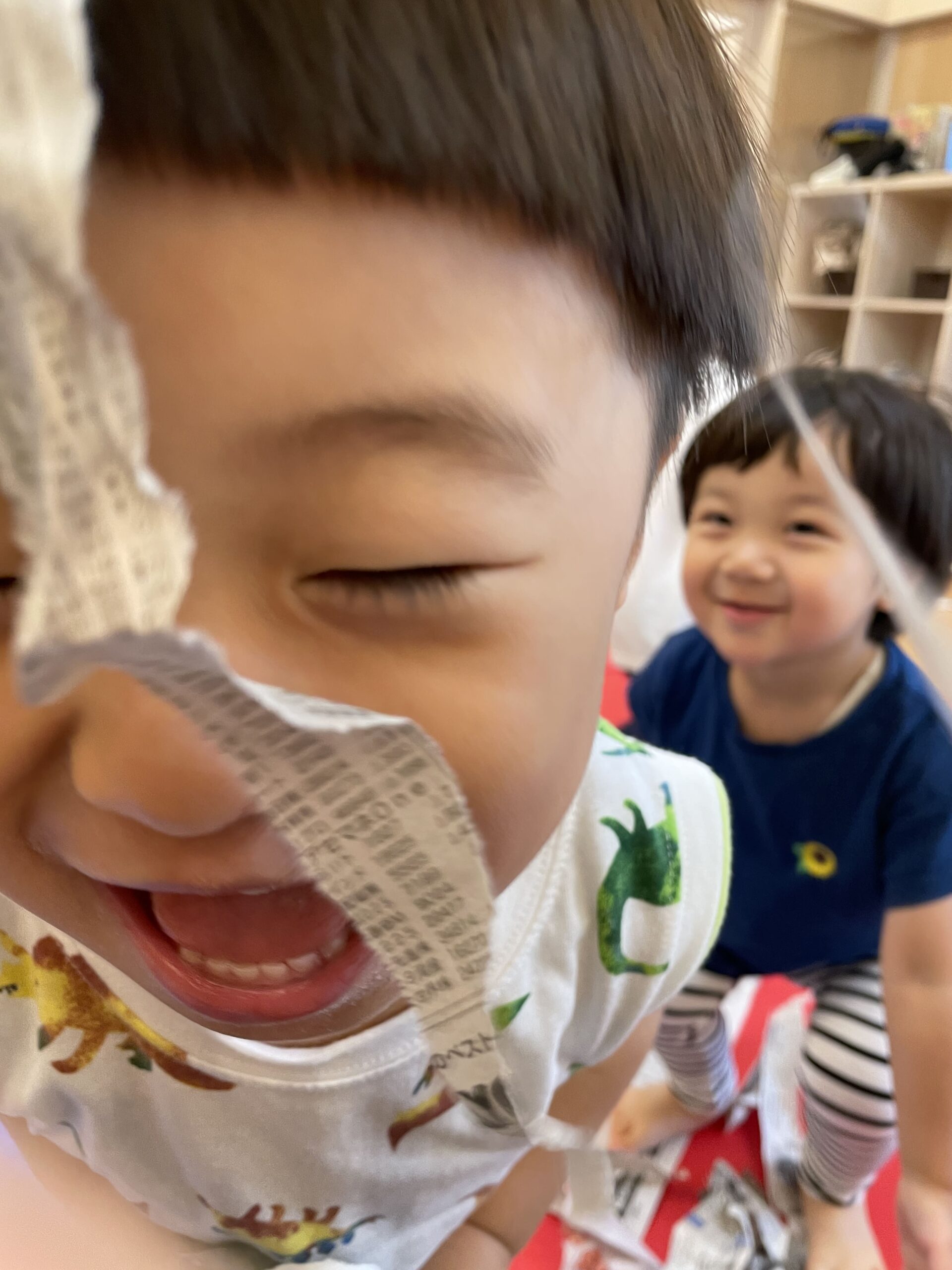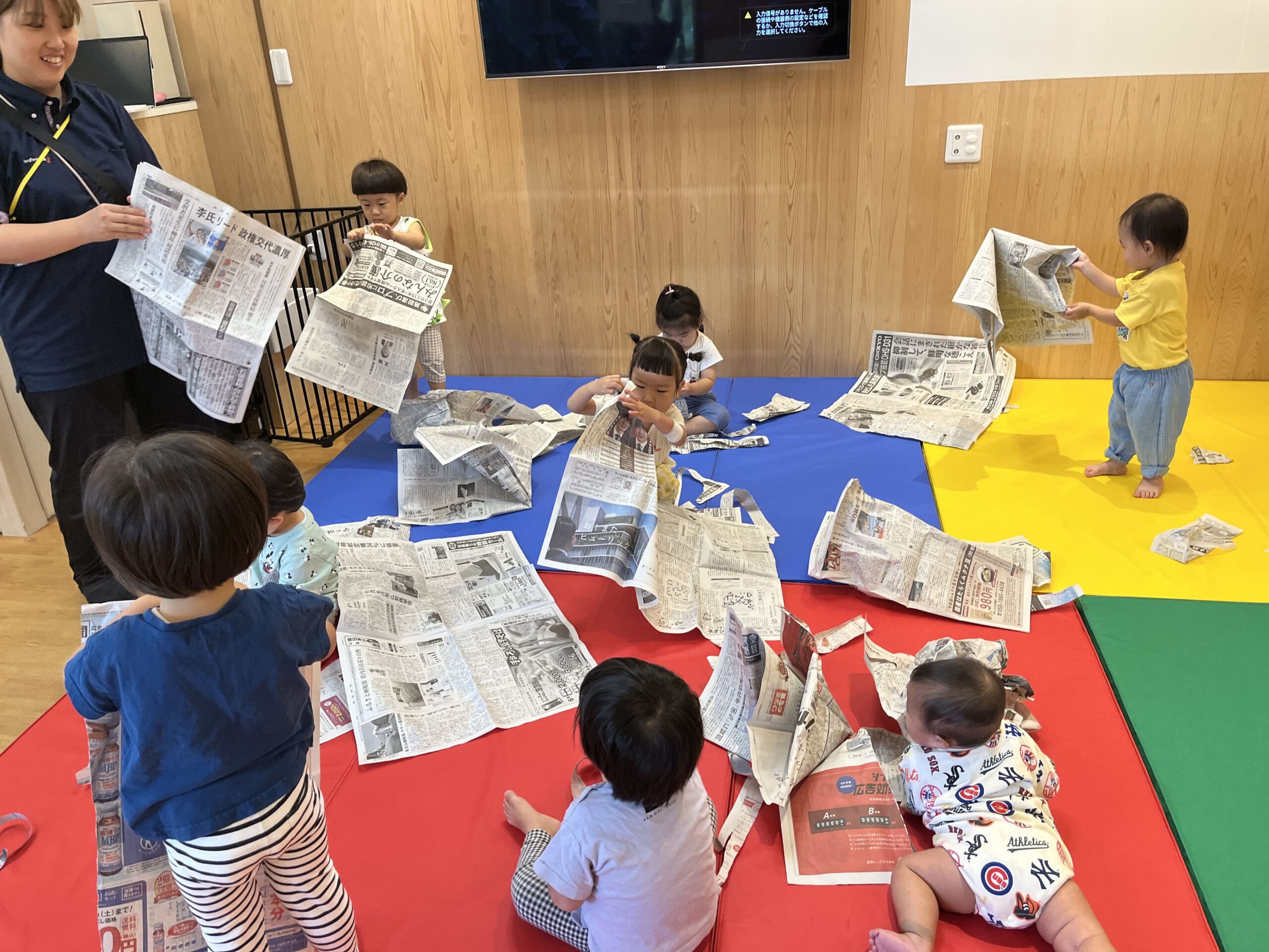 今日一番の驚きは、新聞紙あそびの途中で1歳児の子どもが、破った新聞紙を自分だけではなく、まだ小さな0歳児さんの手にも「どうぞ」と渡してくれたこと!