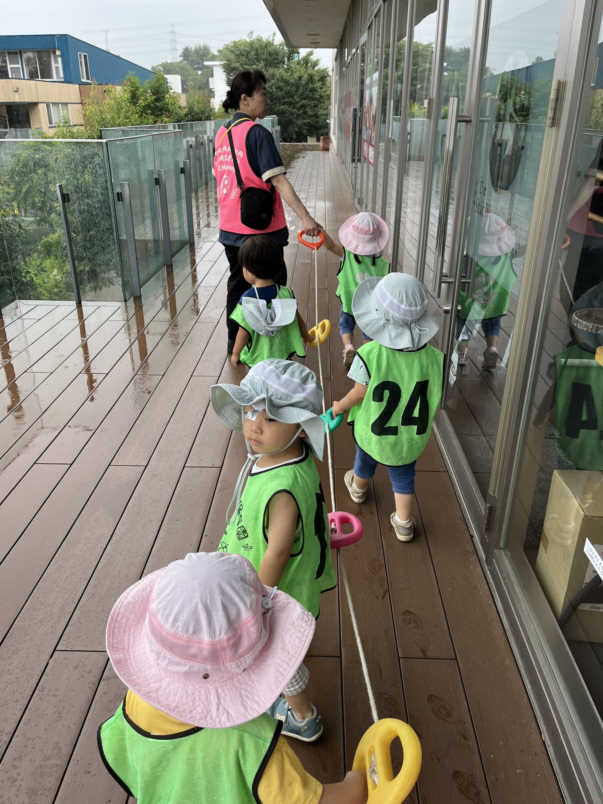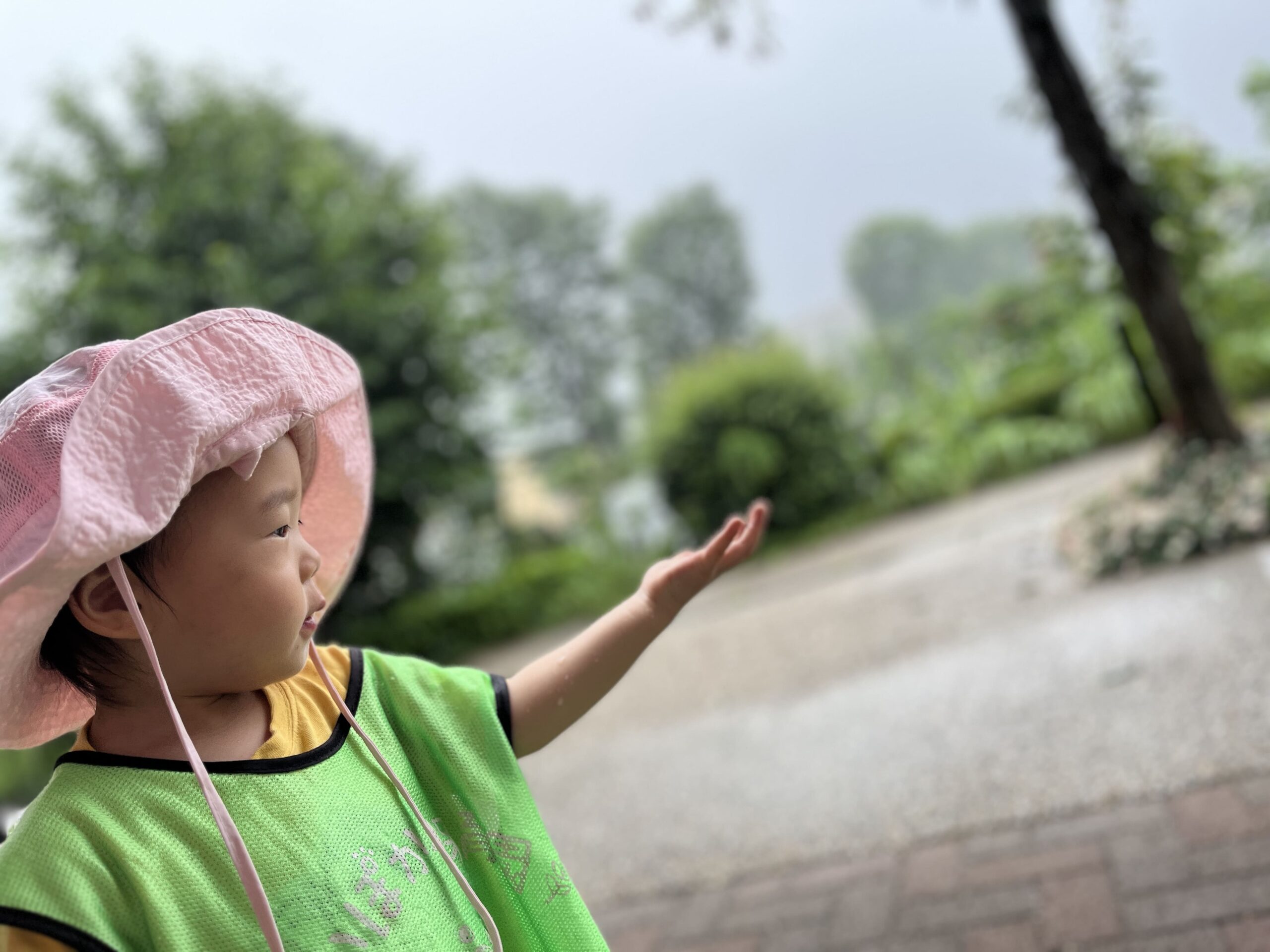 雨のしずくが手に当たると、子どもたちは「つめたい!」「きもちいい!」と夢中に。おててをいっぱいに広げて、しずくの感触を不思議そうに、そして楽しそうに味わっていました。