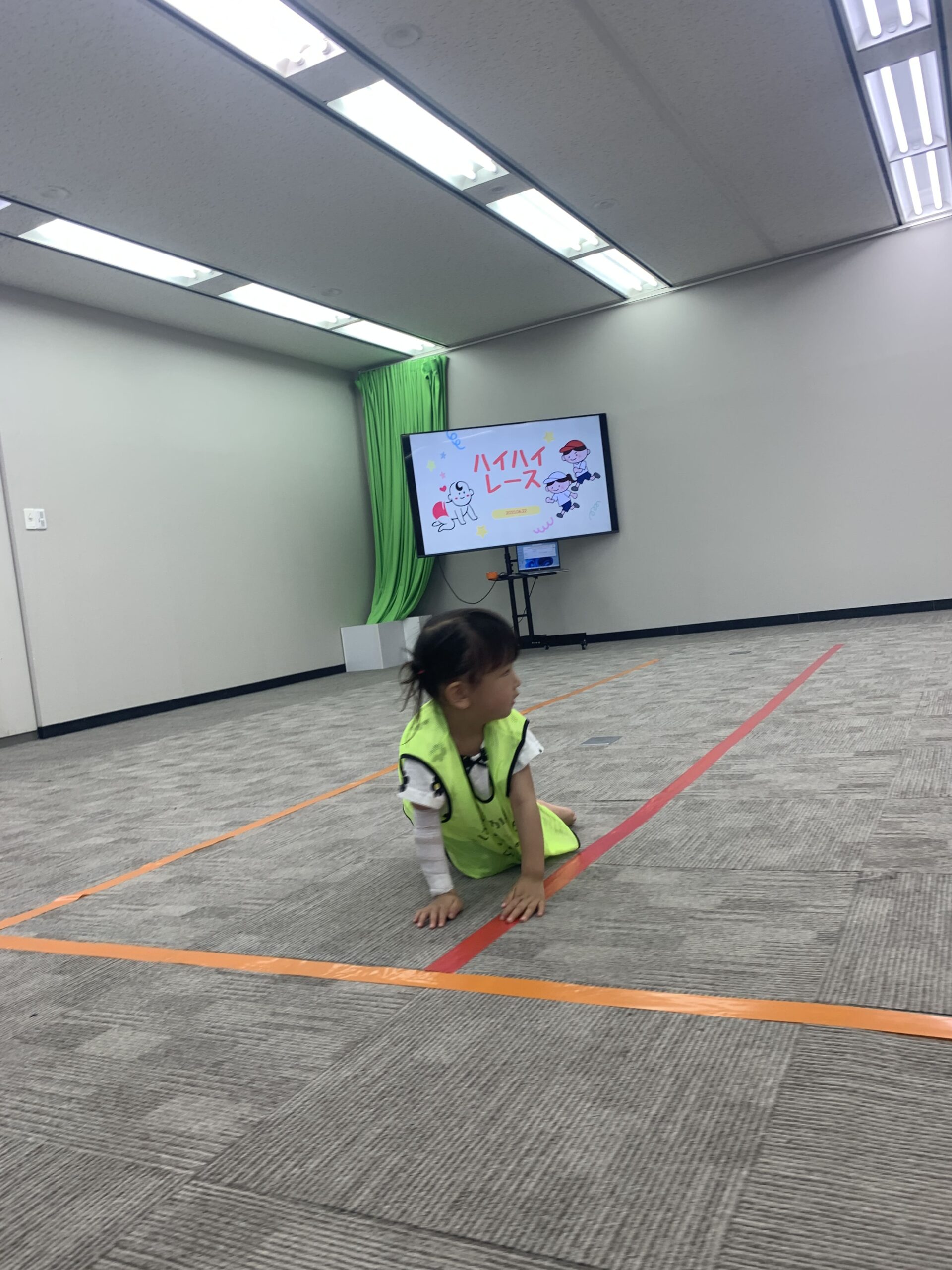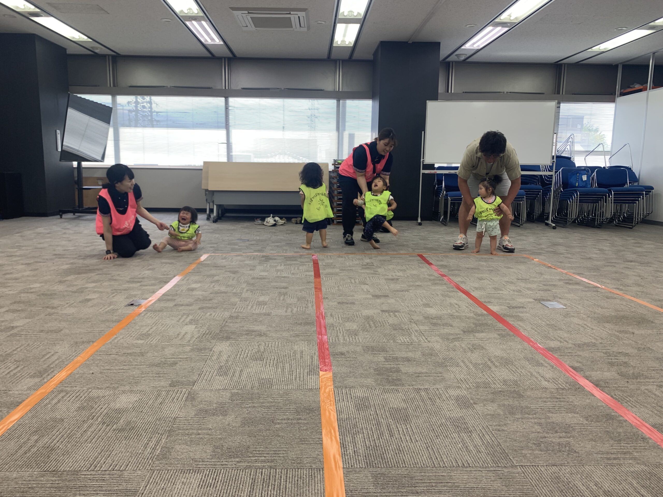 外遊びのあとは、場所を大会議室に移動。広いお部屋にちょっと緊張してしまった様子の子どももいました。場所見知りで涙がぽろり…そんなときも、先生が「一緒にいこう」と優しく手をつなぐと、不安そうな顔が徐々に笑顔に変わっていきます。