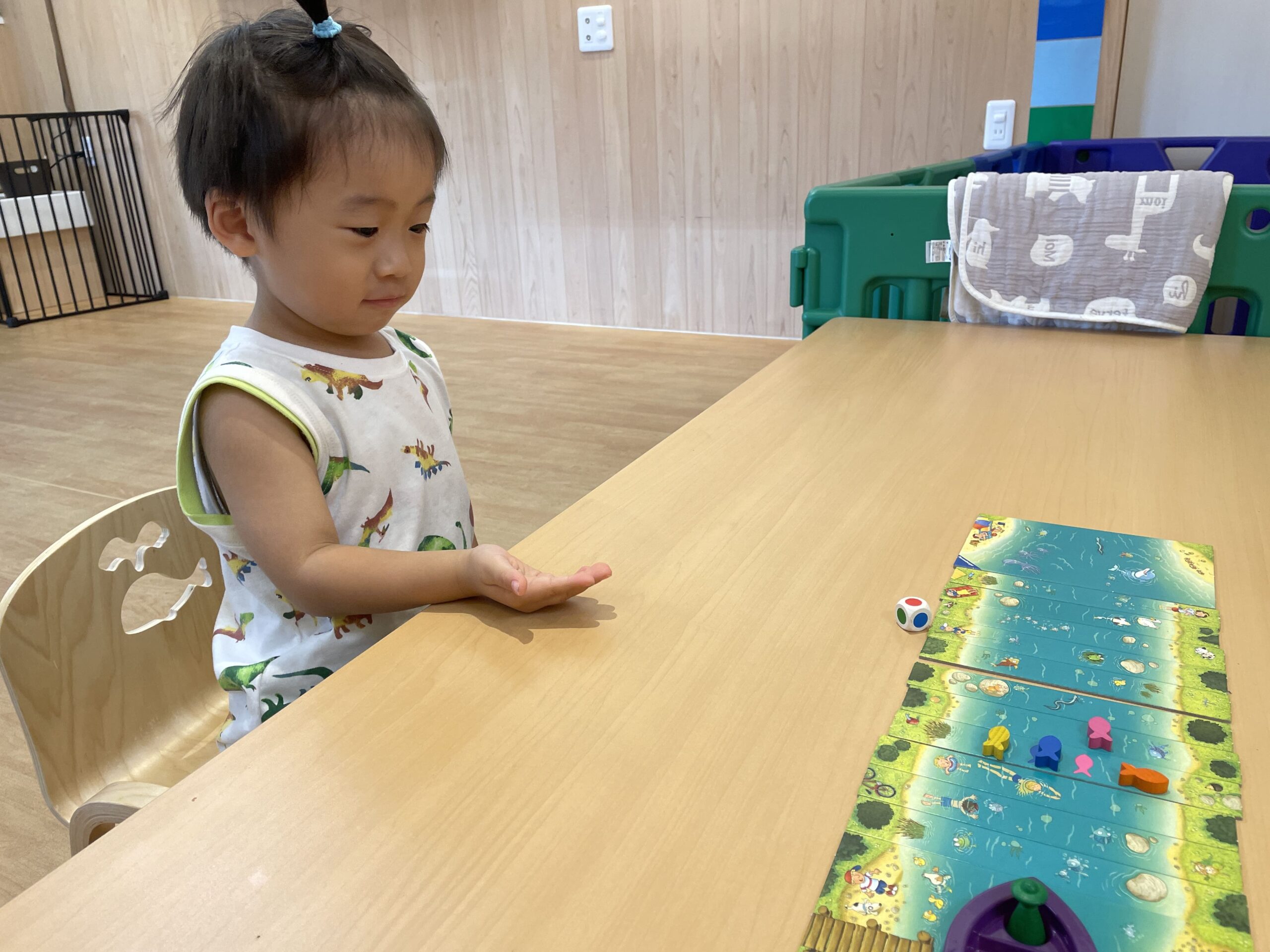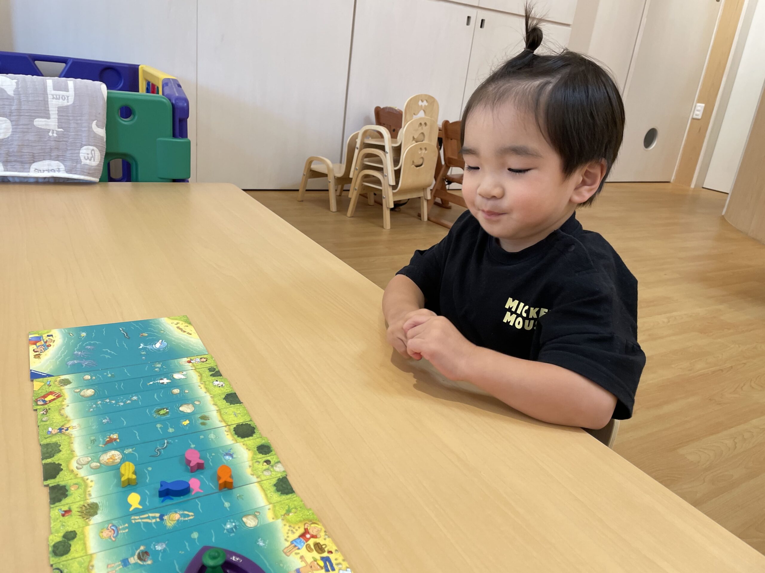 アナログゲームも行いました。このカリキュラムも園の自慢のひとつ。今日は色と形を合わせるゲームでした。最初は戸惑いながらも、「揃えられた!!」と両手を挙げて喜ぶ姿がとてもうれしかったです。こうした遊びを通じて、子どもの集中力や達成感、自分で考える力がゆっくり着実に育っていく様子が見えて、スタッフみんなで喜び合いました。