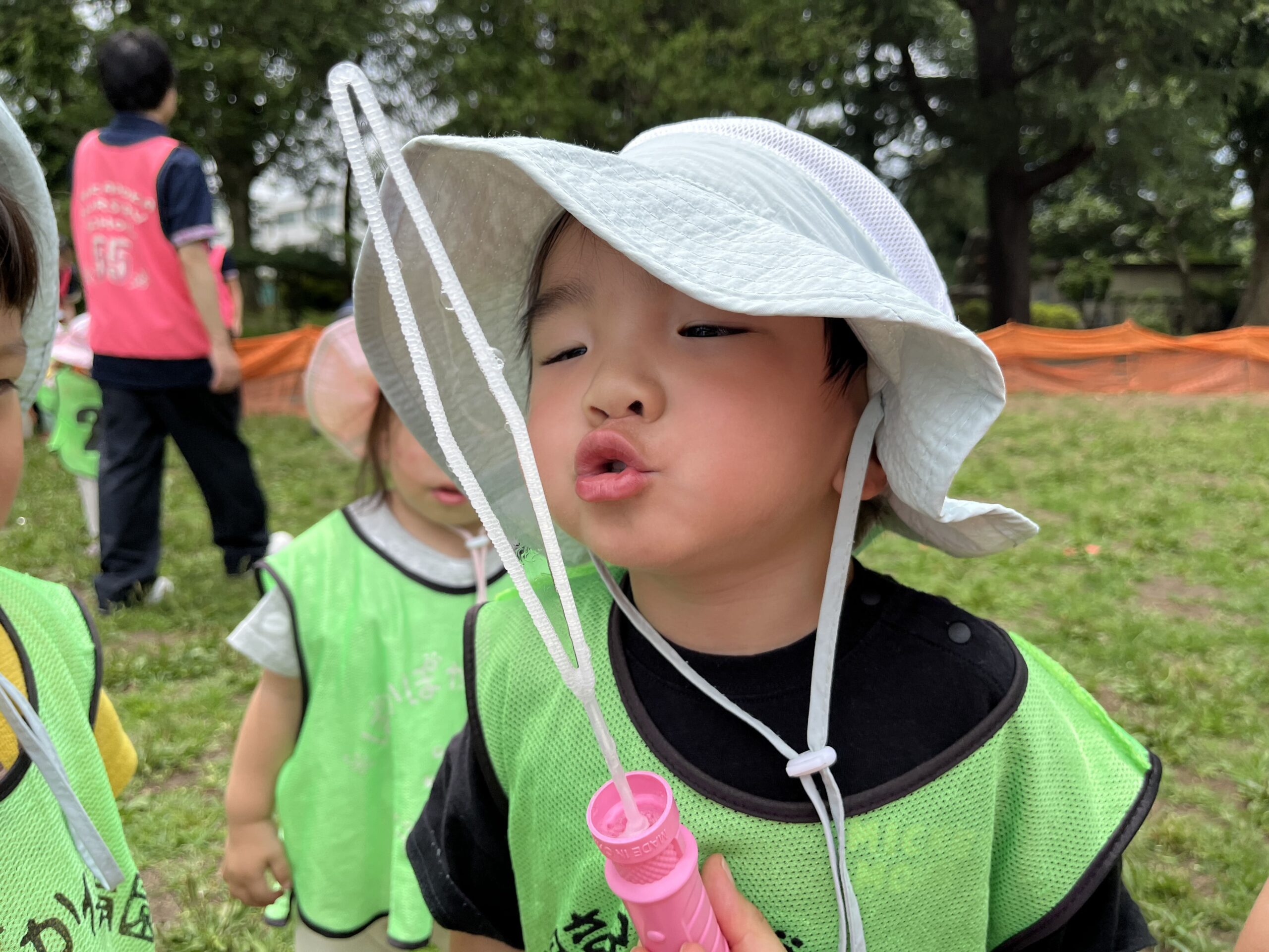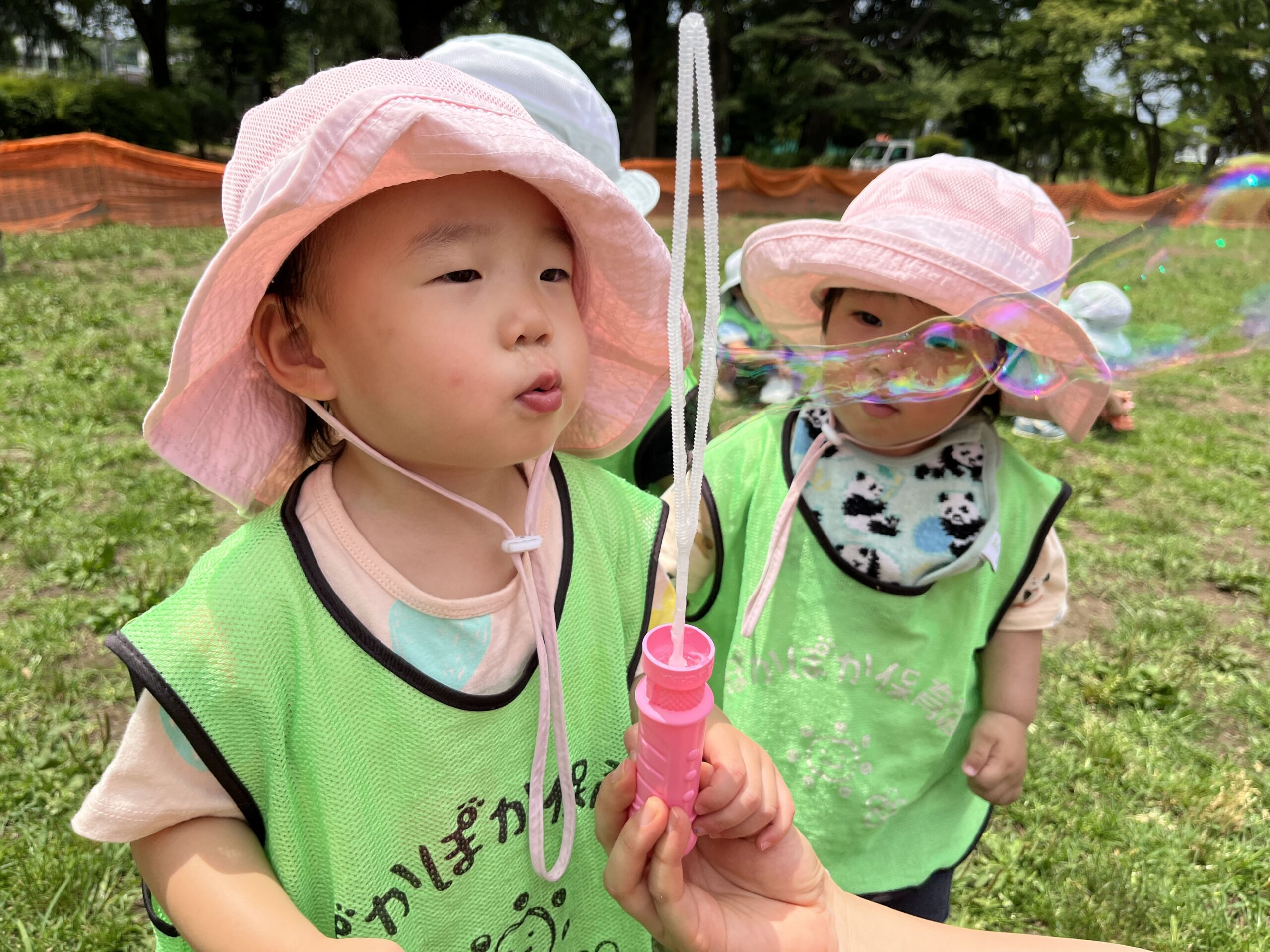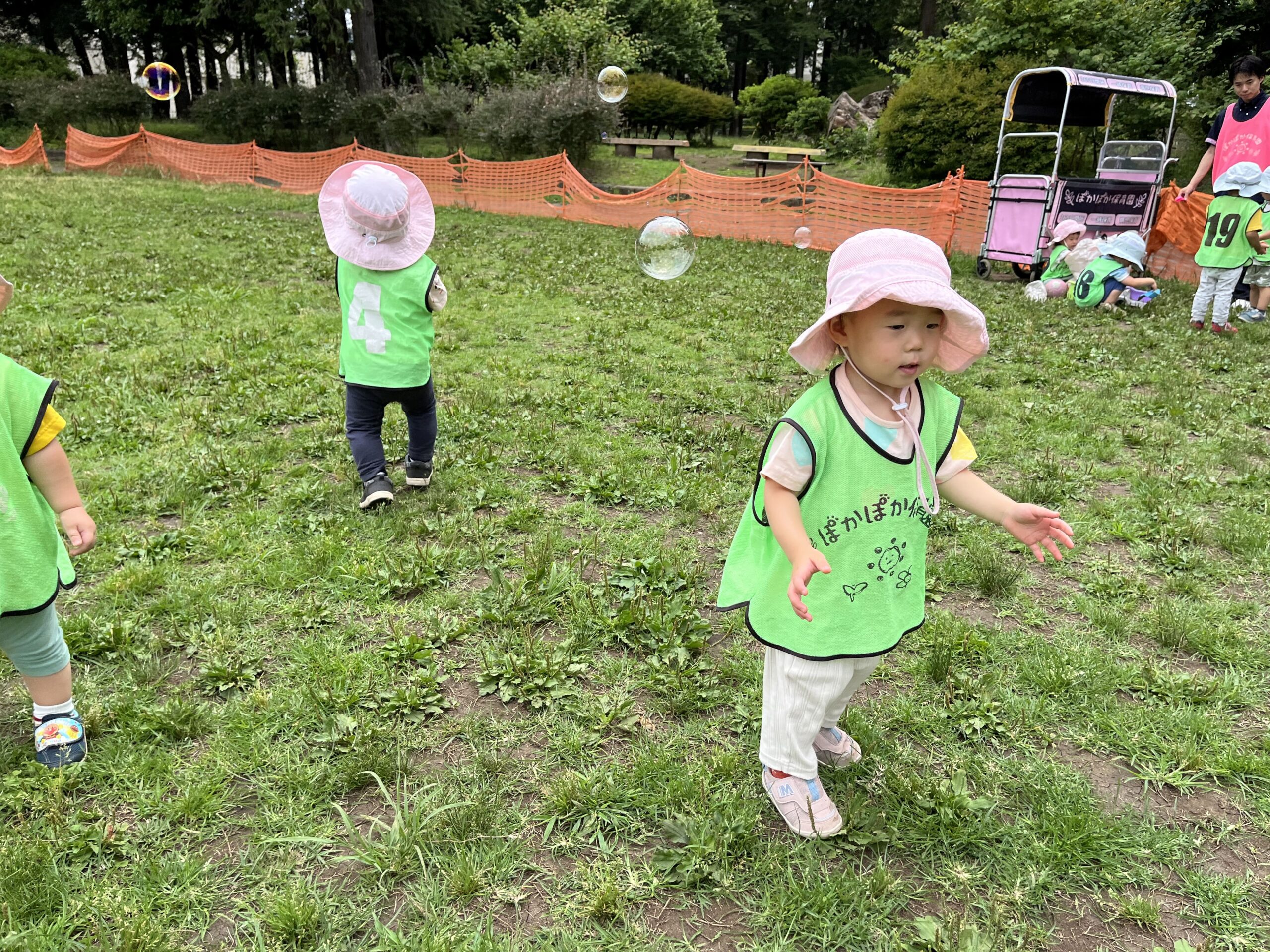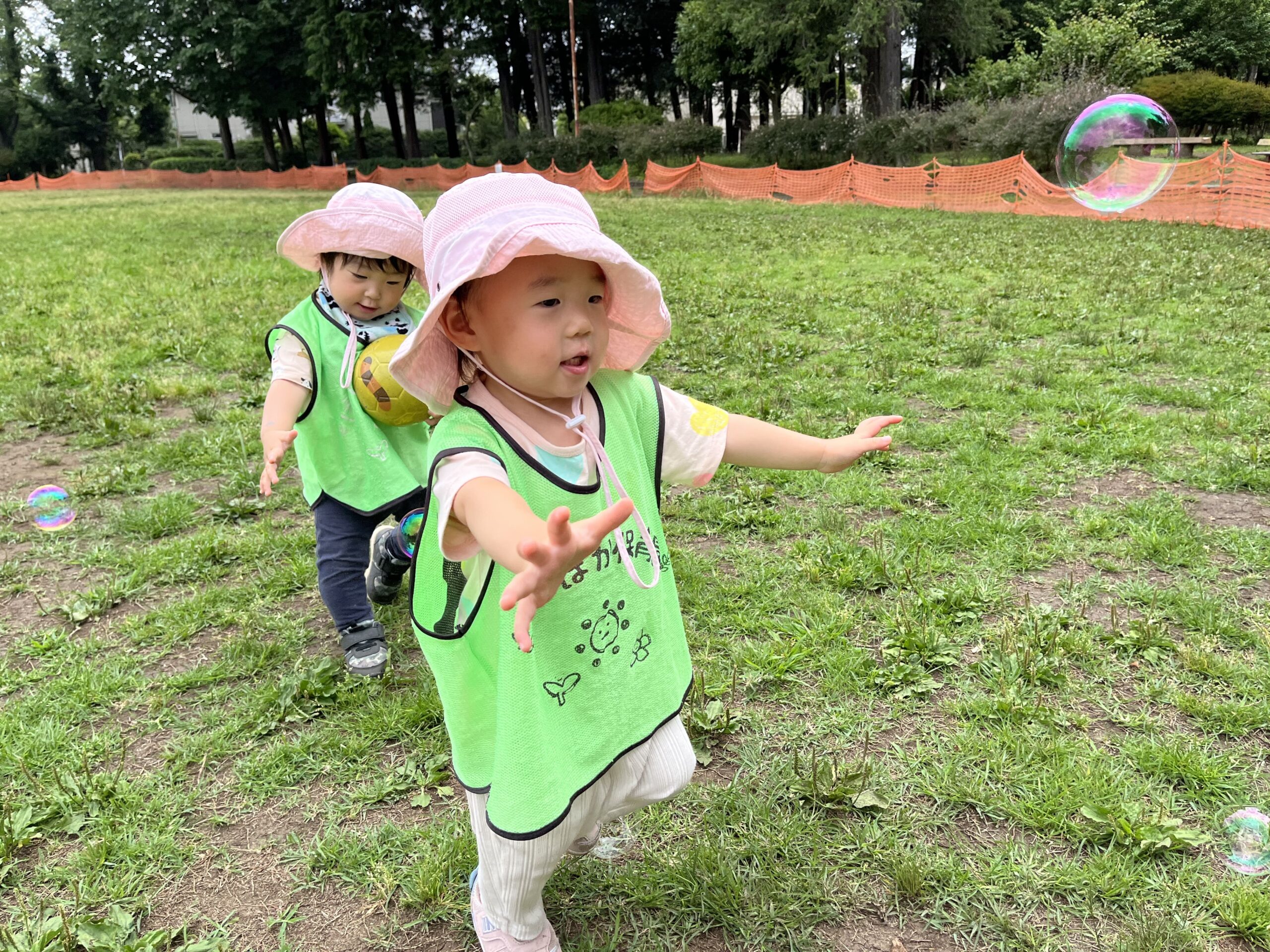 その後は戸外遊びで、公園に到着すると、そこは“シャボン玉の楽園”!先生がシャボン玉を吹くと、ふわふわ~っと空にたくさんのシャボン玉が舞い上がります。それを追いかける子どもたちの笑顔、笑い声が響き渡りました。「きらきらしてる!」「おっきい!」「空までいった!」と大喜び。シャボン玉を一緒に追いかけながら、先生と子どもの心もぐっと近づく、そんな素敵な時間でした。