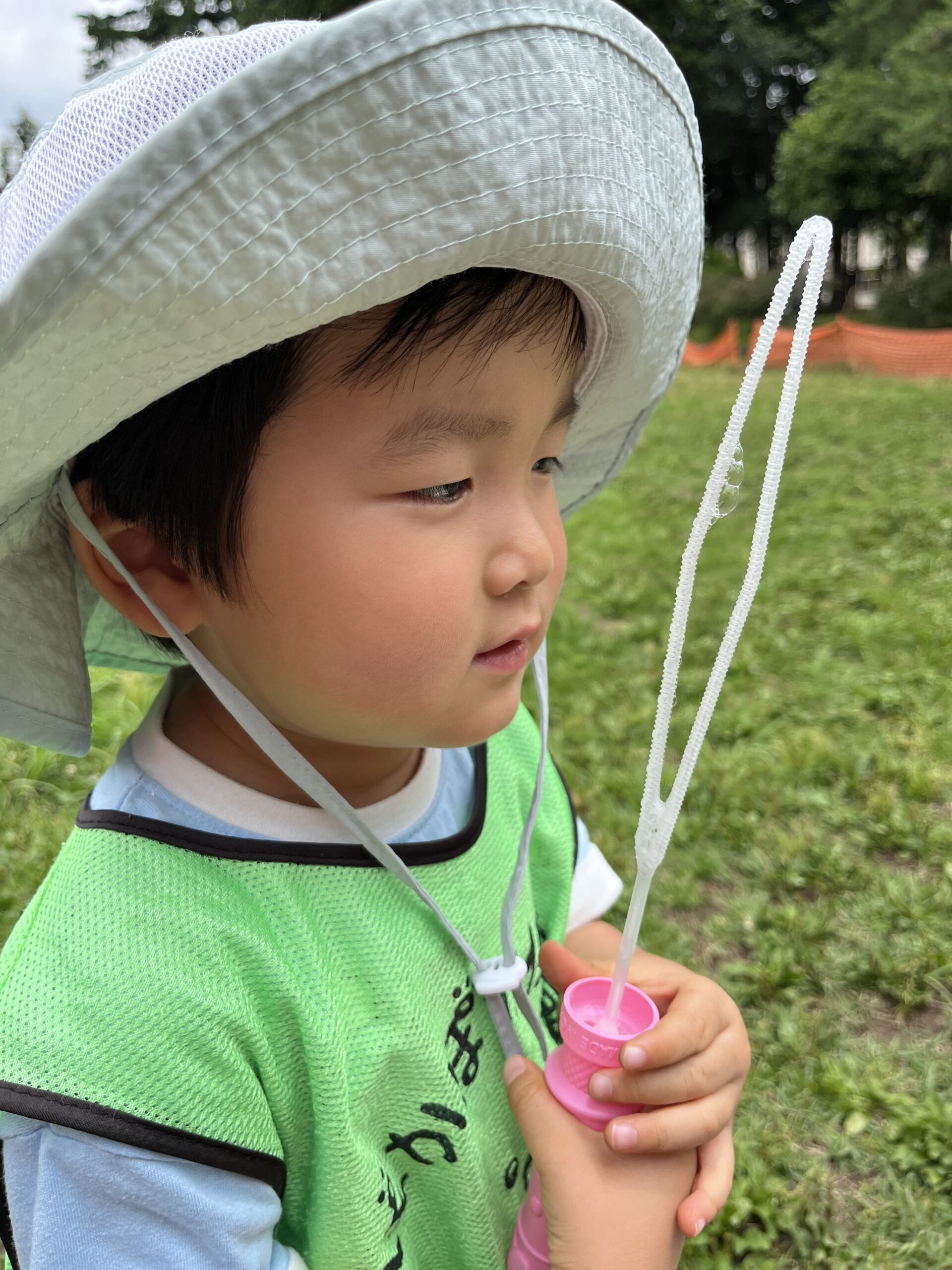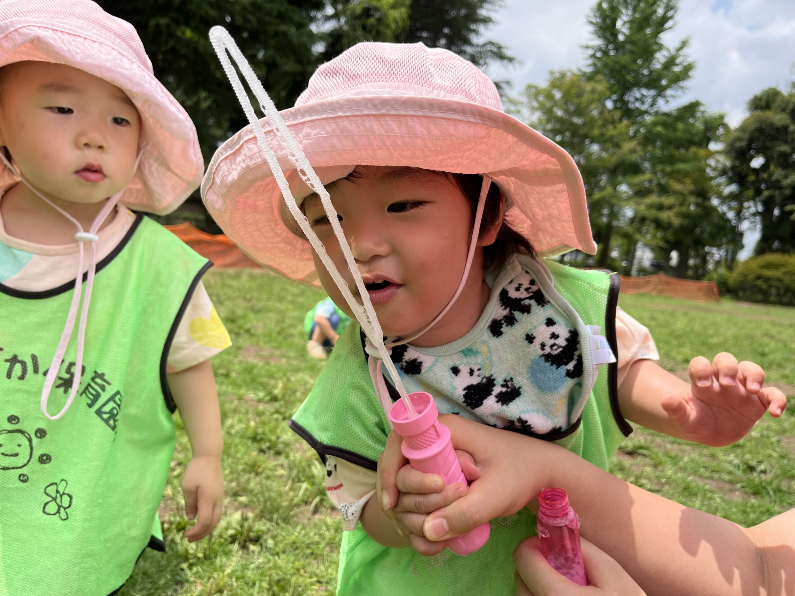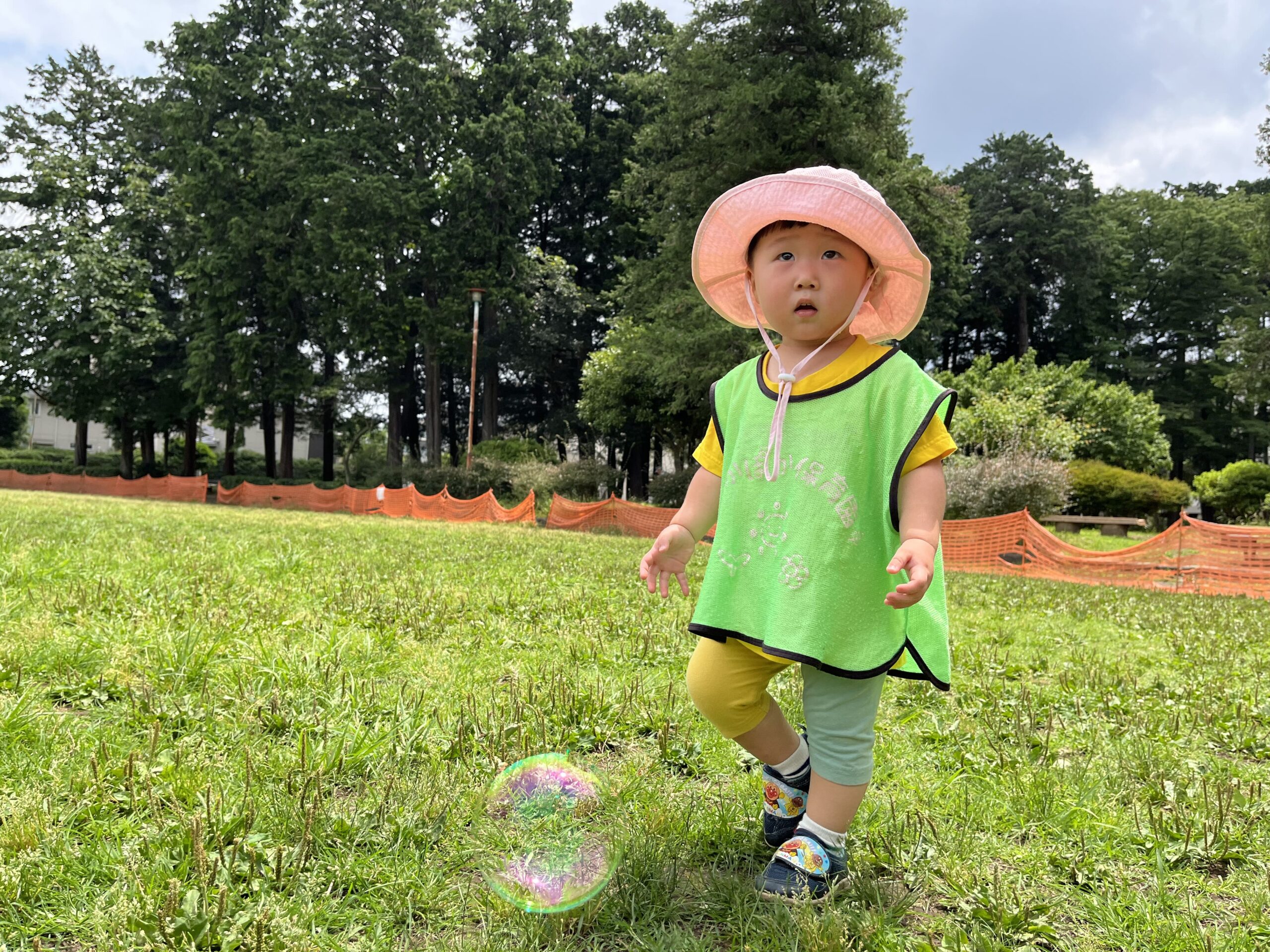 その後は戸外遊びで、公園に到着すると、そこは“シャボン玉の楽園”!先生がシャボン玉を吹くと、ふわふわ~っと空にたくさんのシャボン玉が舞い上がります。それを追いかける子どもたちの笑顔、笑い声が響き渡りました。「きらきらしてる!」「おっきい!」「空までいった!」と大喜び。シャボン玉を一緒に追いかけながら、先生と子どもの心もぐっと近づく、そんな素敵な時間でした。