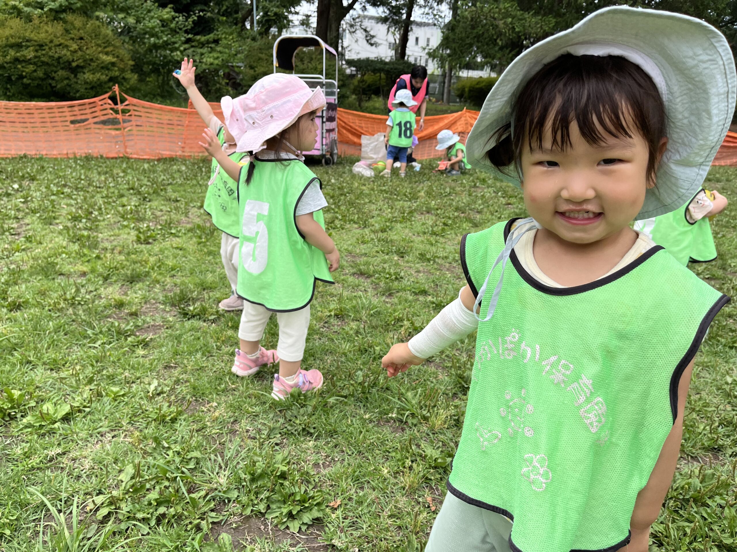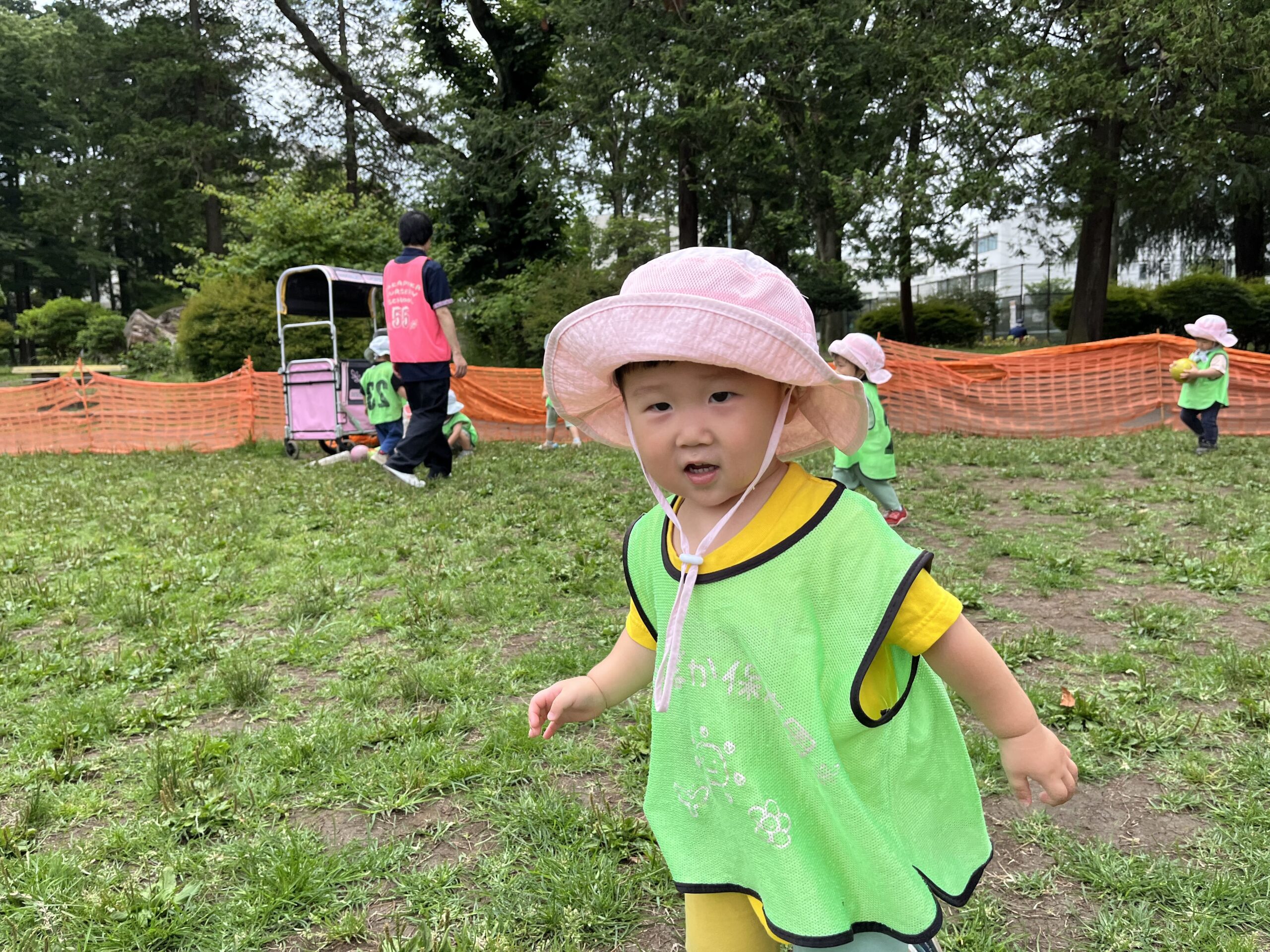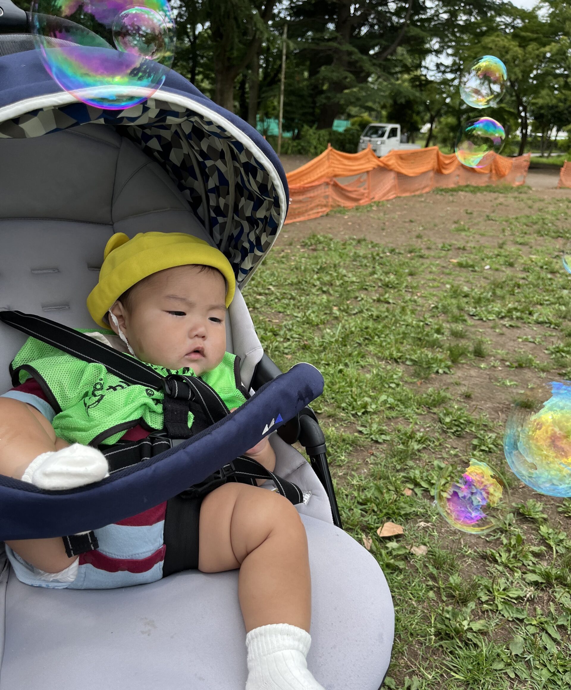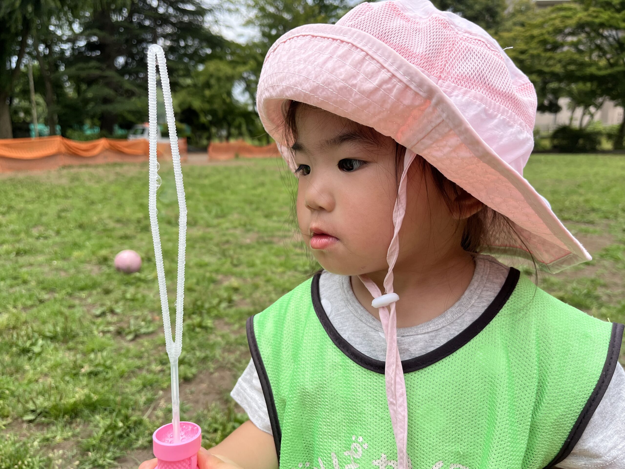 その後は戸外遊びで、公園に到着すると、そこは“シャボン玉の楽園”!先生がシャボン玉を吹くと、ふわふわ~っと空にたくさんのシャボン玉が舞い上がります。それを追いかける子どもたちの笑顔、笑い声が響き渡りました。「きらきらしてる!」「おっきい!」「空までいった!」と大喜び。シャボン玉を一緒に追いかけながら、先生と子どもの心もぐっと近づく、そんな素敵な時間でした。