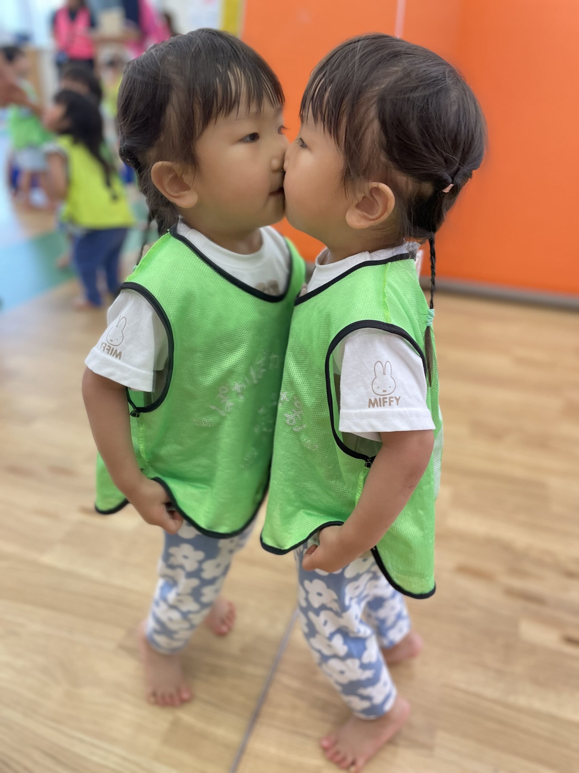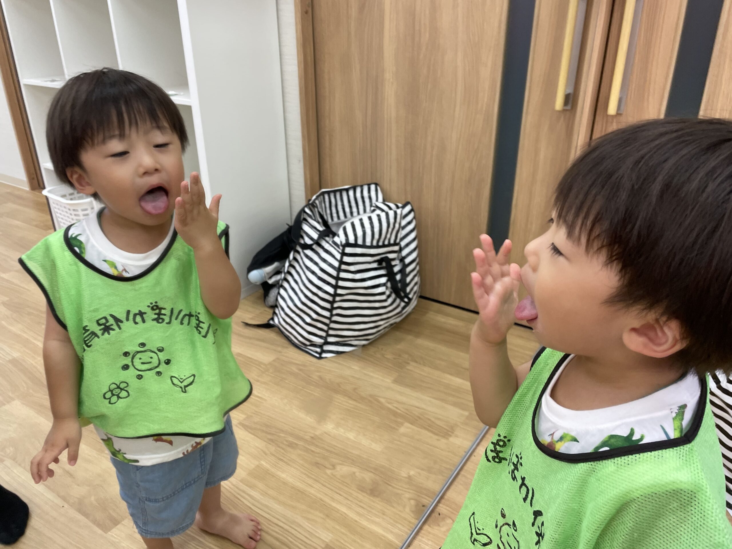 鏡を通じて自分を発見する経験は、自我が芽生える乳幼児期ならではの大切なカリキュラムです。
