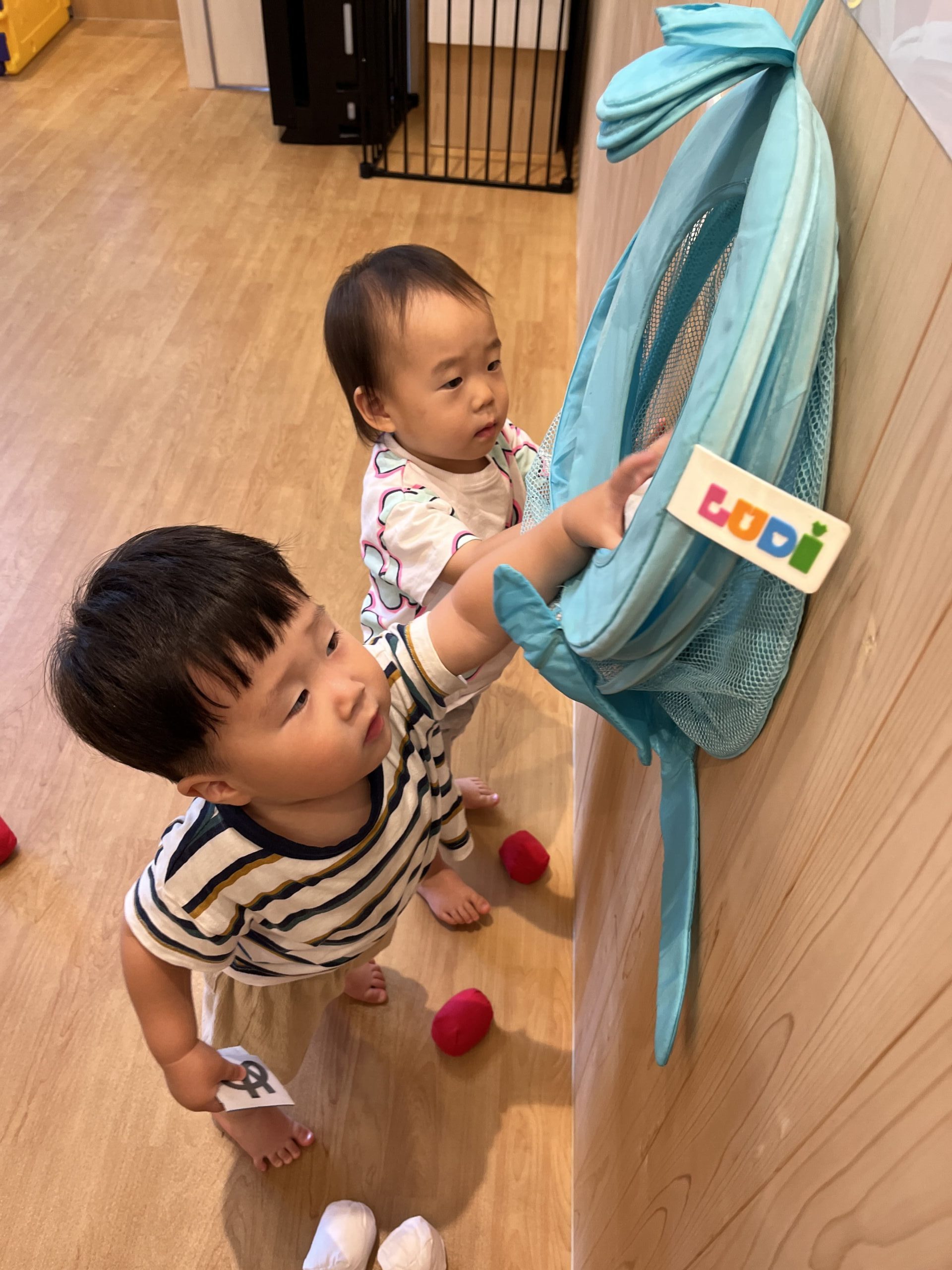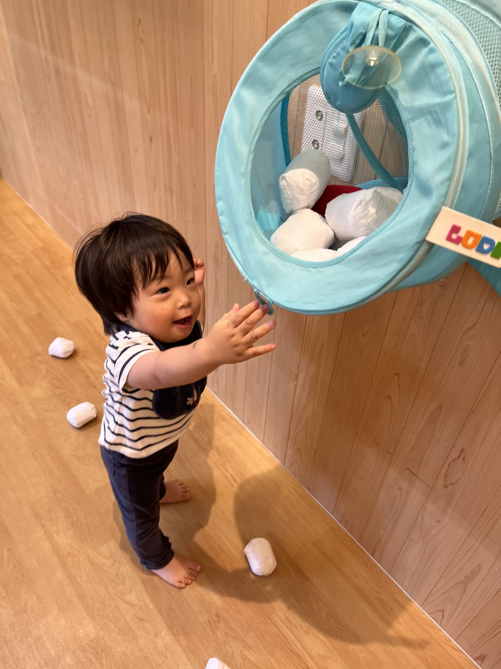 先生が「さあ、たくさん入れてみよう!」と声をかけると、玉をにぎにぎしながらポイッ!それぞれの成長や年齢発達にあわせて玉入れのやり方も工夫しています。特にすてきだったのは、1歳児の子どもが0歳児の男の子のいるラックへ、優しく玉を入れてあげていた場面。0歳の男の子もニコッと嬉しそうな顔を見せ、「ありがとう!」と手をひらひら。