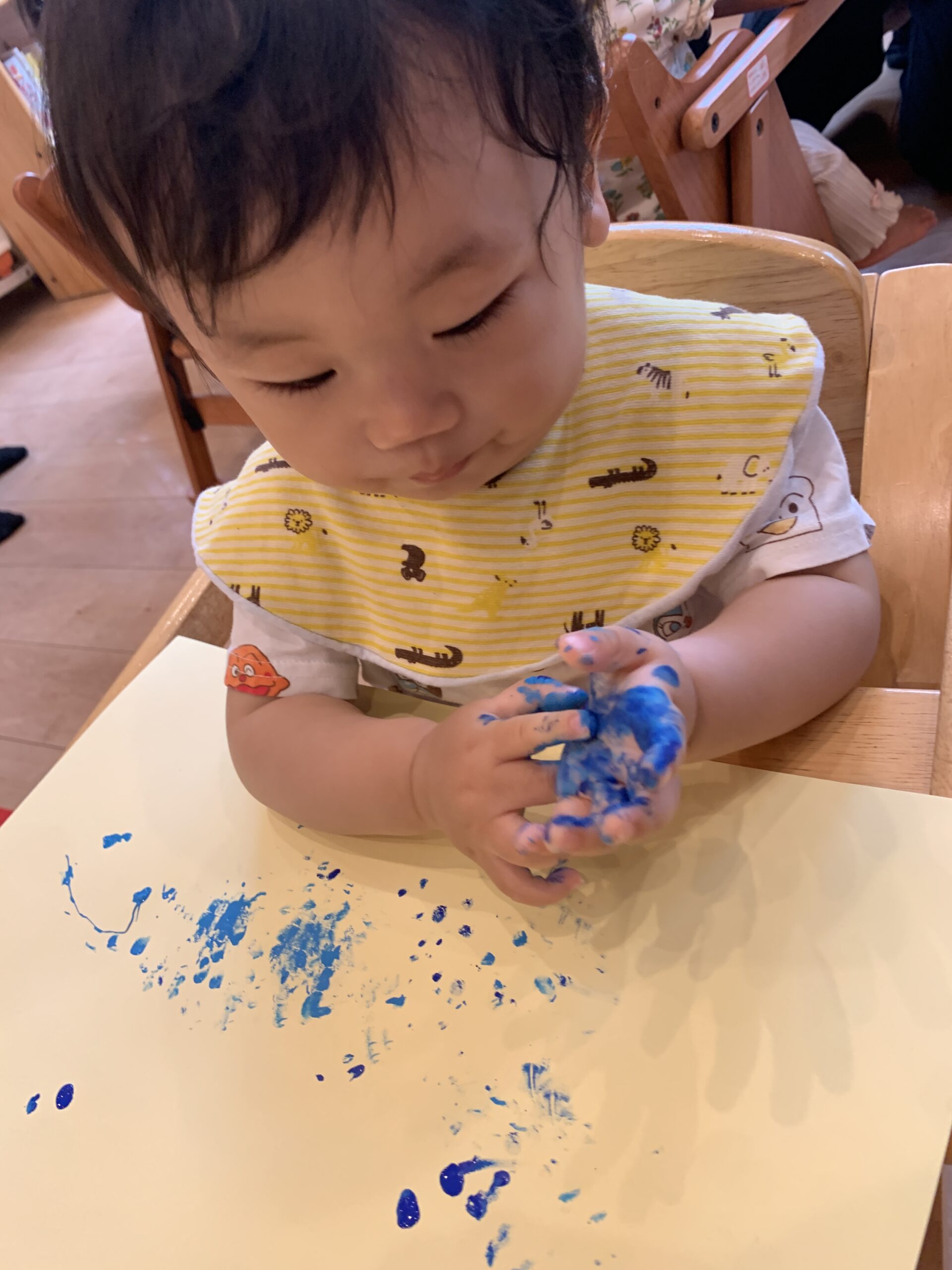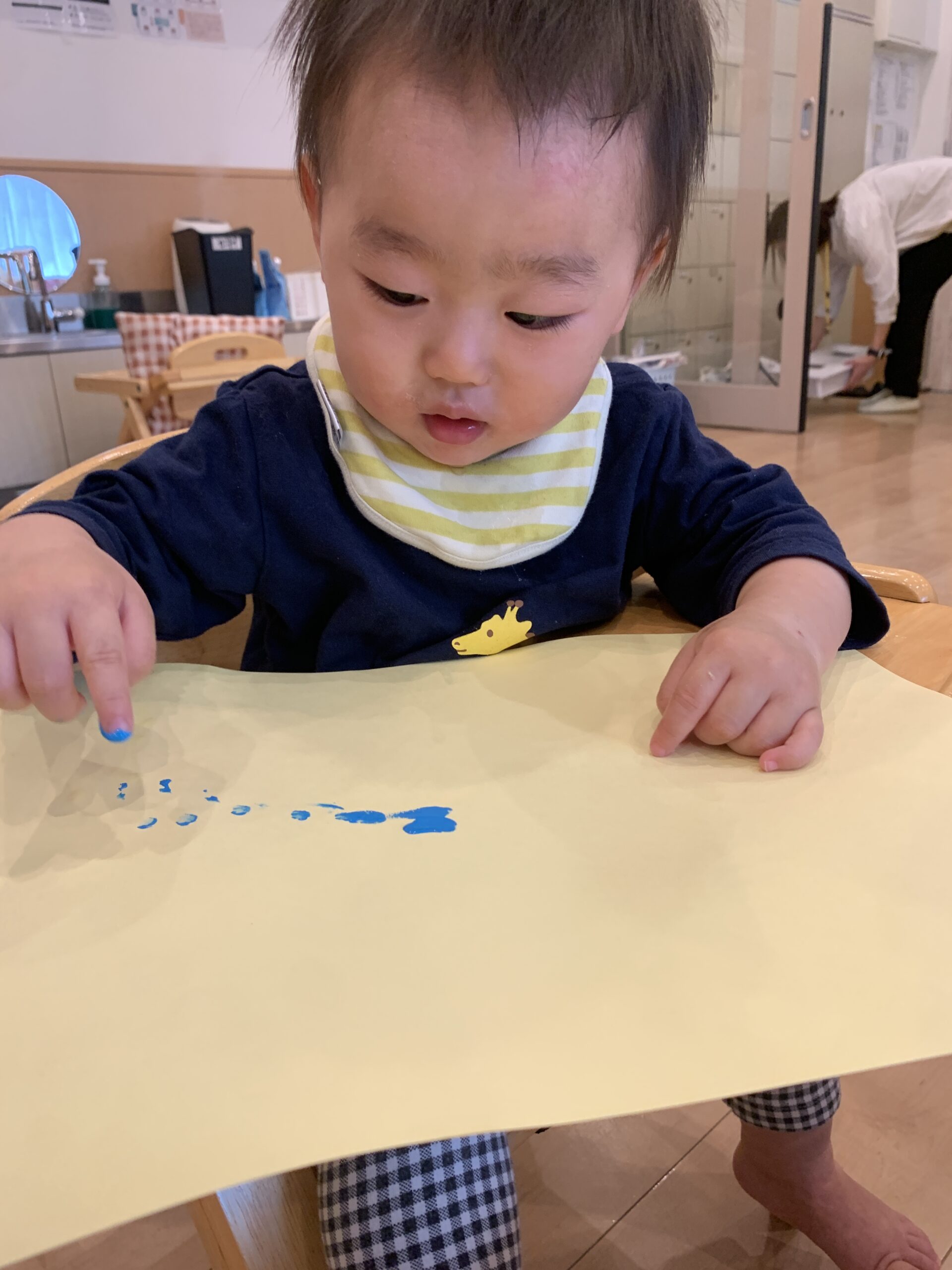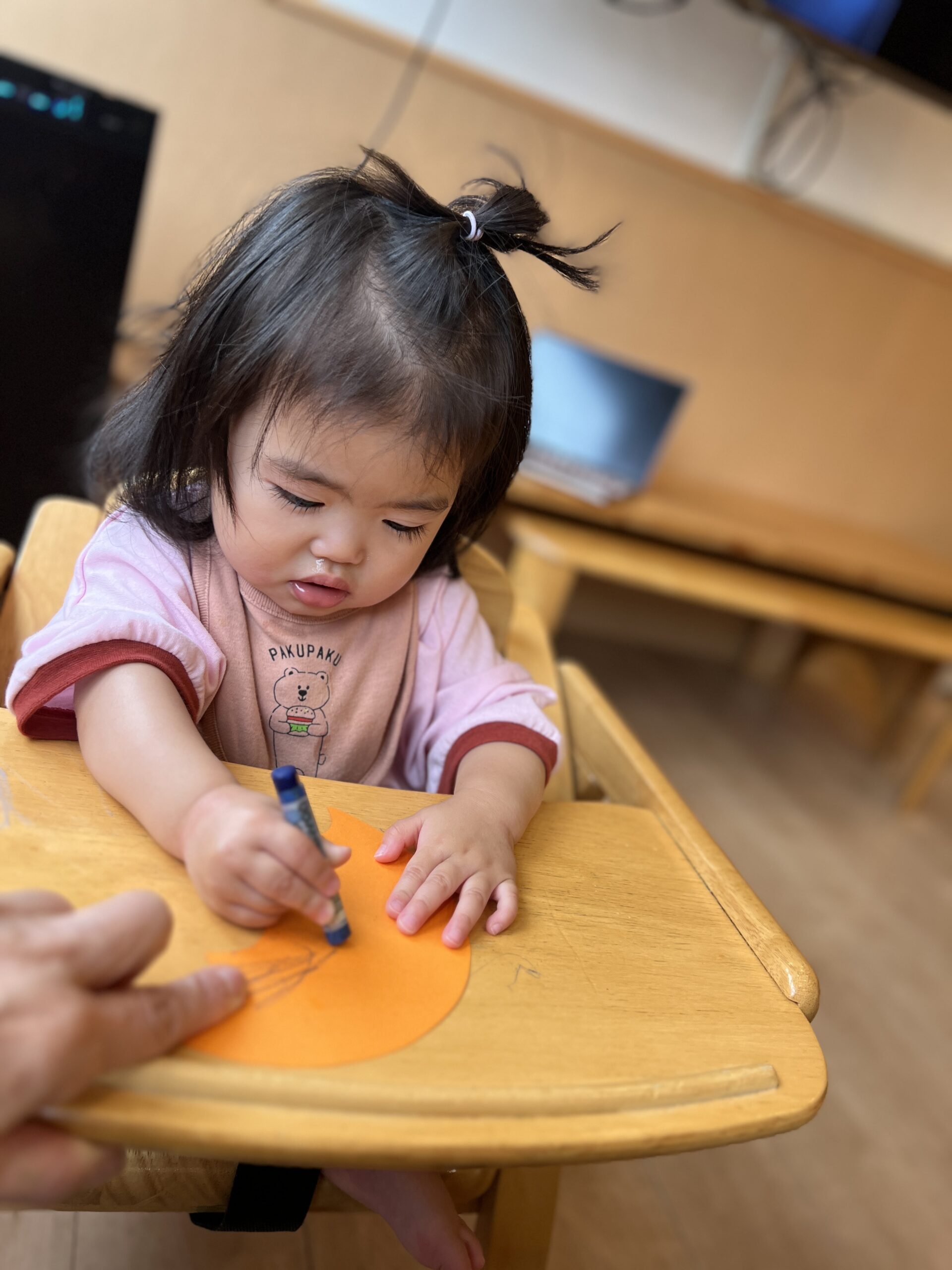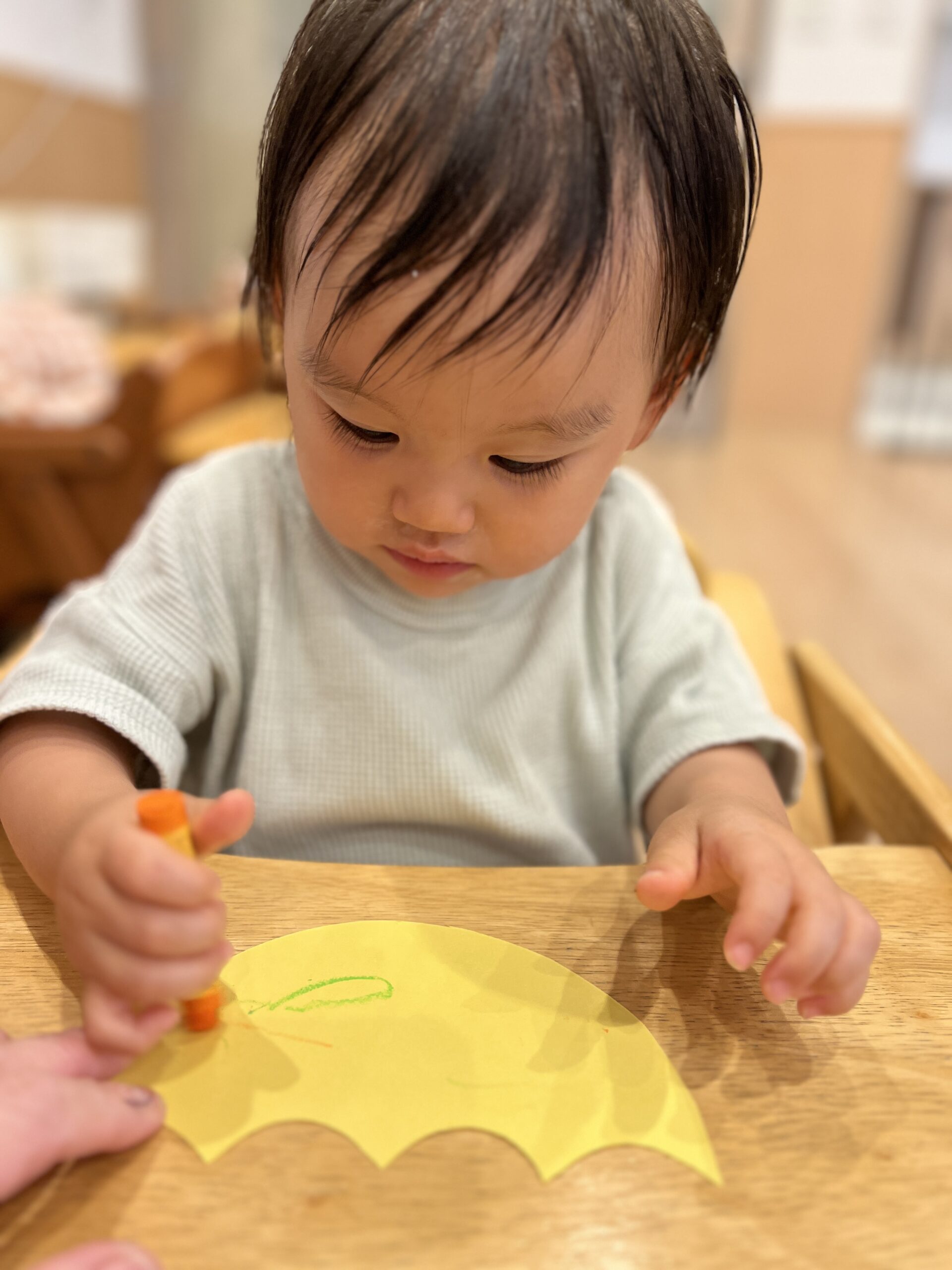 1歳児さんもクレヨンで模様を付けました!クレヨンの握り方が0歳児さんと変わっていますね!手首や指の動きが赤ちゃんの時よりスムーズになり、逆握りではない持ち方になります!