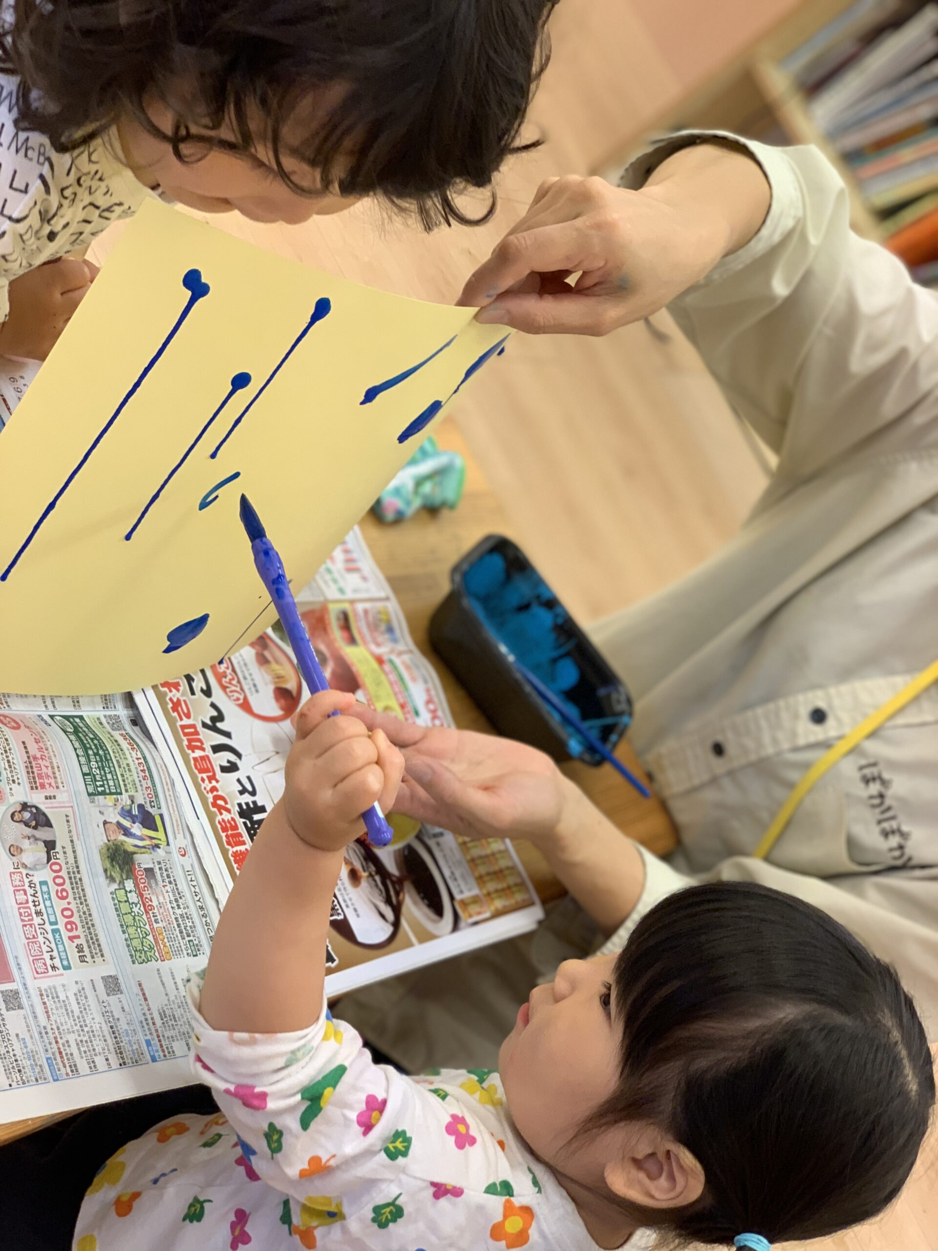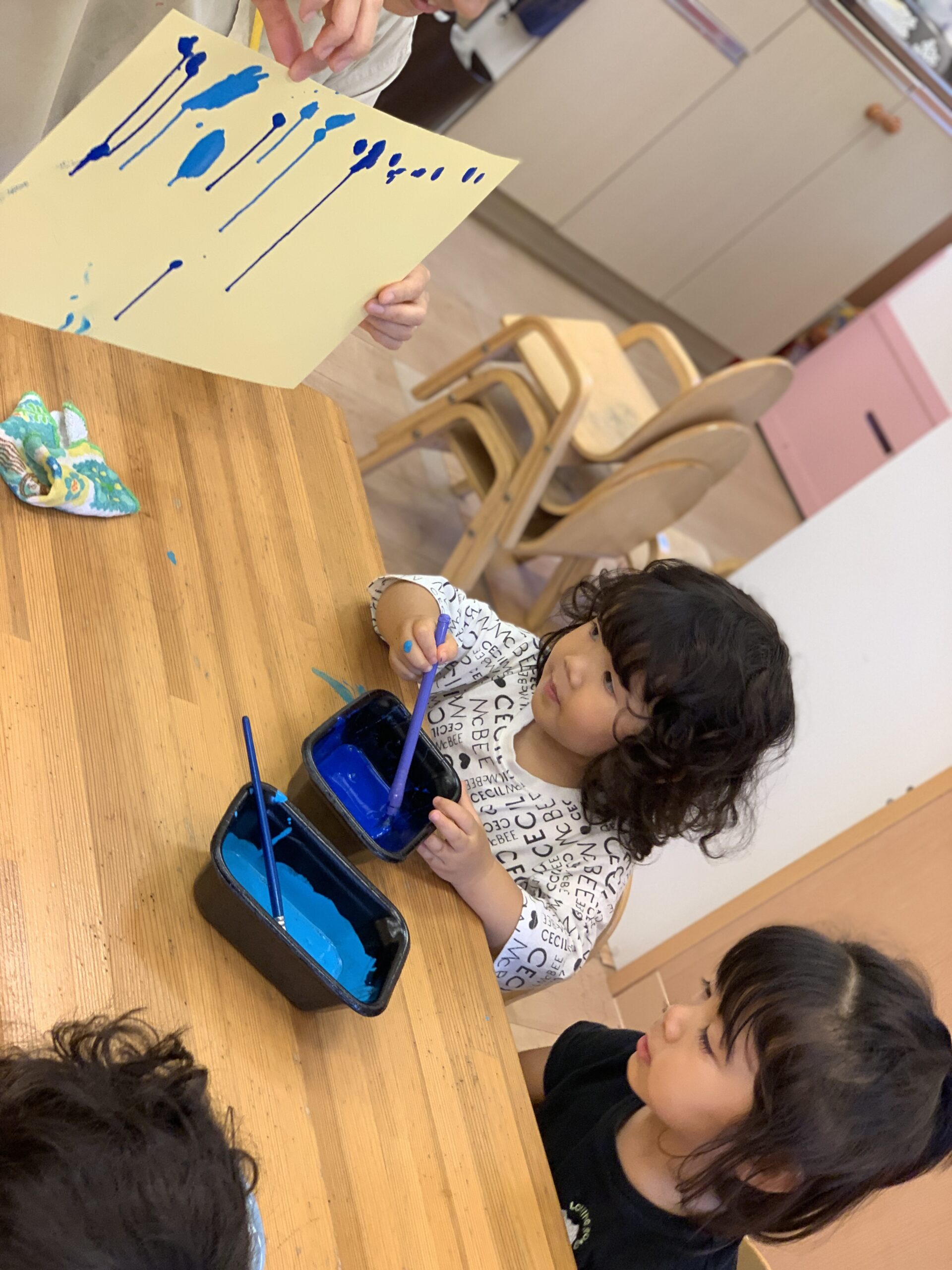 大きいお友達は絵の具の垂らし絵に挑戦です。画用紙の上の方に絵の具を垂らし、画用紙を縦にすると・・・あらあら、絵の具が垂れてきた!!
