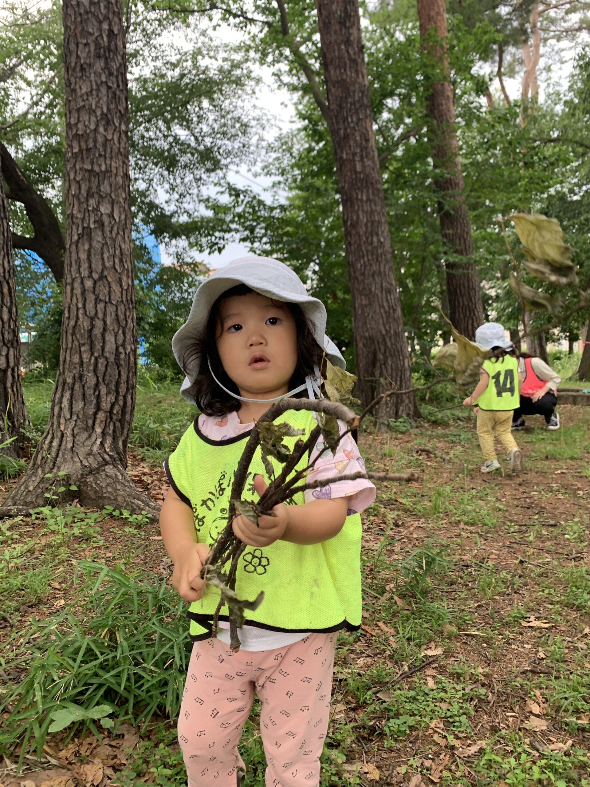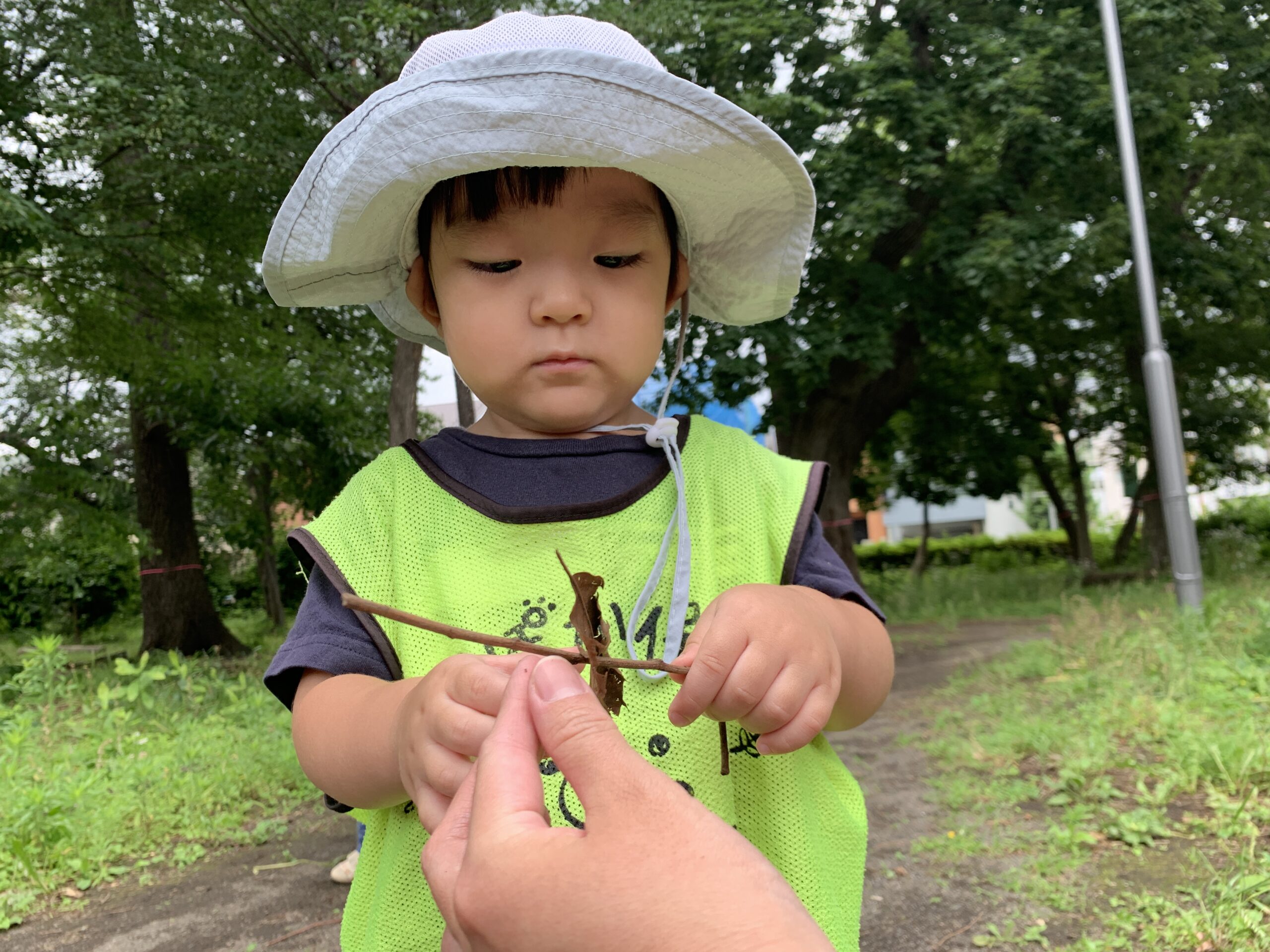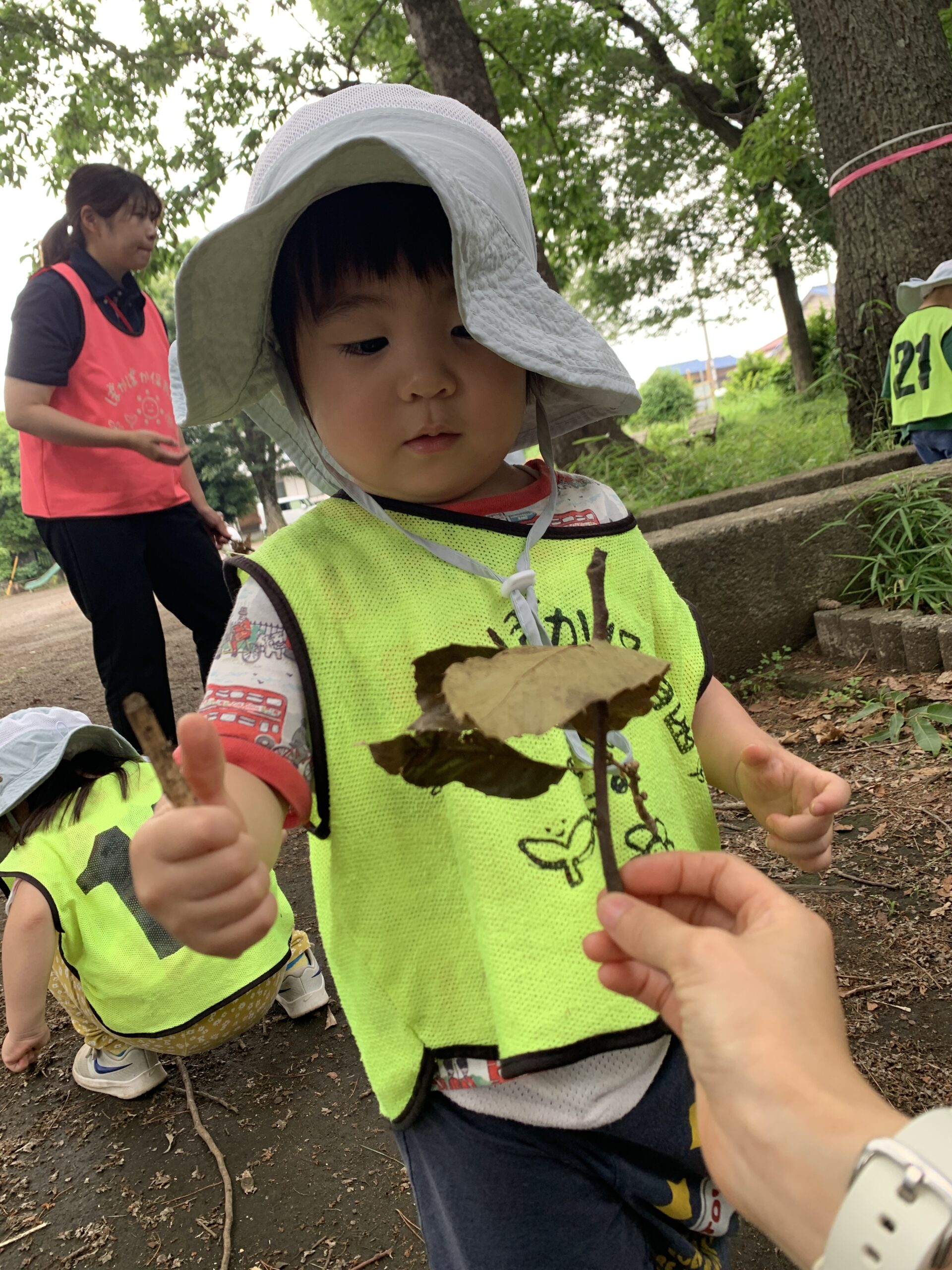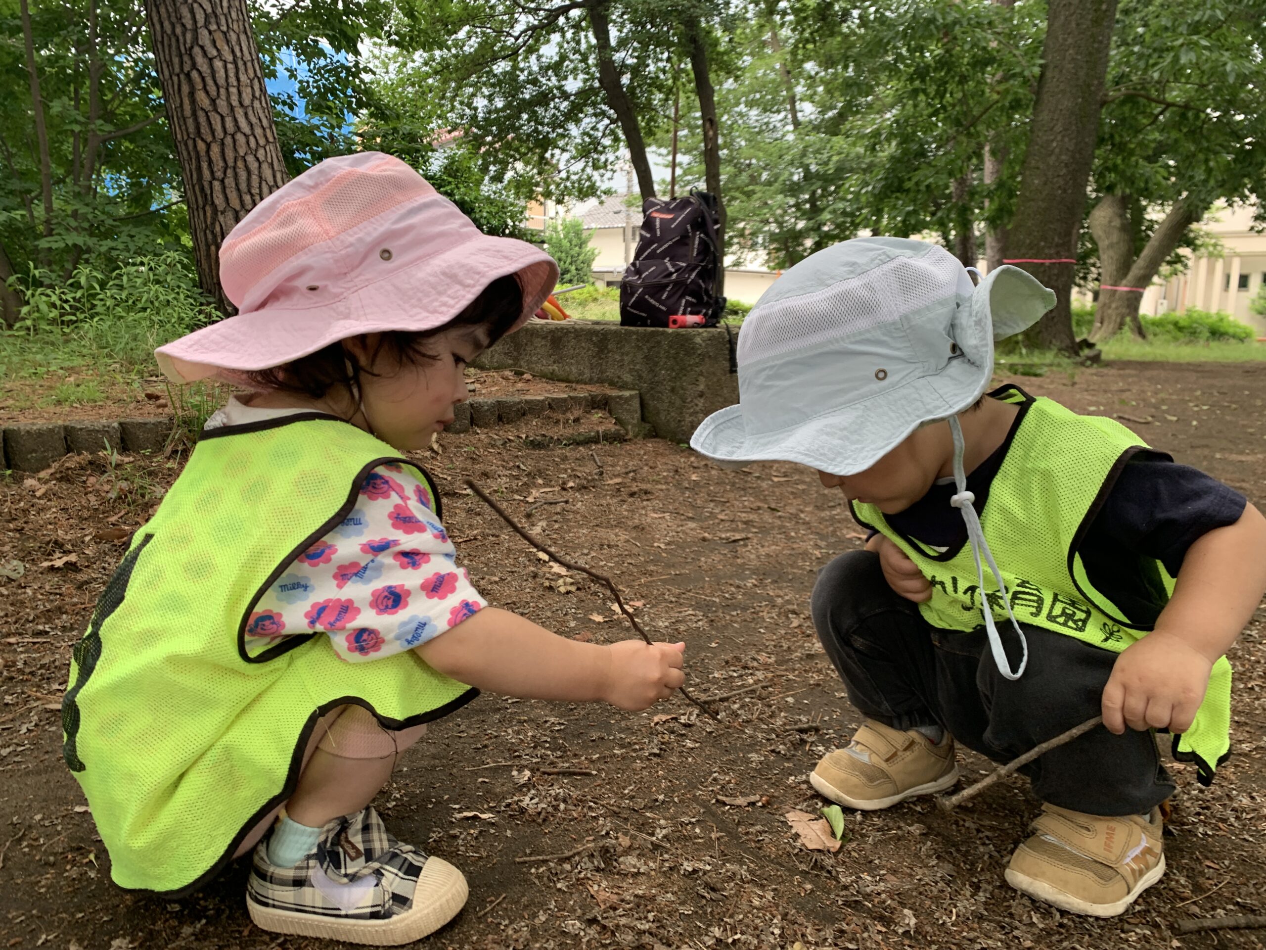 先生が「木の棒と葉っぱを見つけよう」と言うと、