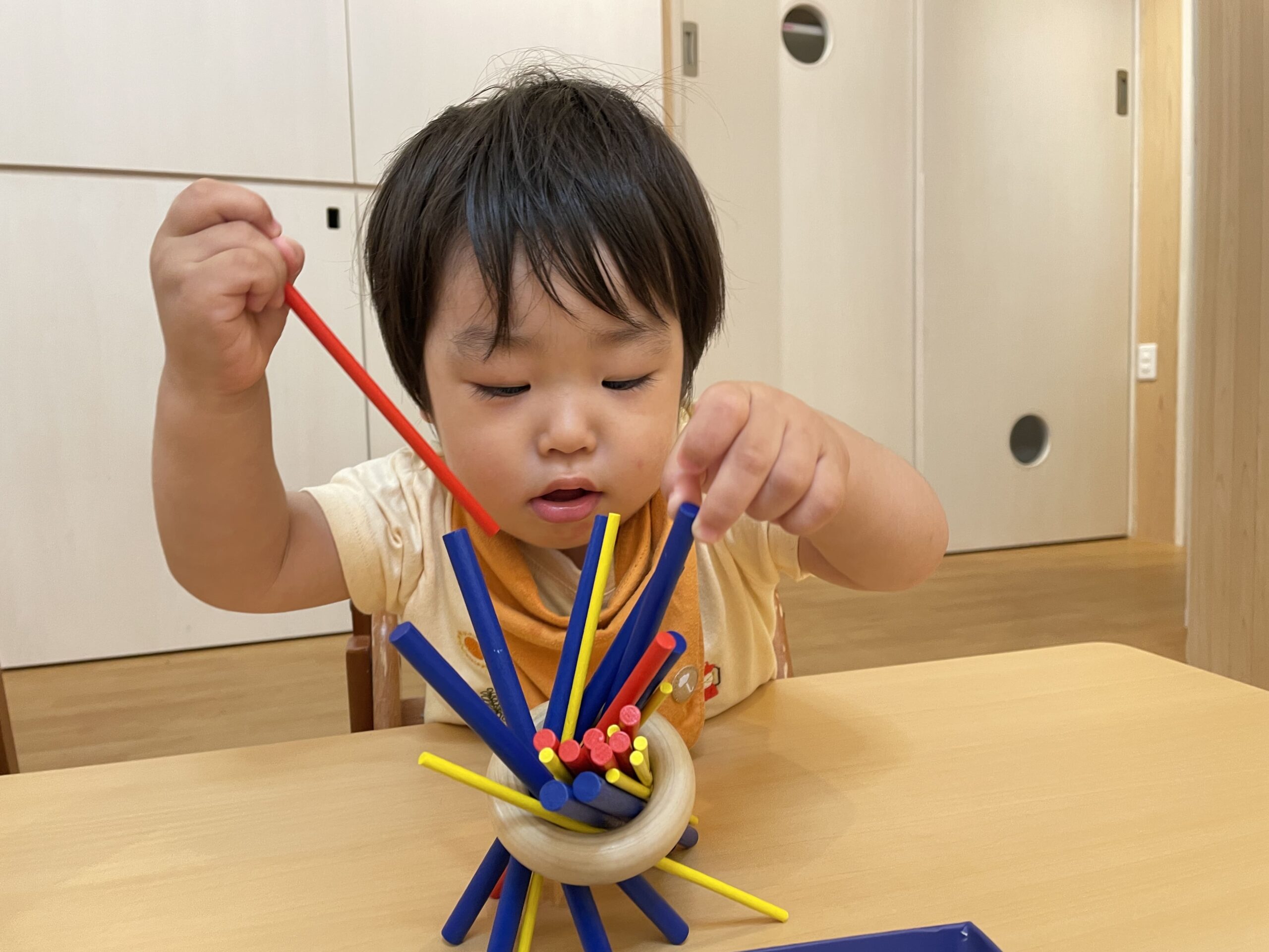 「そーっとそーっと…」と棒抜きに挑戦する子どもたち。0~2歳の子どもの発達段階に合わせた個別対応ができるのも、小規模保育事業ならではの魅力ですね。ゲームを通して、自分で考えたり、できた!と喜ぶ姿がたくさん見られました。