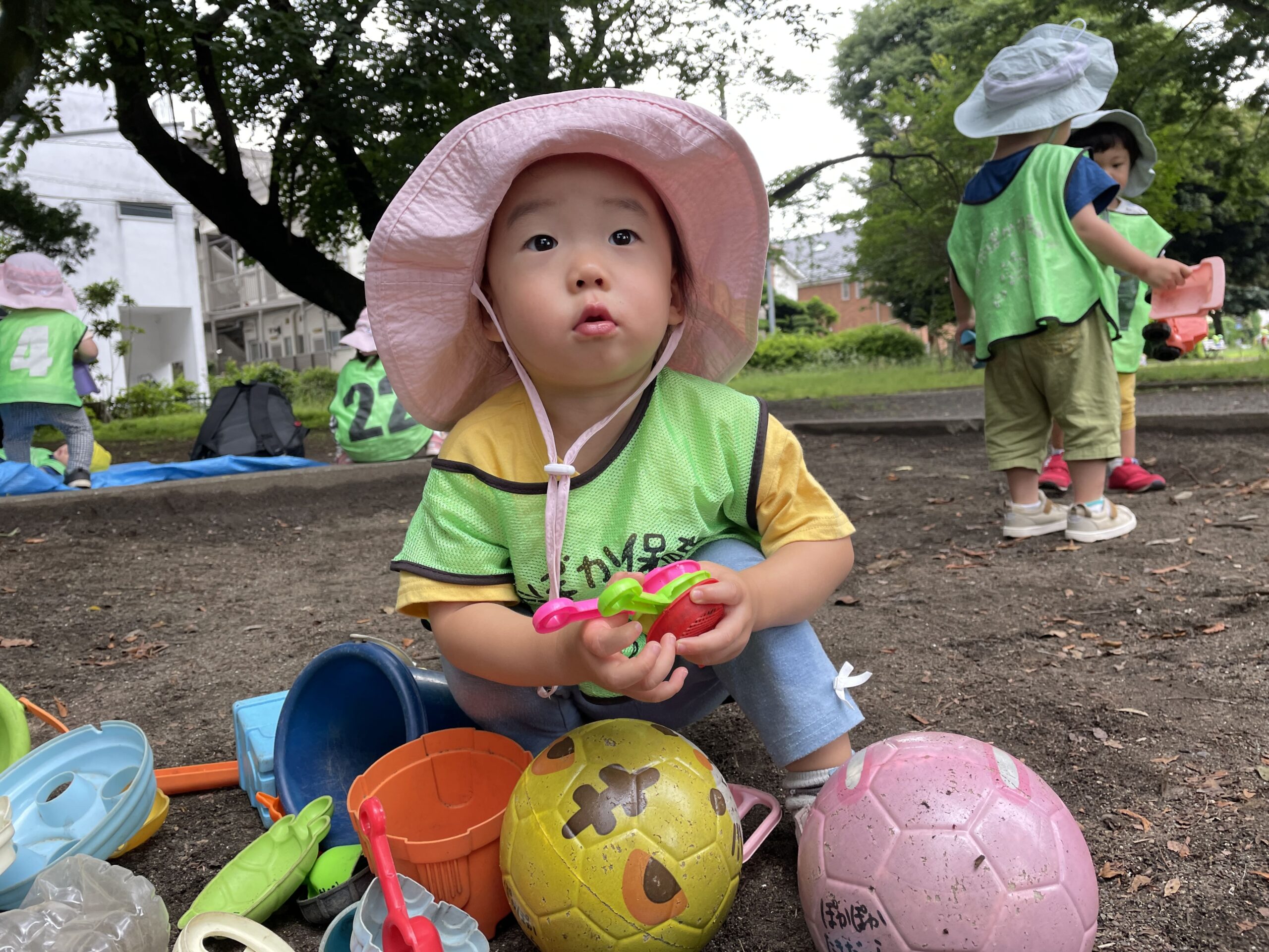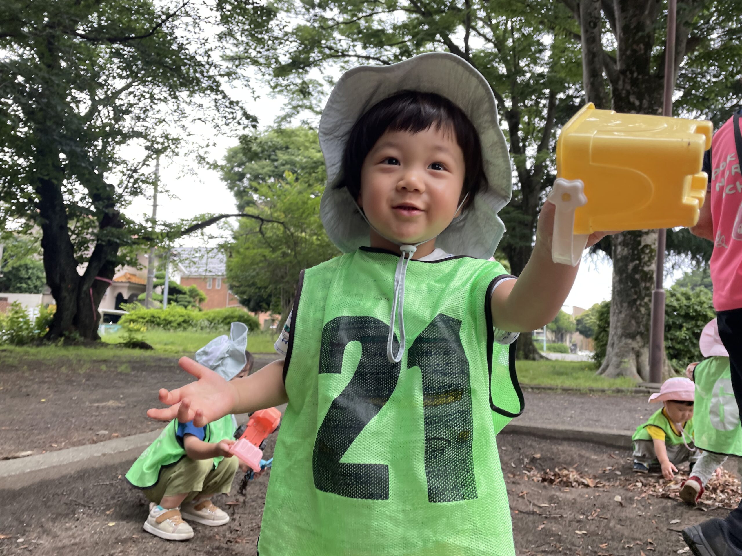 公園では、大人気のカラフルなスコップやバケツ、ダンプカーで思い思いに砂あそび。木の実を拾ってお料理ごっこをしたり、お友だちと一緒に大きなお山づくりにもチャレンジしました。