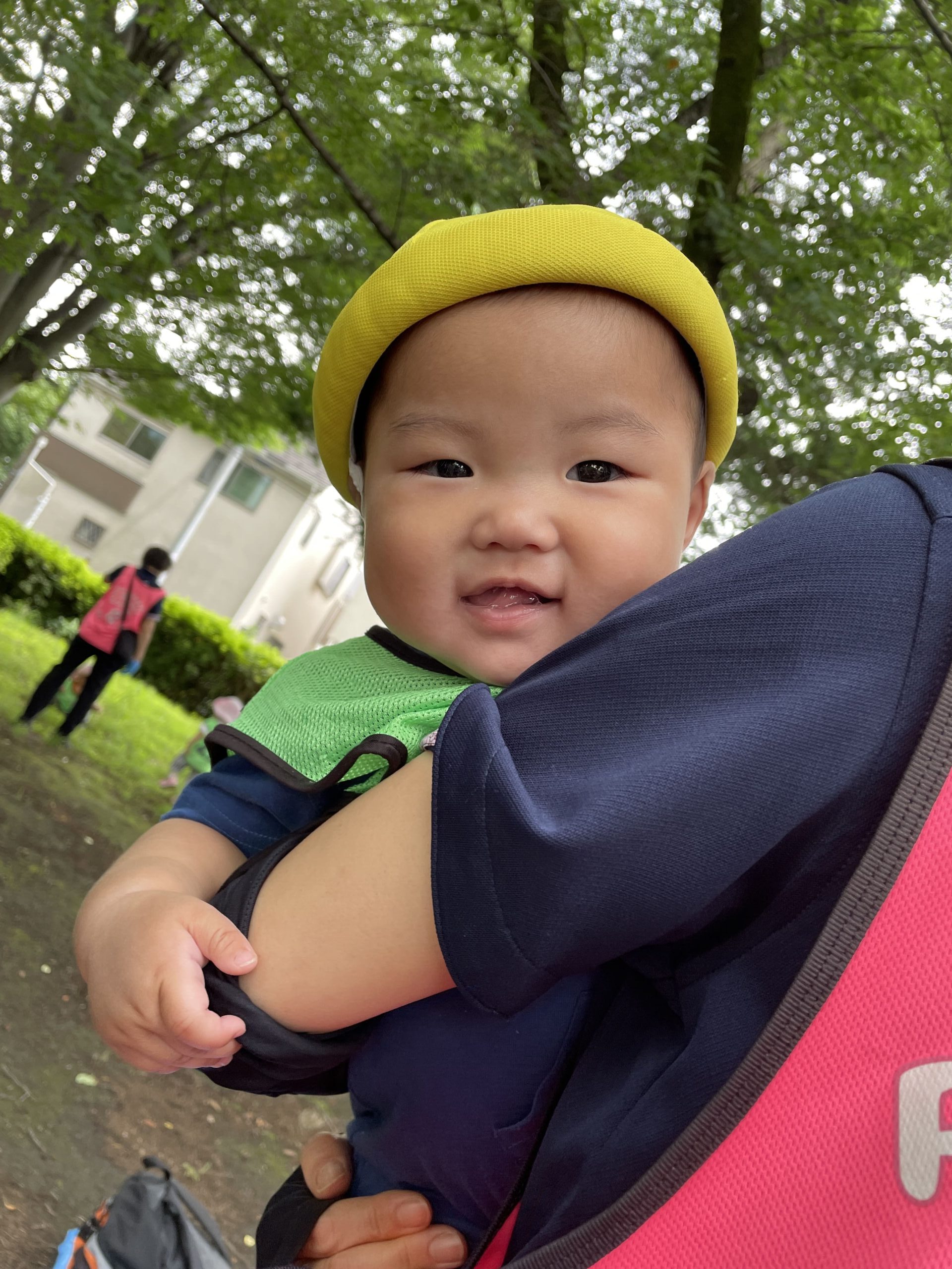 音楽遊びのあとは、お散歩ロープをしっかり持っていつもの公園へ。みんな上手にロープにつかまり歩けるようになりました。遊ぶ前には虫よけスプレーでしっかり防虫対策。「じっとしててね」と伝えると、みんなとてもおとなしく腕や足を差し出してくれ、お利口さんで感心しました。