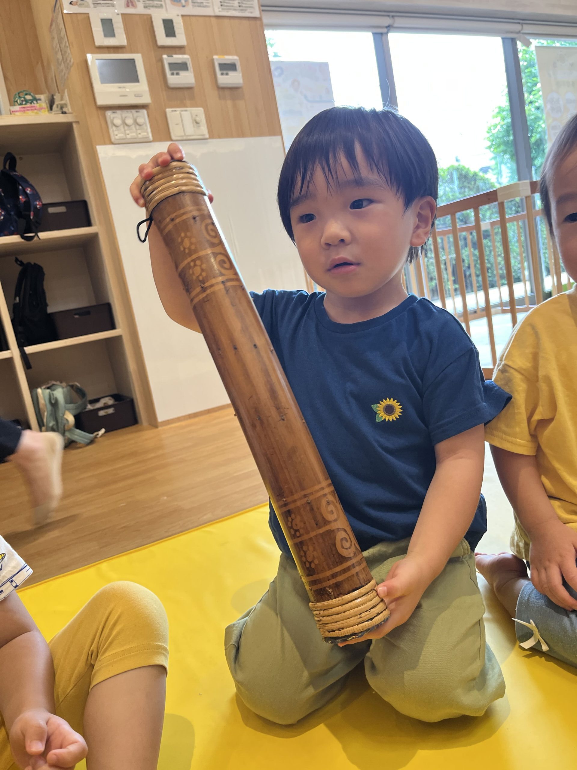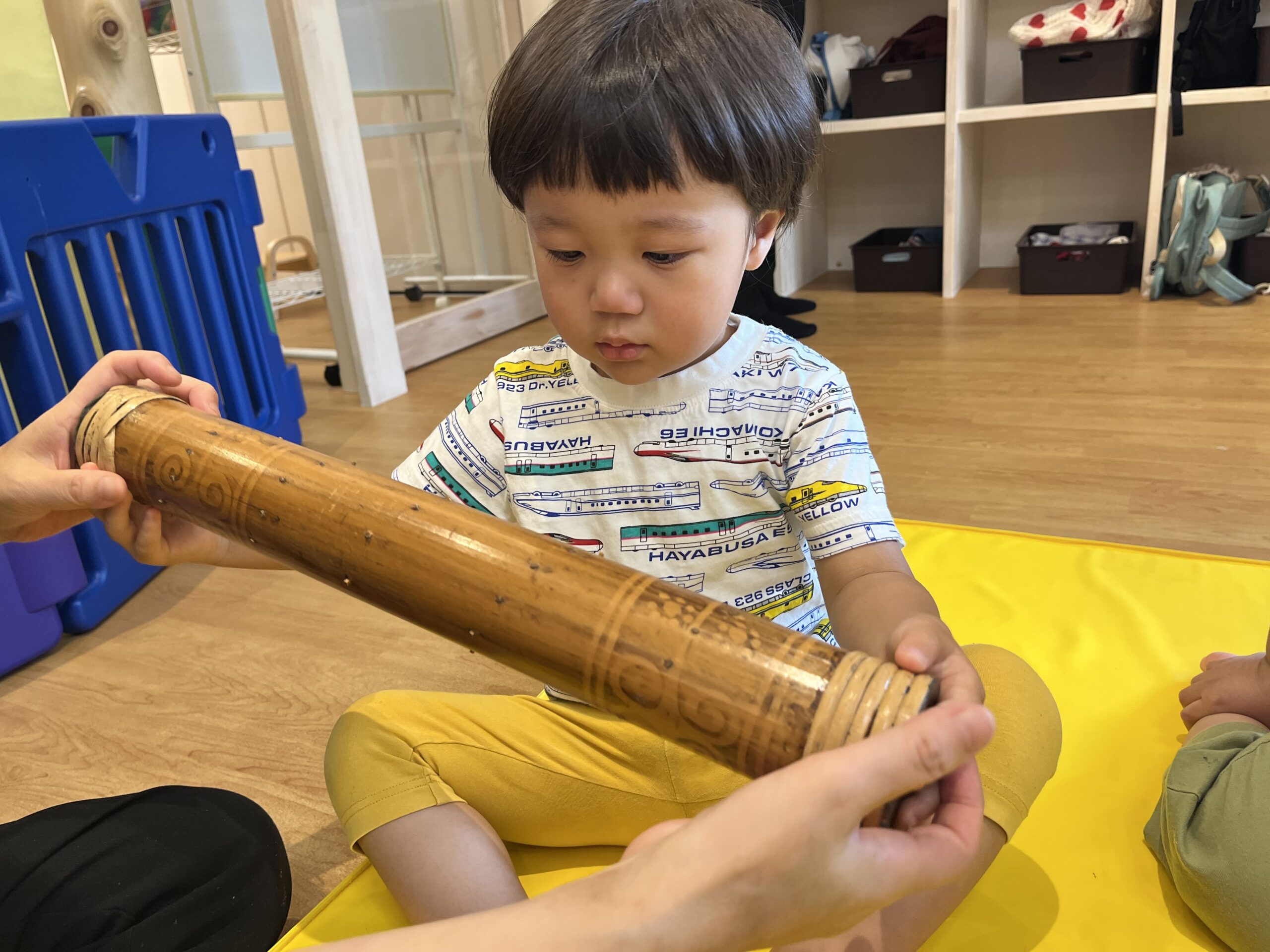 カラフルなスカーフをお空のお水に見立てて、ふんわり舞わせたり、レインスティックという雨の音がする楽器でリズム遊びもしました。