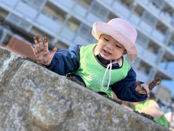 公園チームは、段差のある砂場が今日の冒険フィールド。先生が「ここはよじのぼるエリア、ここはつくるエリア」と分けて紹介し、「登る人は順番ね、作る人はここでどうぞ」とお約束を共有。「いいよ」「ぴたっ」「ゆっくり」の合図で切り替えを楽しみます。