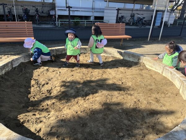 砂場では手で触ってみたり、払ってみる感触遊びを楽しみました。段差をテーブル代わりにし、お店屋さん遊びをしていました。