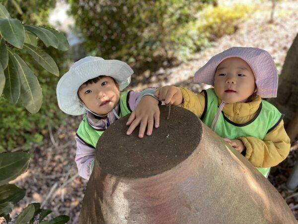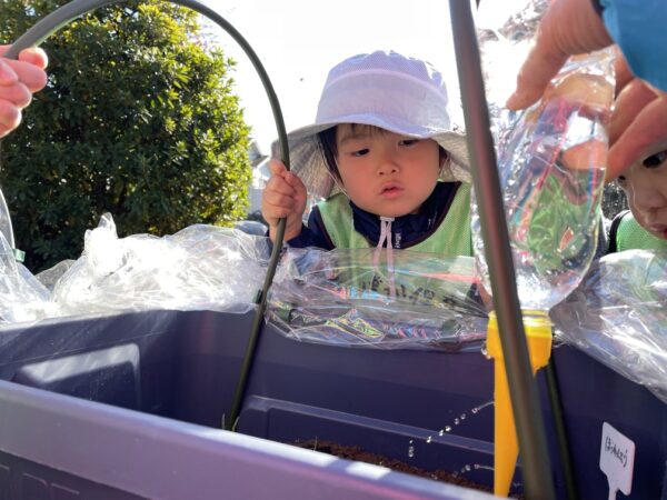 今日は2つのチームに分かれて活動。畑チームは、ほうれん草の芽の成長をみんなで確認しました。先生が「ちいさい芽、どこにいるかな?」と問いかけると、1歳さんが「ここ!」と指差し、そっと見つめます。