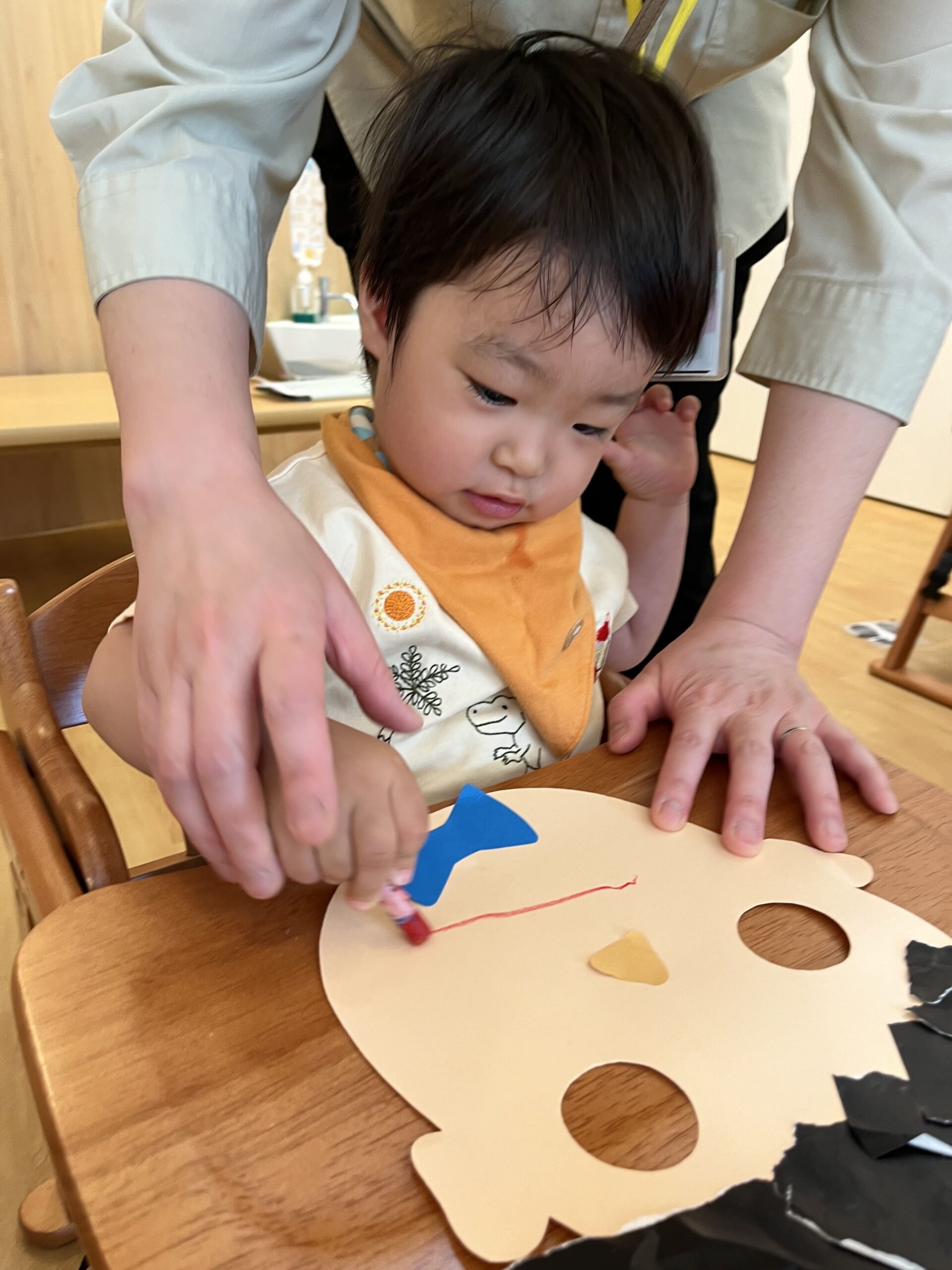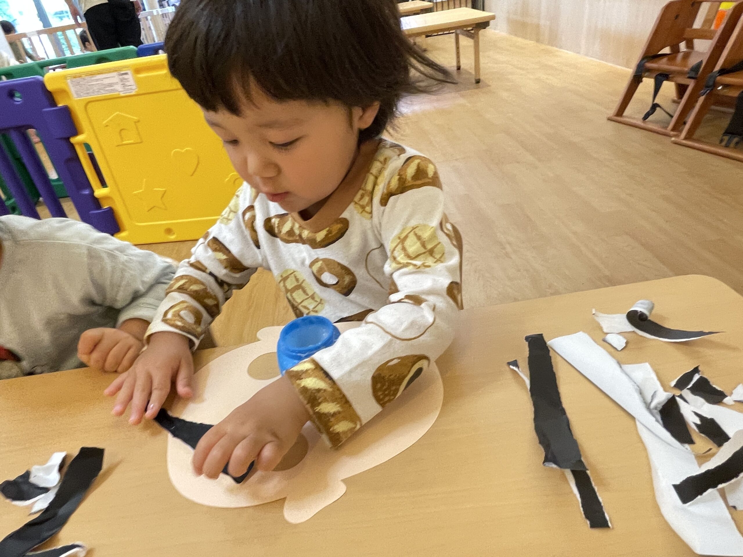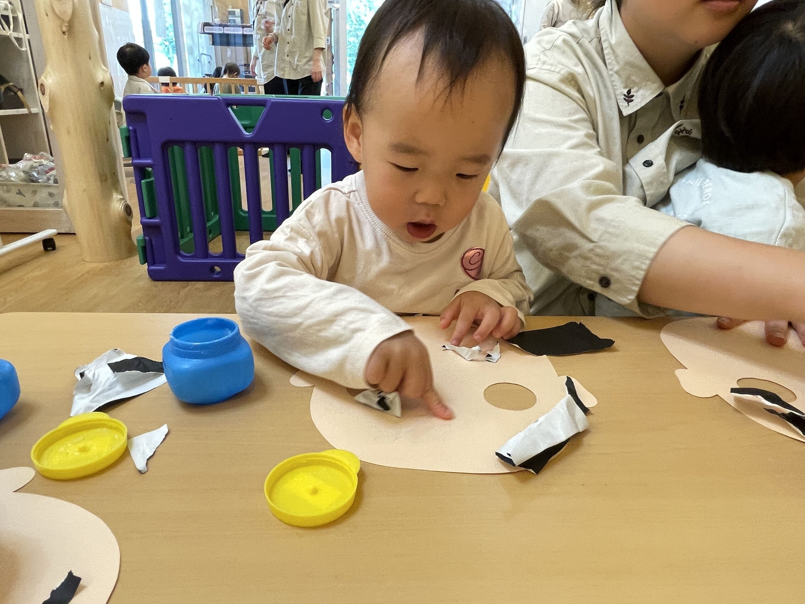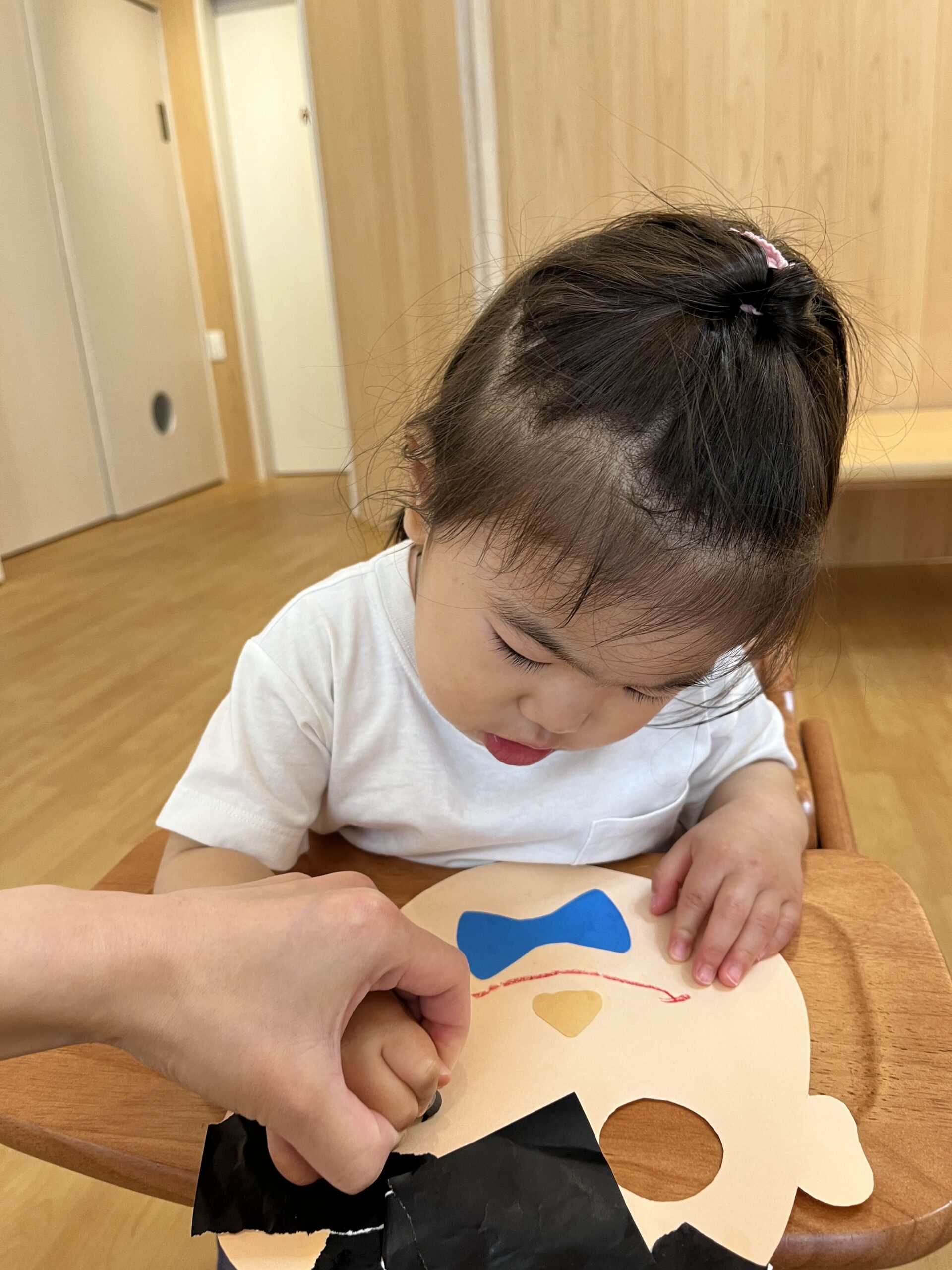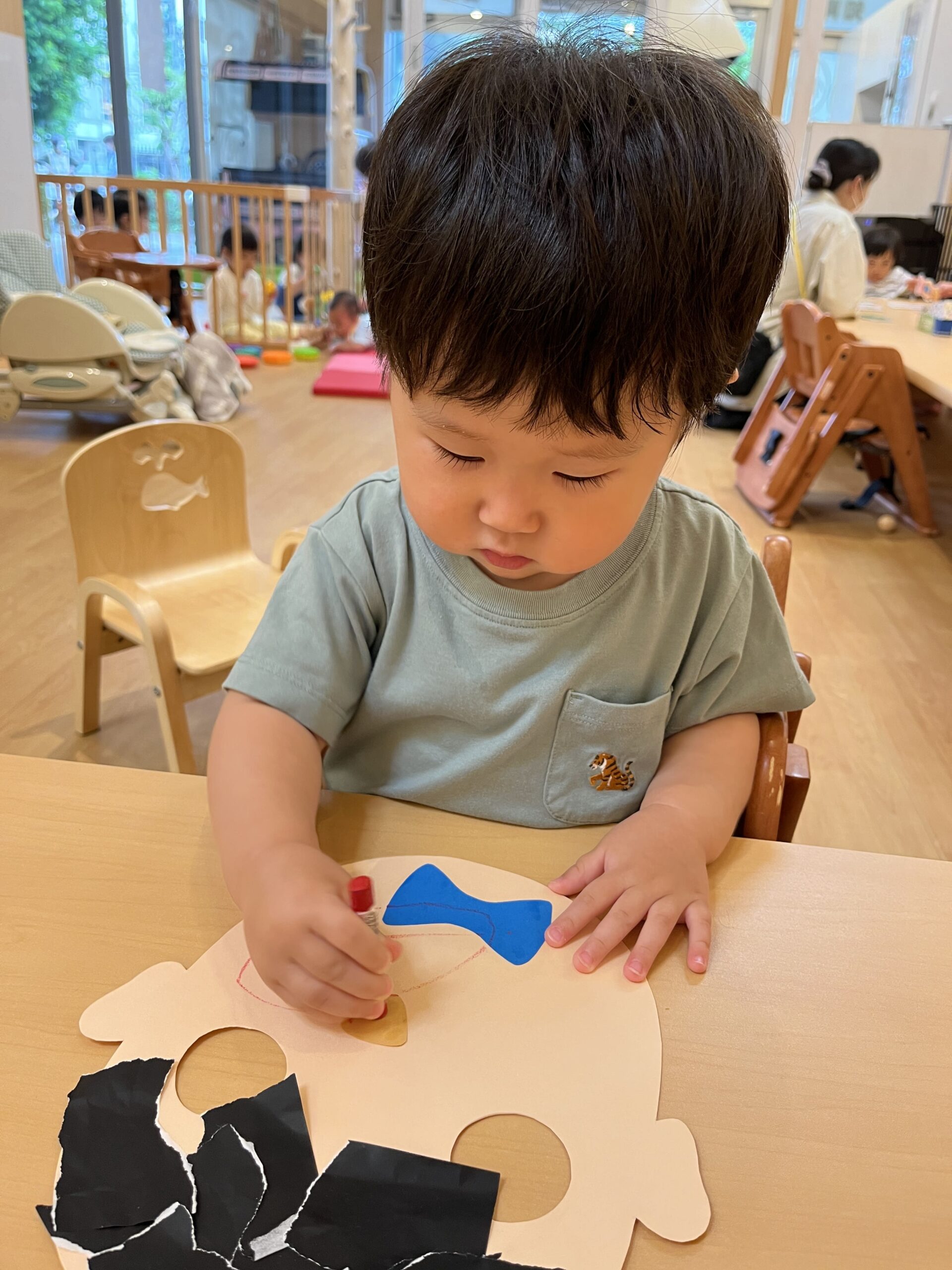 2歳児さんは糊が苦手な子が多かったですが、先生のサポートでぺたん!と頑張って張り付けてくれました♡
