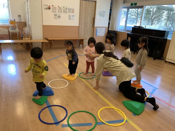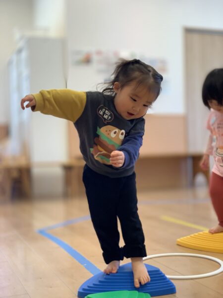 保育室に用意されたカラフルなバランスストーンに、子どもたちは興味津々。
