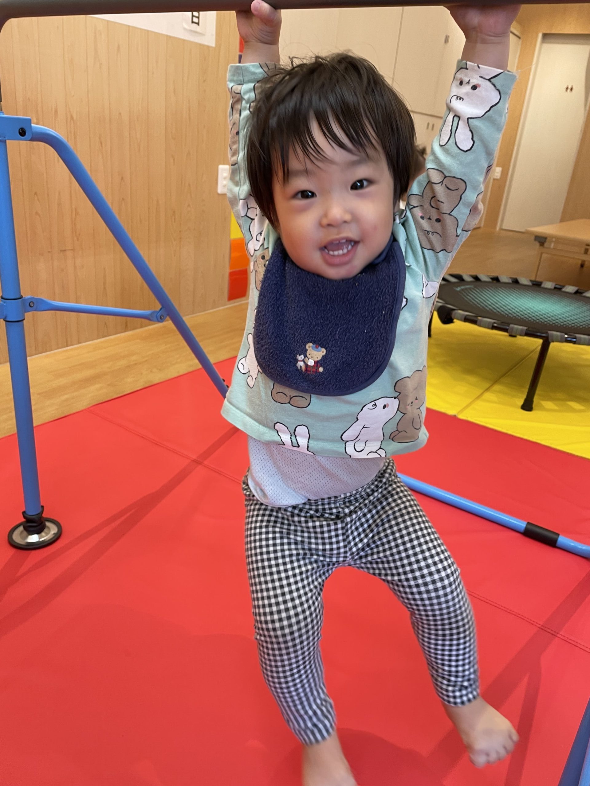 次は鉄棒にチャレンジ。「ぶらさがれるかな?」と先生が聞くと「できたよ!」と言わんばかりの満足そうな様子。自然とお友達同士で「すご~い」と拍手し合う姿にほっこりしました♡