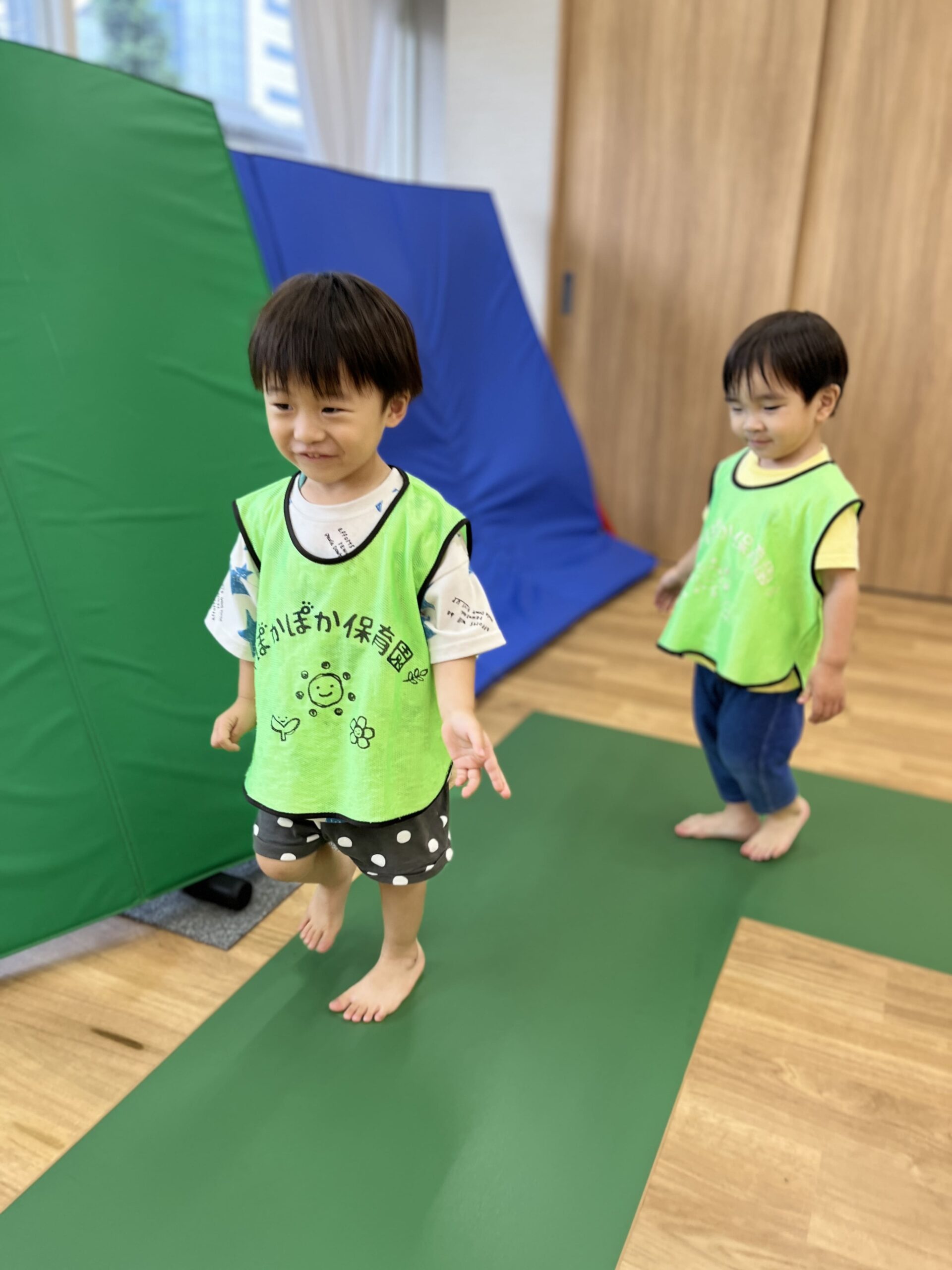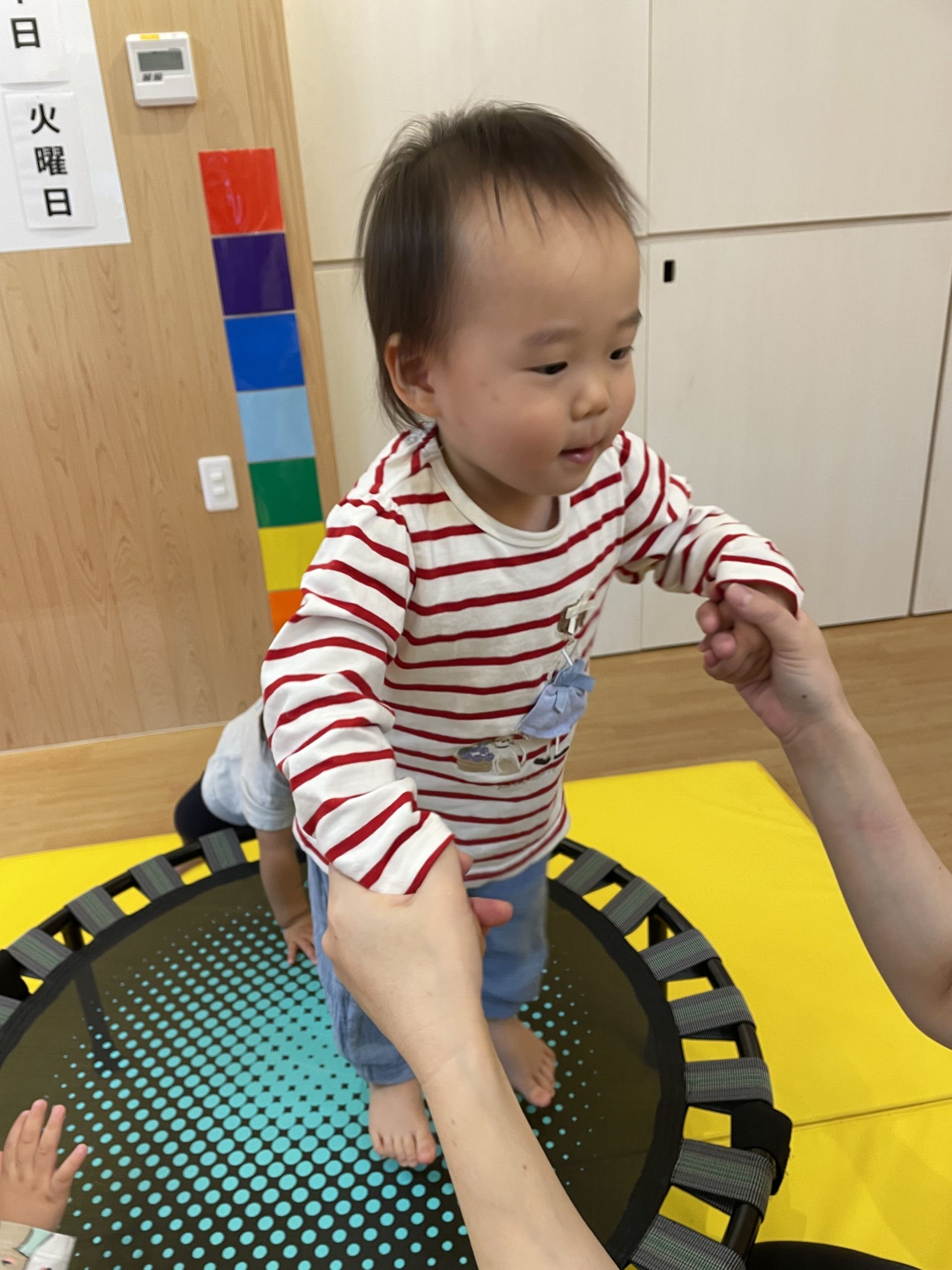 まずは、みんなが大好きなトランポリン!「ぴょんぴょんできる?」と先生が声をかけると「みて!」と元気よくジャンプ!「すごーい!高く跳べたね」と先生が褒めると、とっても嬉しそうな笑顔を見せてくれました。
