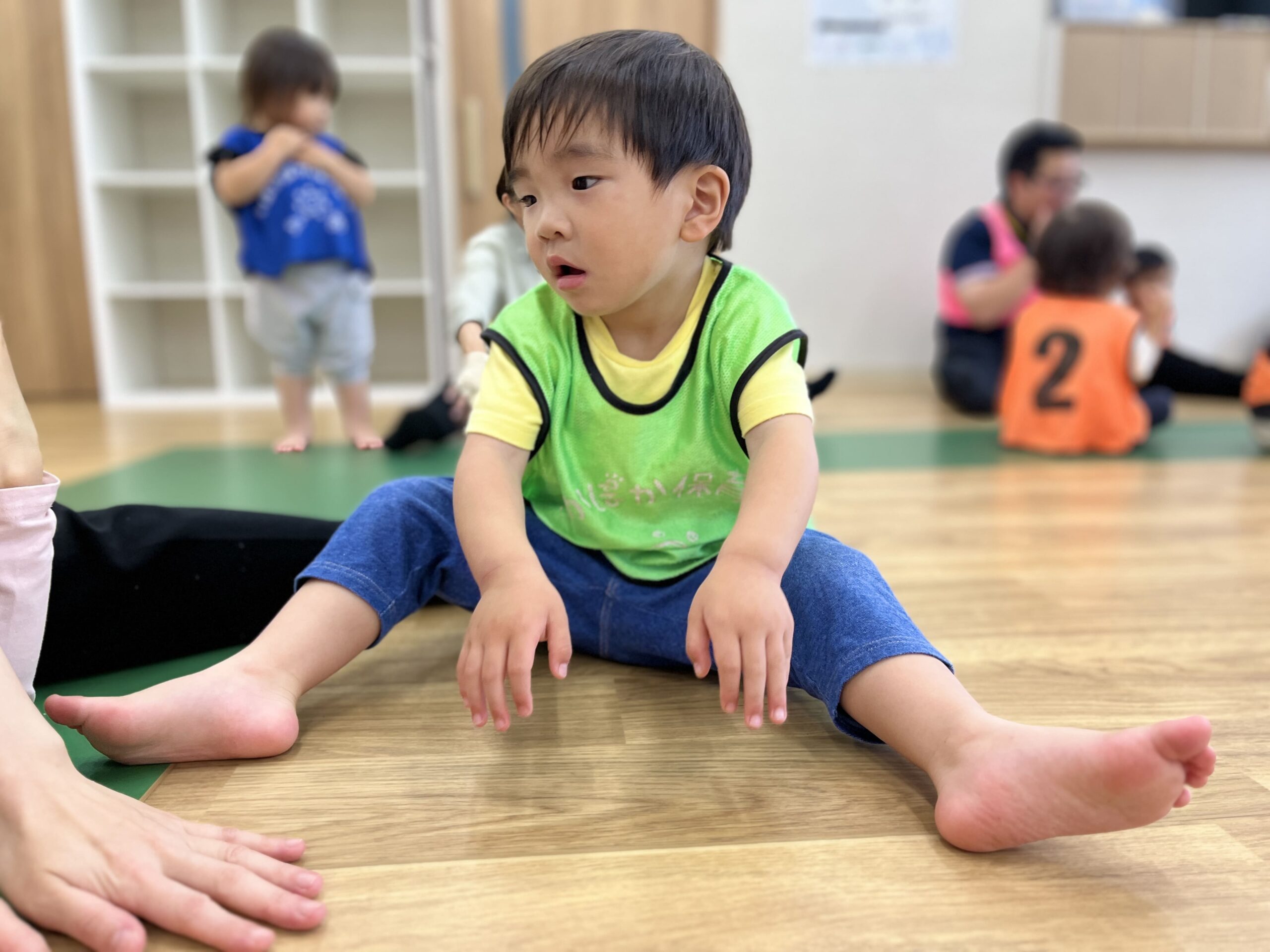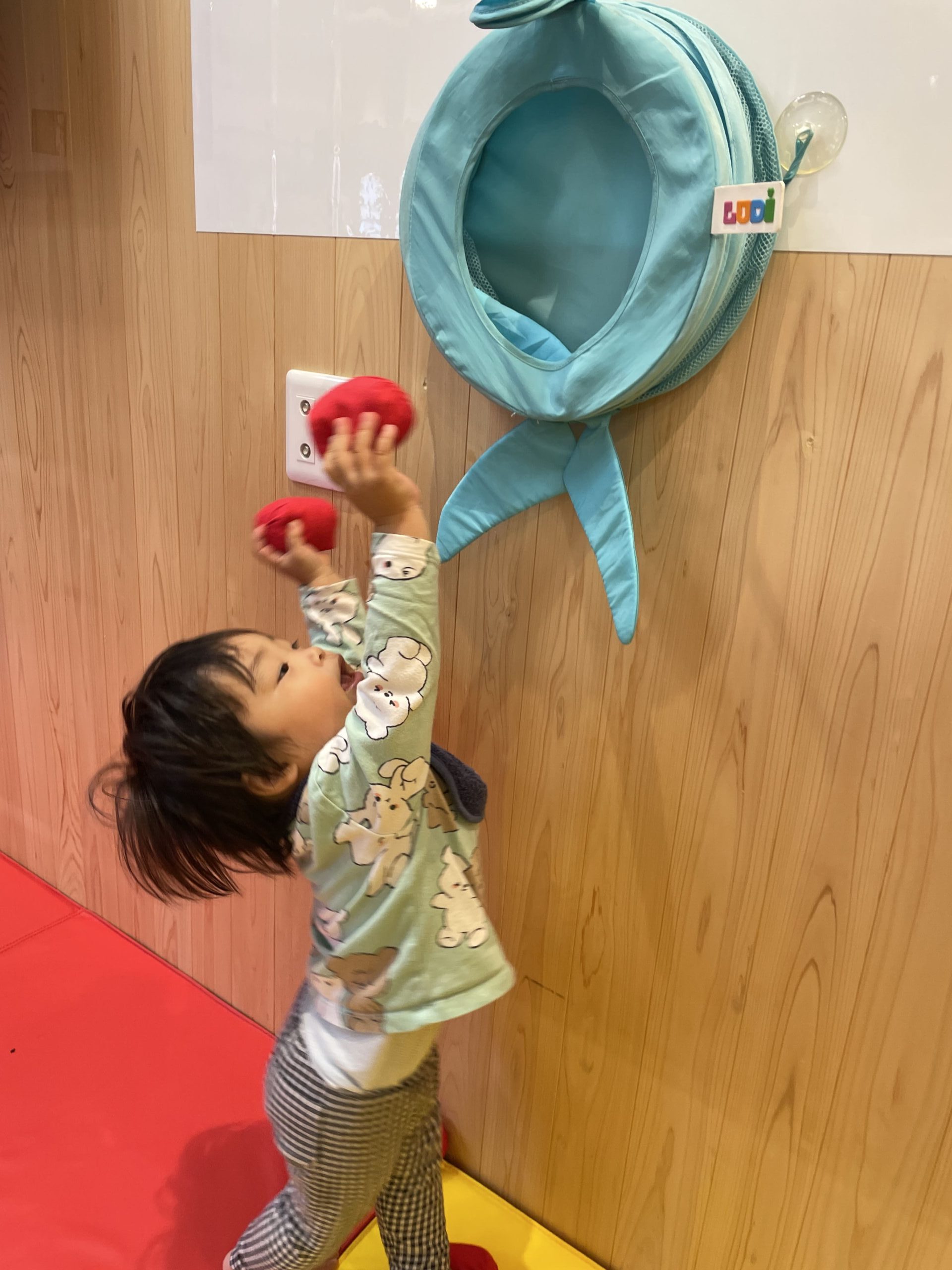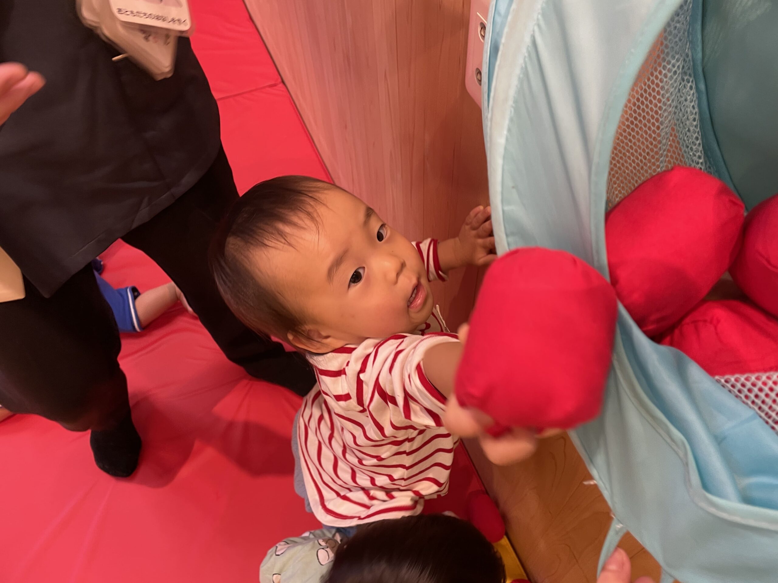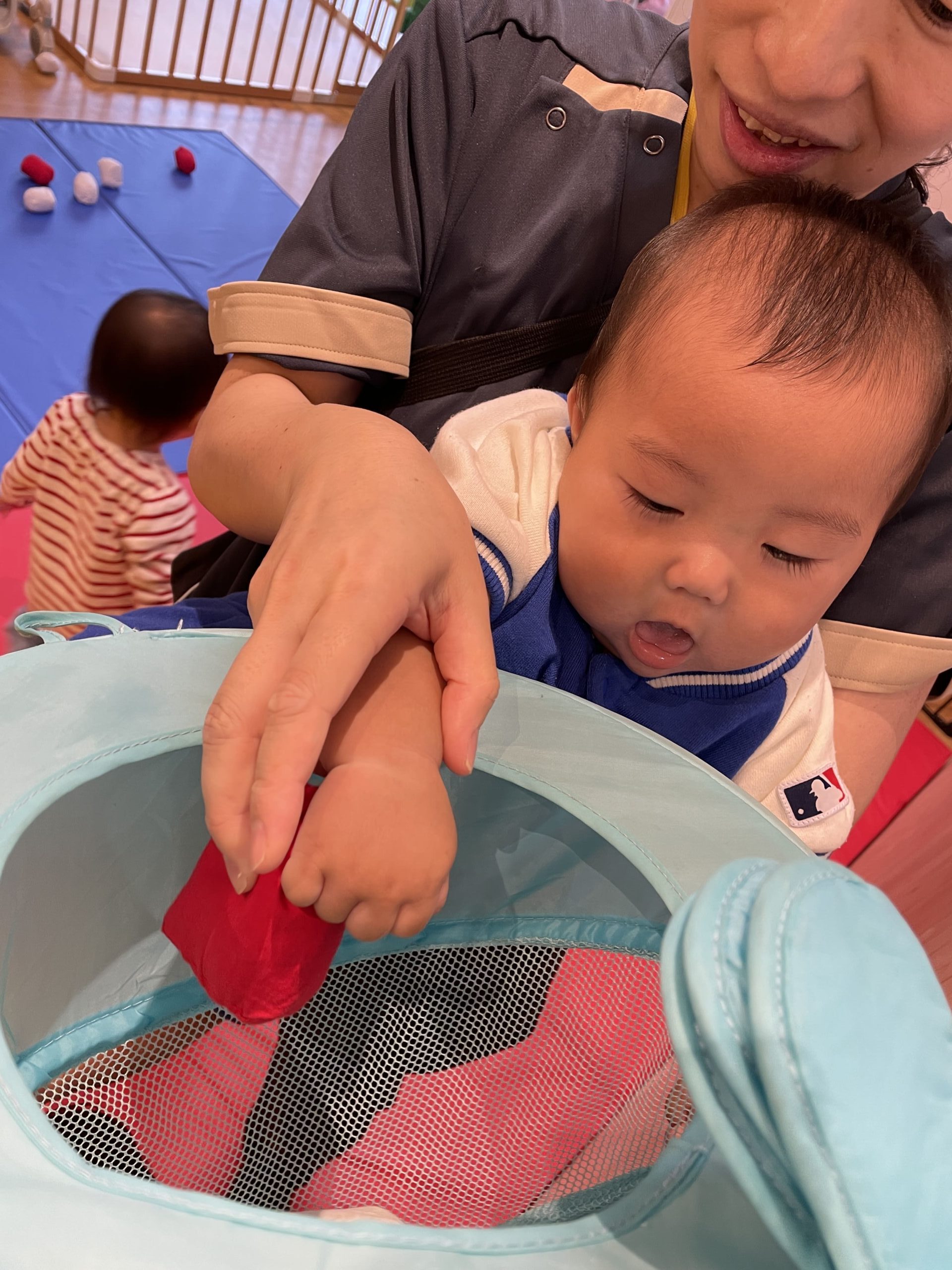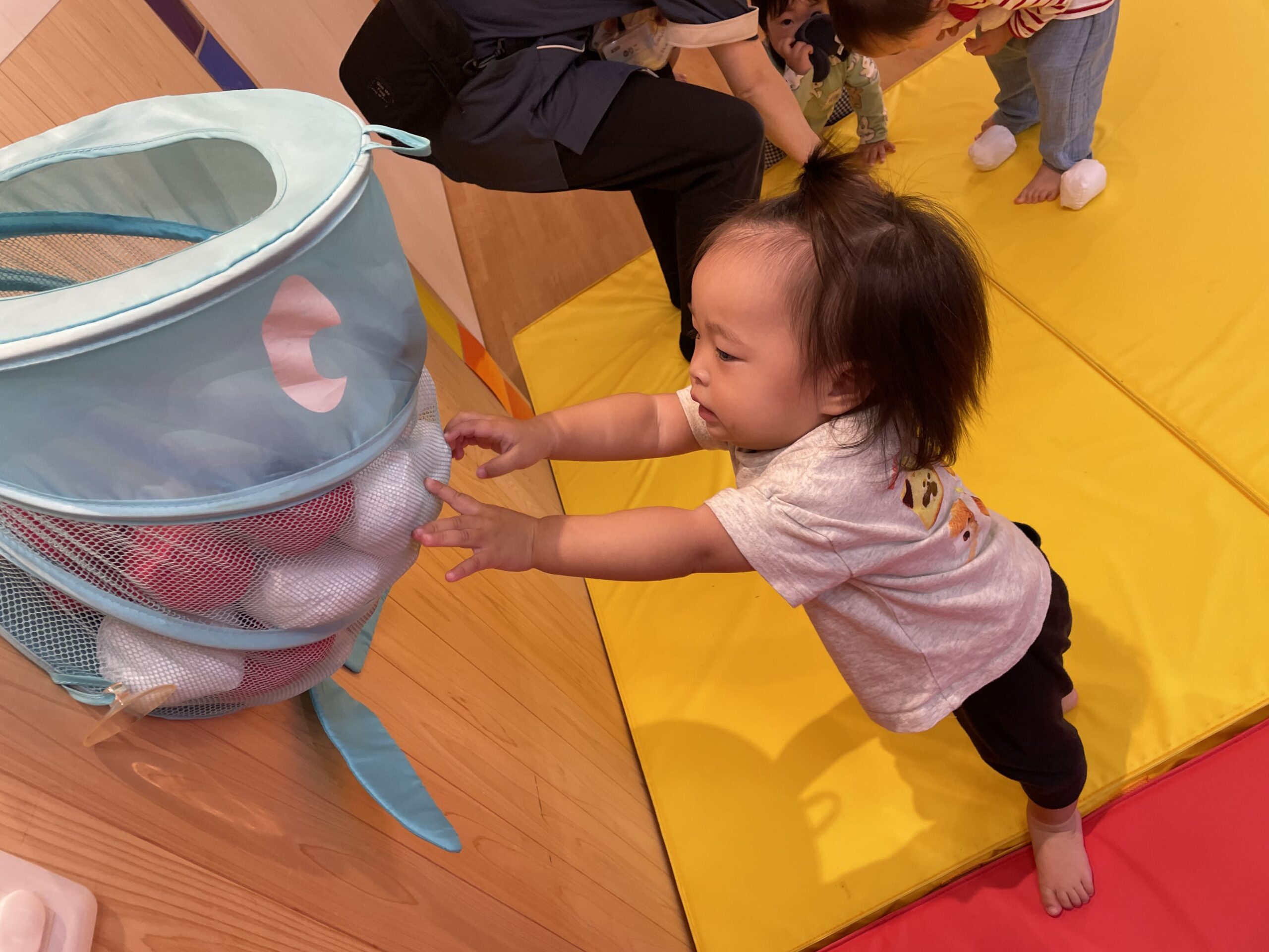 そのあとは、みんなで玉入れをやってみました。「届くかな?」と先生が言うと、子どもたちは背伸びしながら一生懸命かごめがけて玉を投げます。「やった!入った!」と両手をあげて大喜び。「もう一回!」と何度も挑戦していました。「みんな上手だね」と先生が言うと、照れくさそうにしながらも自信たっぷりの表情がとても印象的でした。