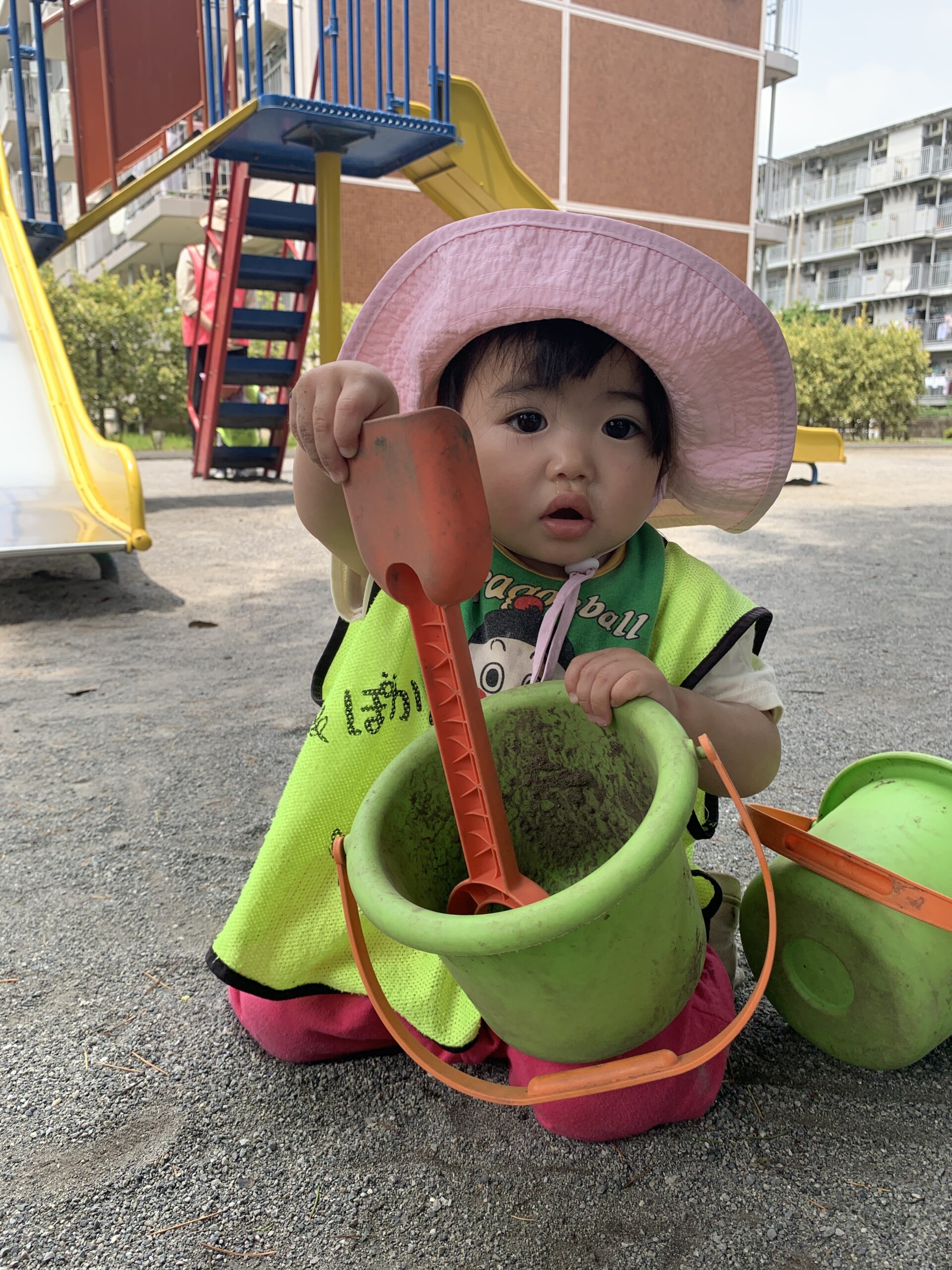 カップに砂を入れて遊ぶ姿や、