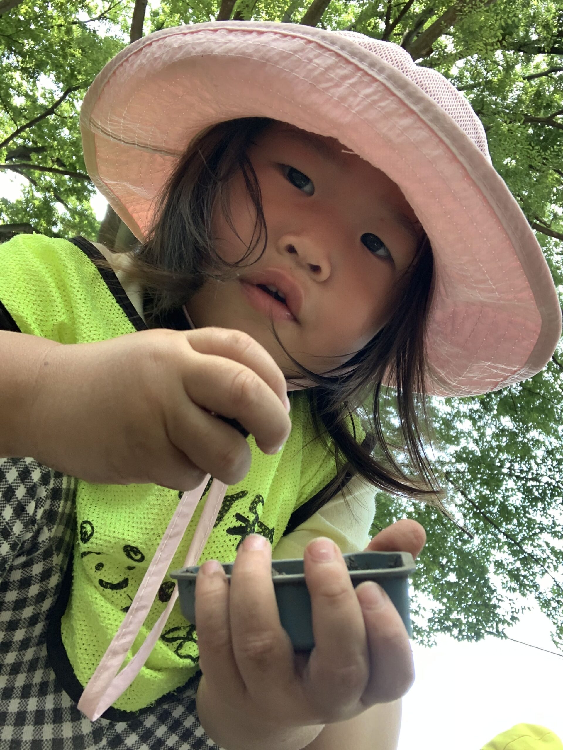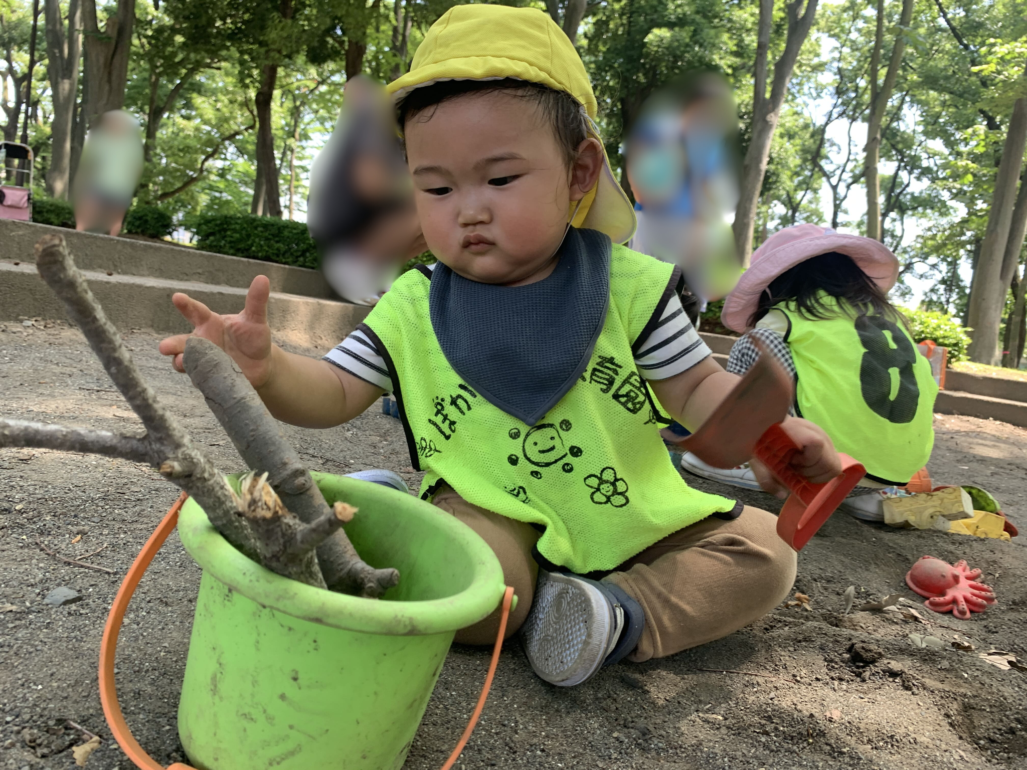 バケツの中に砂やどんぐり、木の枝など好きなものを集めて、「みてみて!こんなの見つけたよ!」と先生やお友達に見せてくれました。