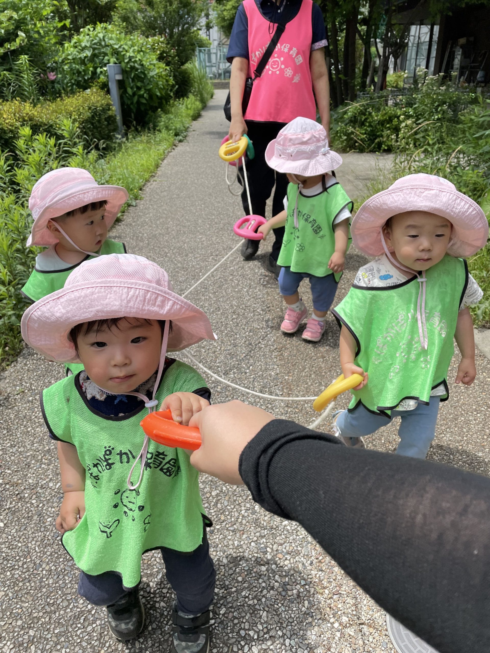 帰り道は、子どもたちがお散歩ロープをしっかり持ち「みんな仲良く歩こうね!」と声を掛け合いながら園まで帰ってきました。