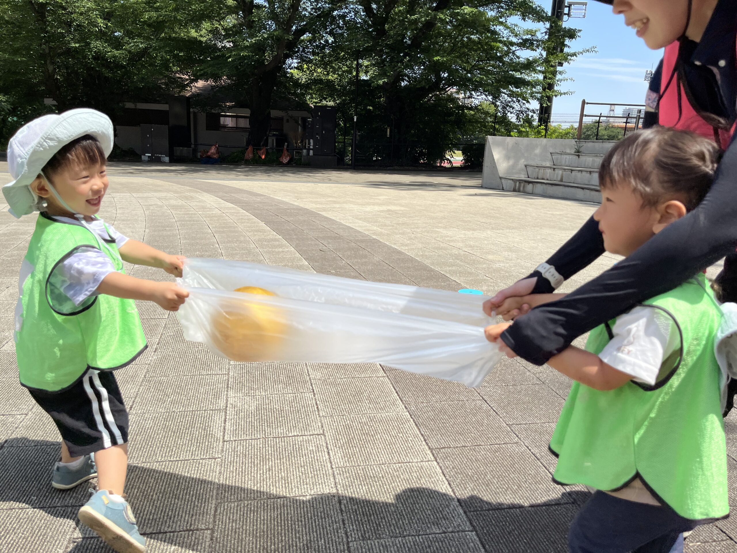 公園に到着すると、お友達と協力しながらボール運びゲームにチャレンジ。