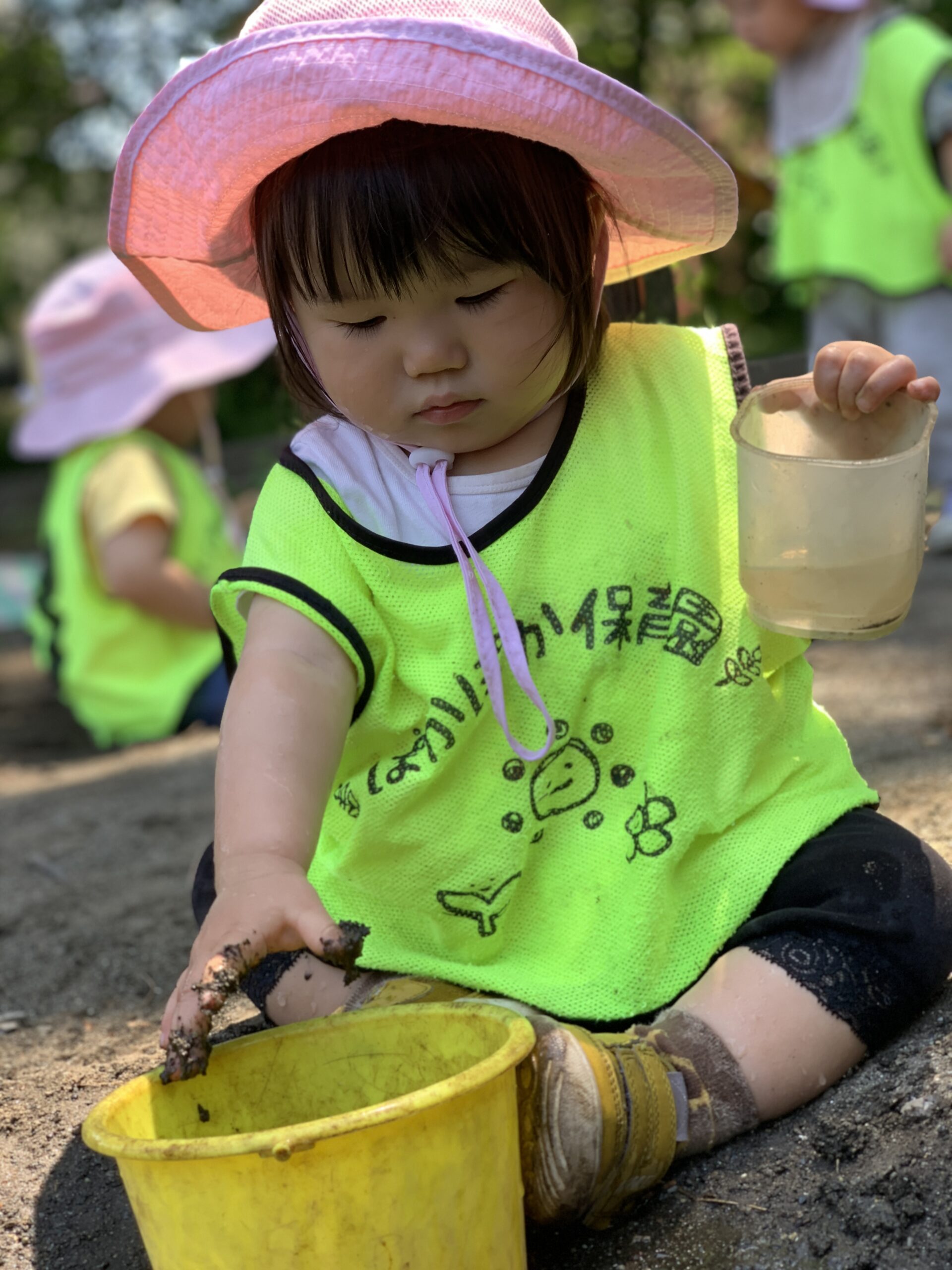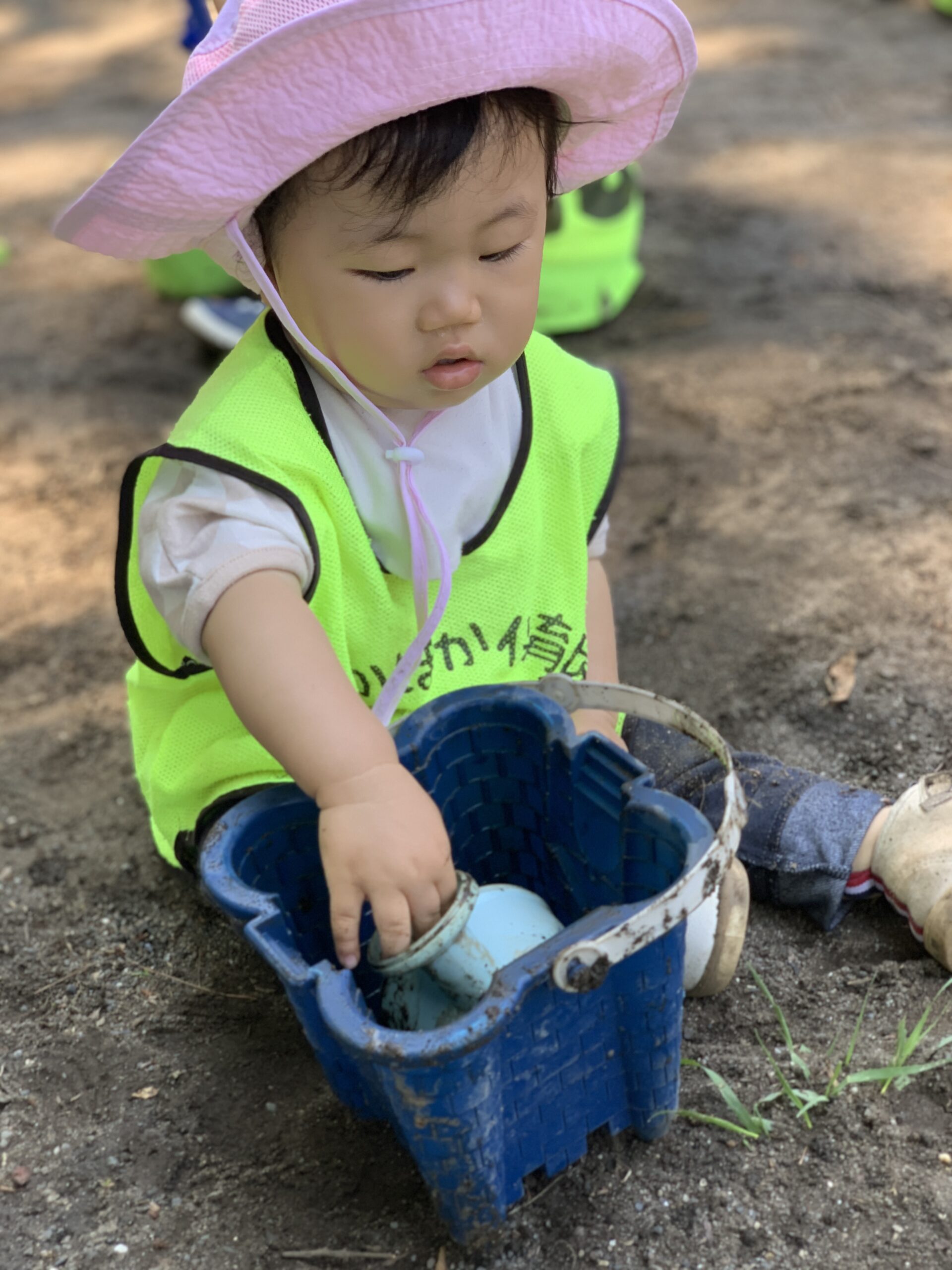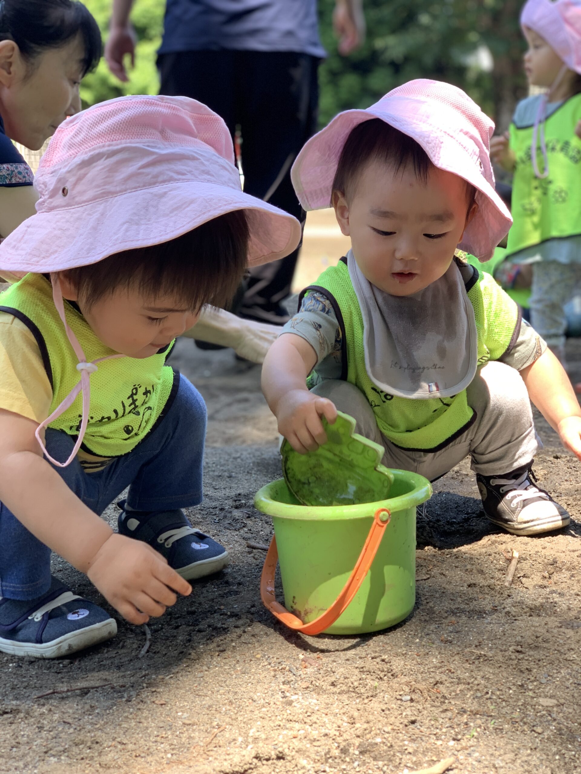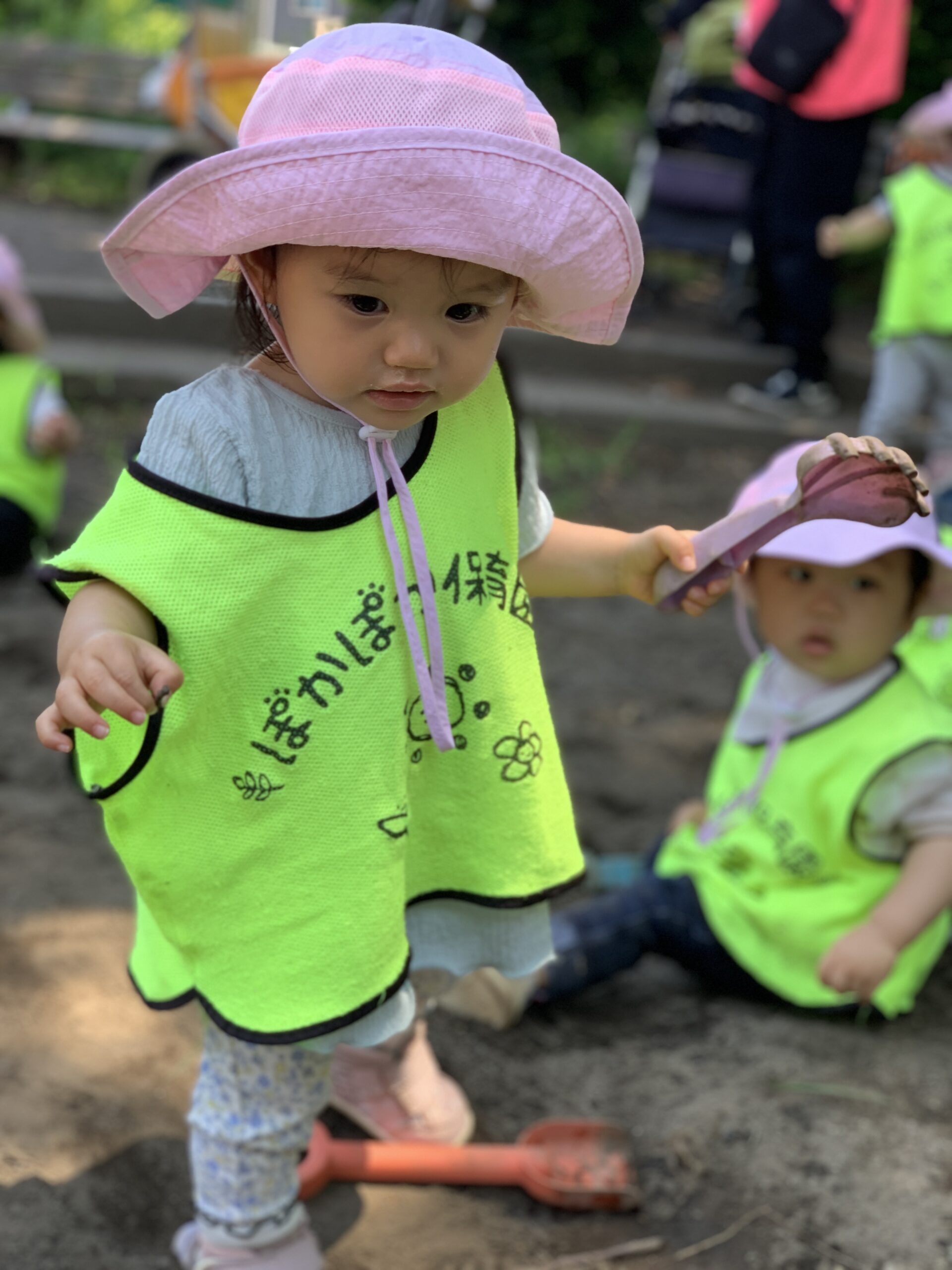 「ケーキつくるの~!」と、お友達と仲良くスコップで砂をすくい、