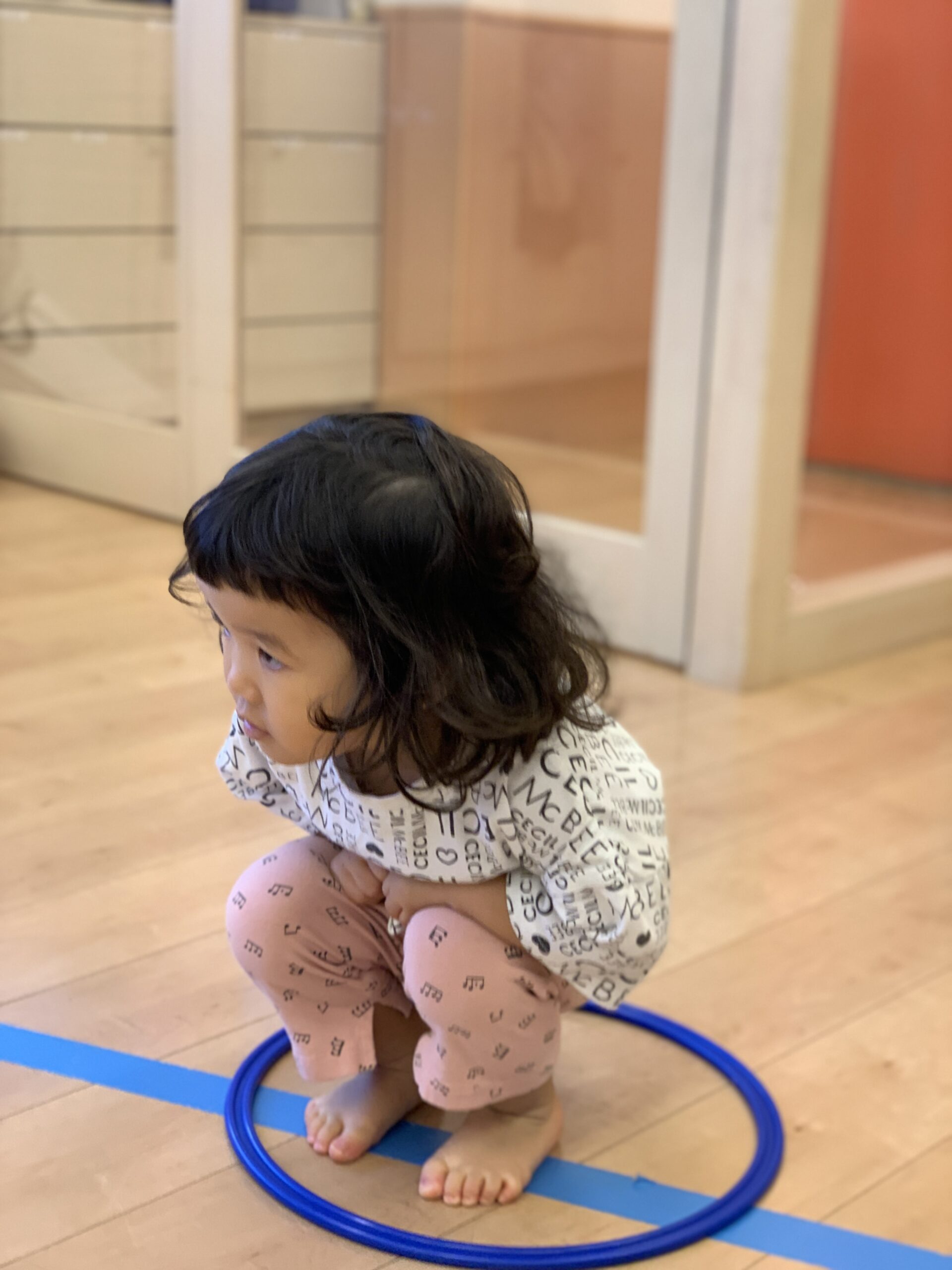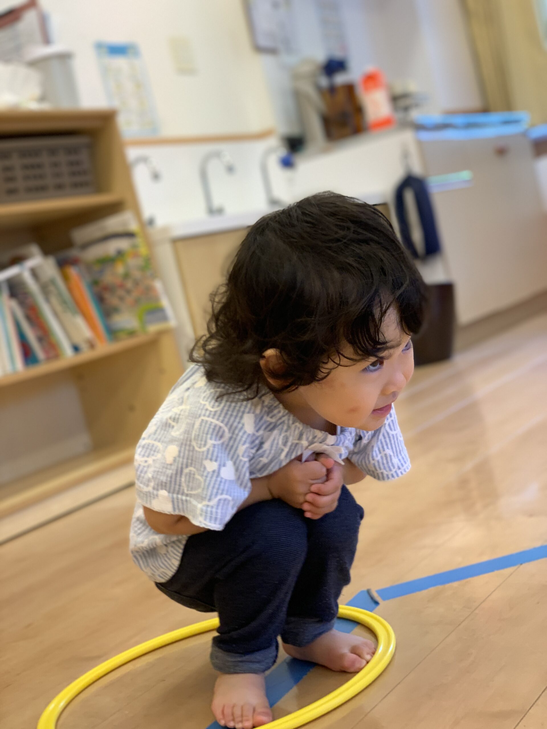 保育室では、丸いフープを使って体育遊びをしましたよ。