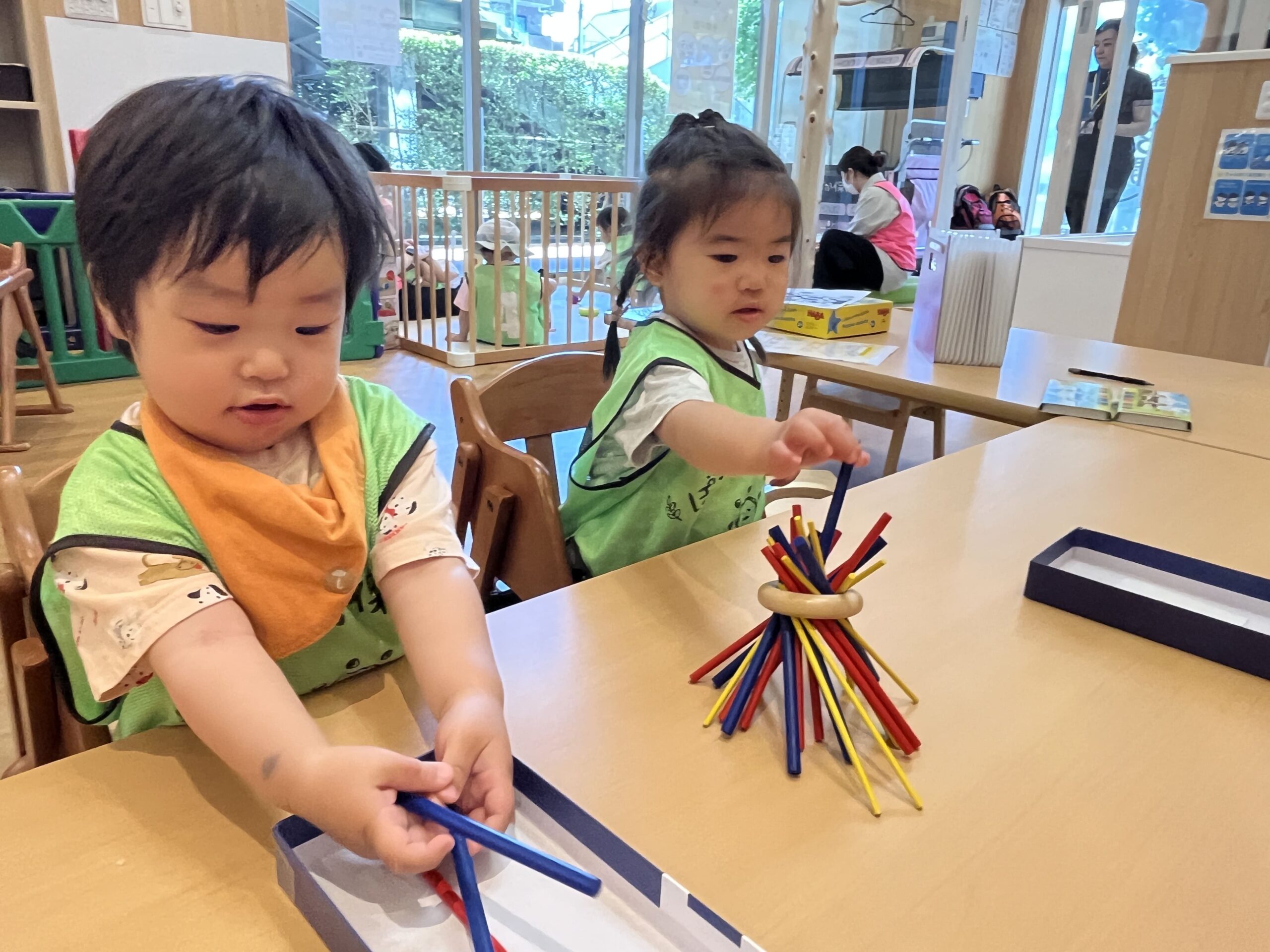 今朝は保育室でアナログゲーム大会からスタート。スティッキーやかくれんボール、フィッシングなど、さまざまな遊びを楽しみました。