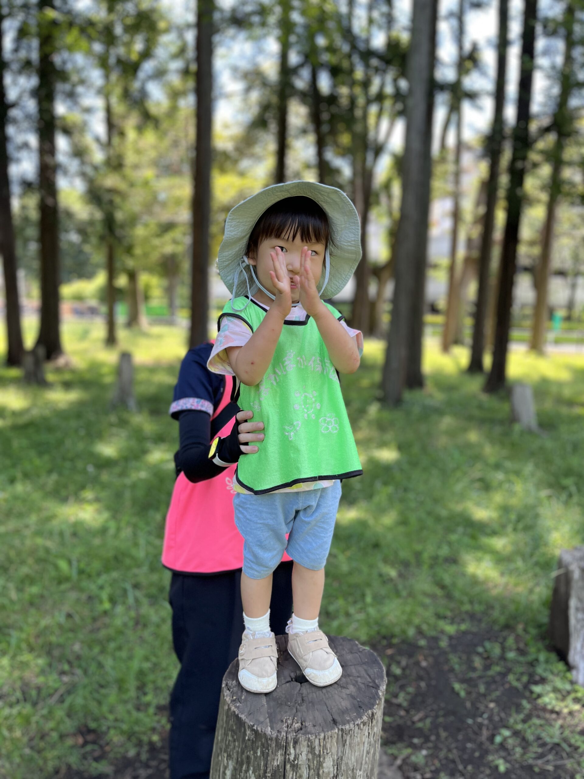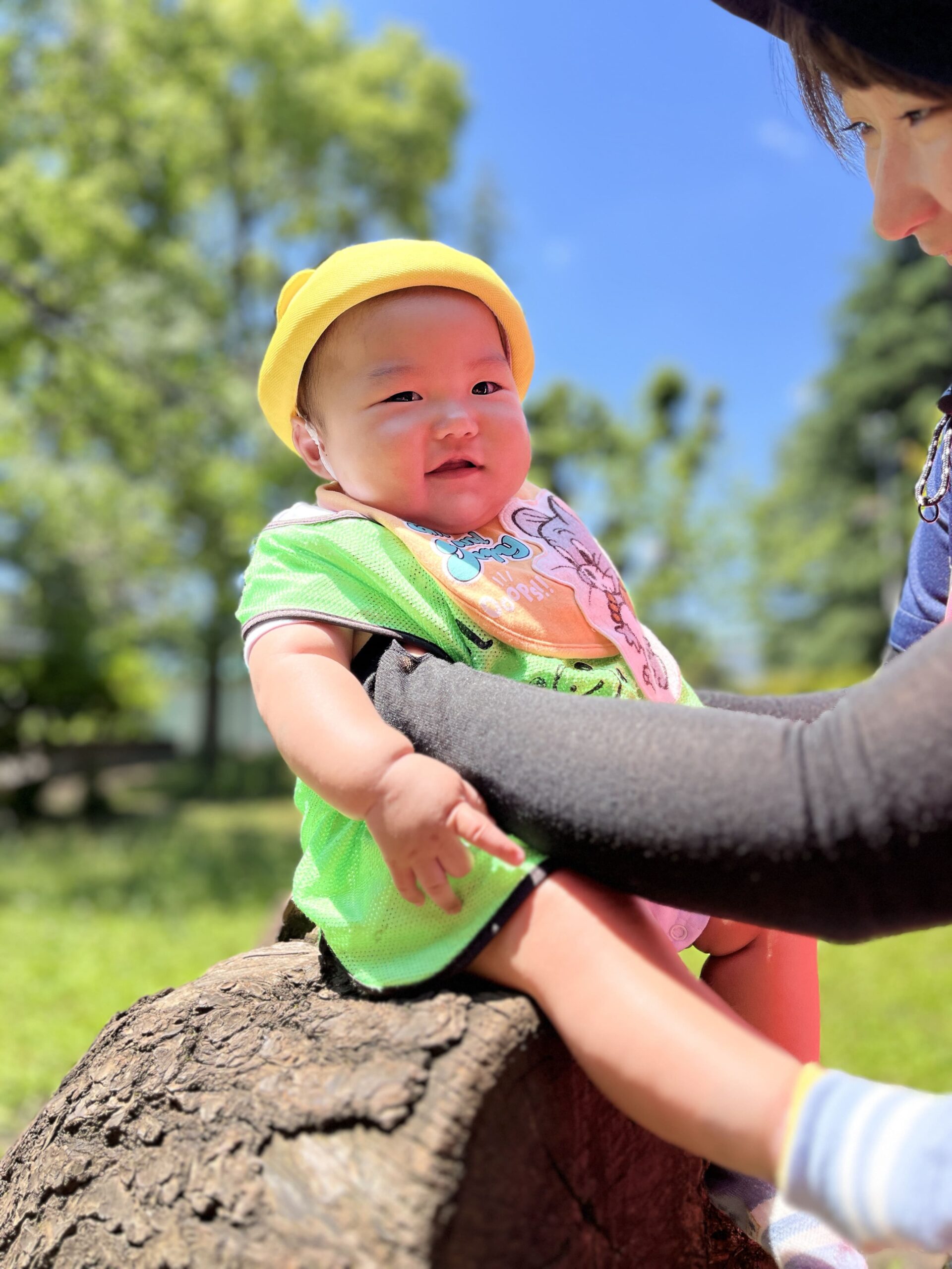 さあ、その後は太陽の光いっぱいの公園へお出かけ! 切り株の上に乗ってバランスをとってみたり、倒木の上を「そーっとね」と歩いて冒険気分。先生と「落ちないように、がんばろうね」と声をかけながら、身体の動かし方を工夫して遊ぶ経験もたくさん積み重ねています。