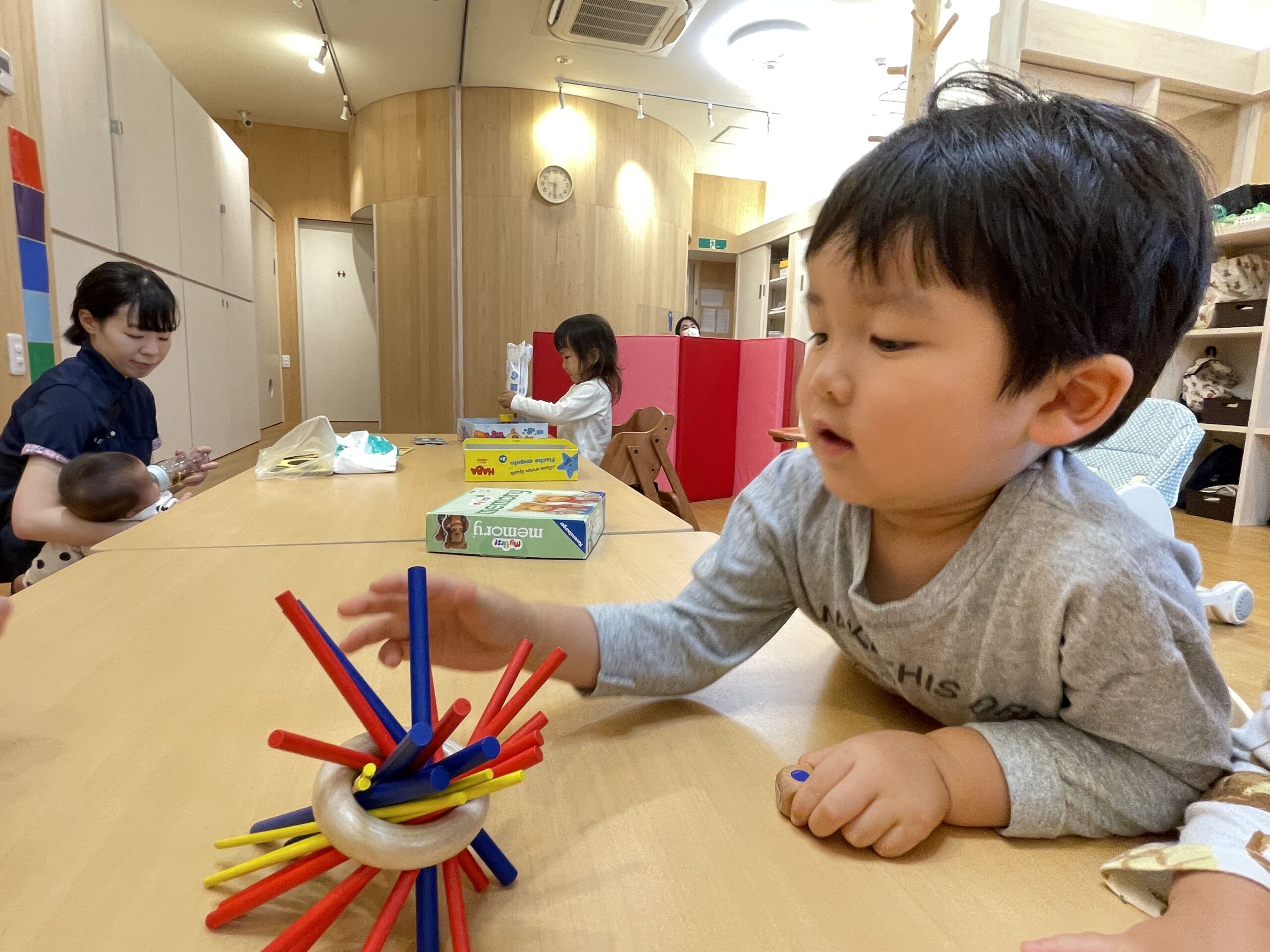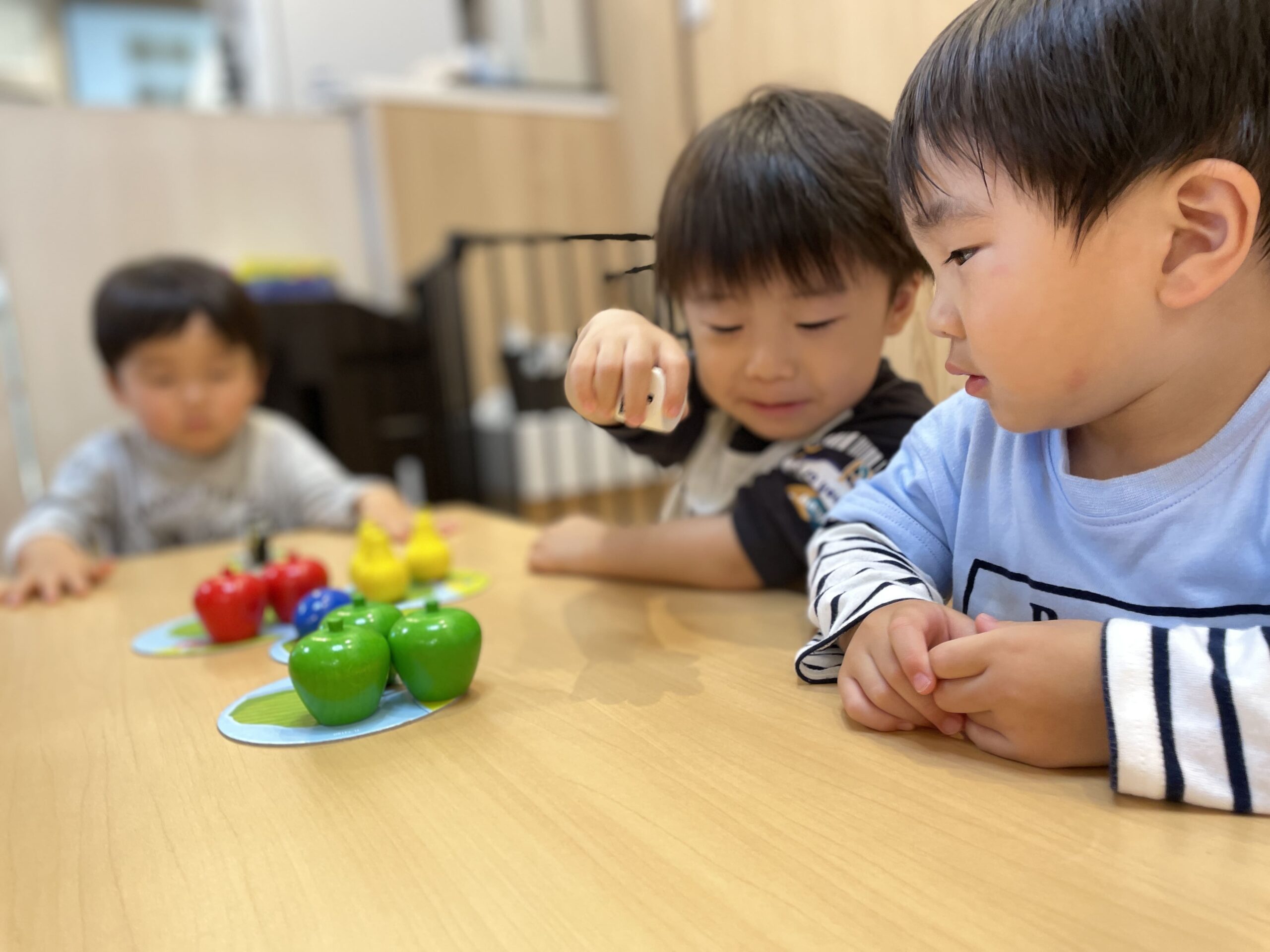 次は「果樹園」の協力ゲーム。「みんなで力を合わせてがんばろう!」と先生が声をかけると、「うん!がんばる!」と仲良しの子どもたちが集まり、果物をカゴに運んでいました。集中して遊ぶその表情はとても真剣で頼もしかったです。最後に「スティッキー」で色を見分けて、棒をそっと抜いていくゲームでは、「あ!倒さないないように…」と声をかけながら慎重に抜いて大成功。嬉しそうに笑う姿が印象的でした。