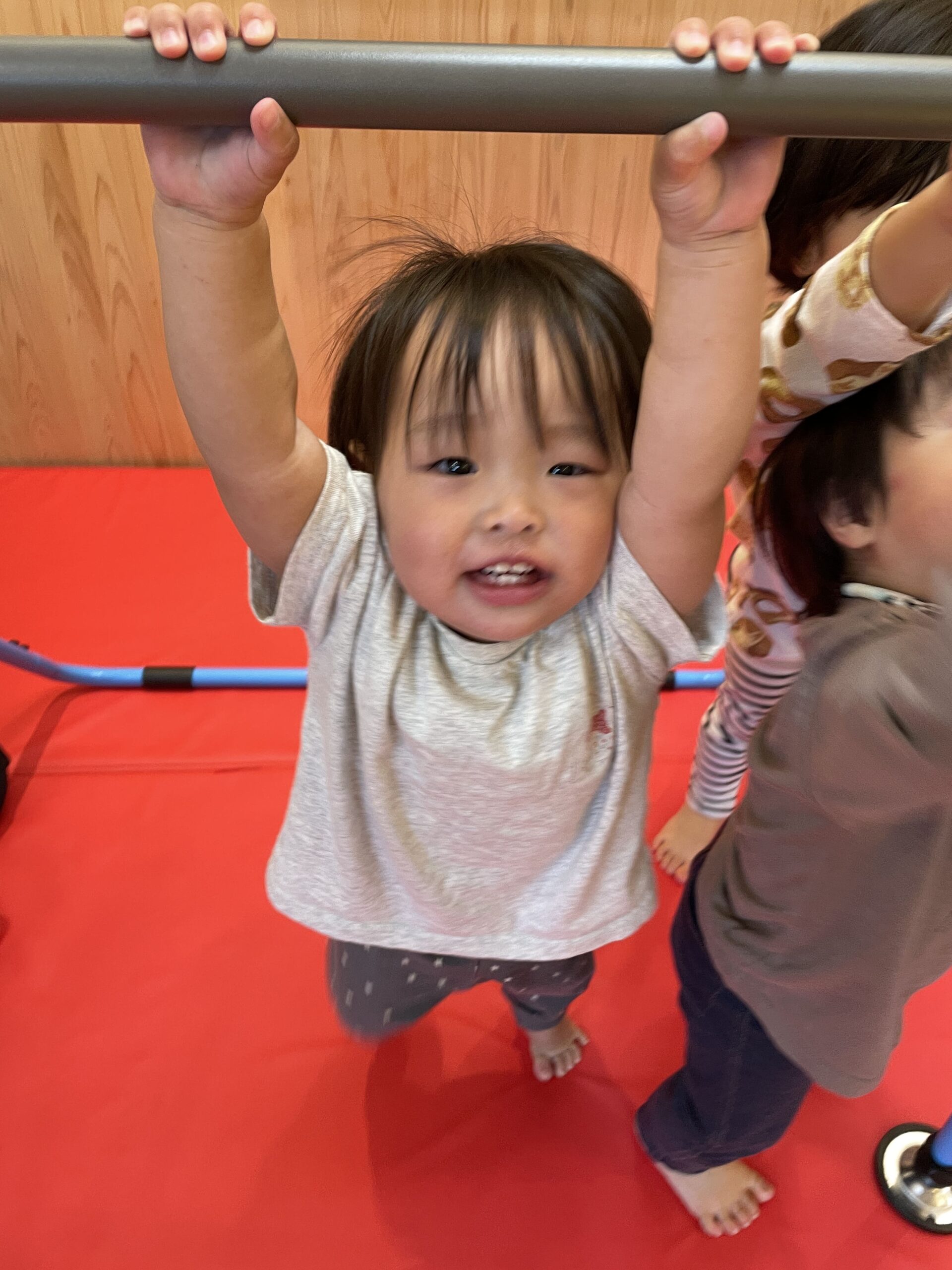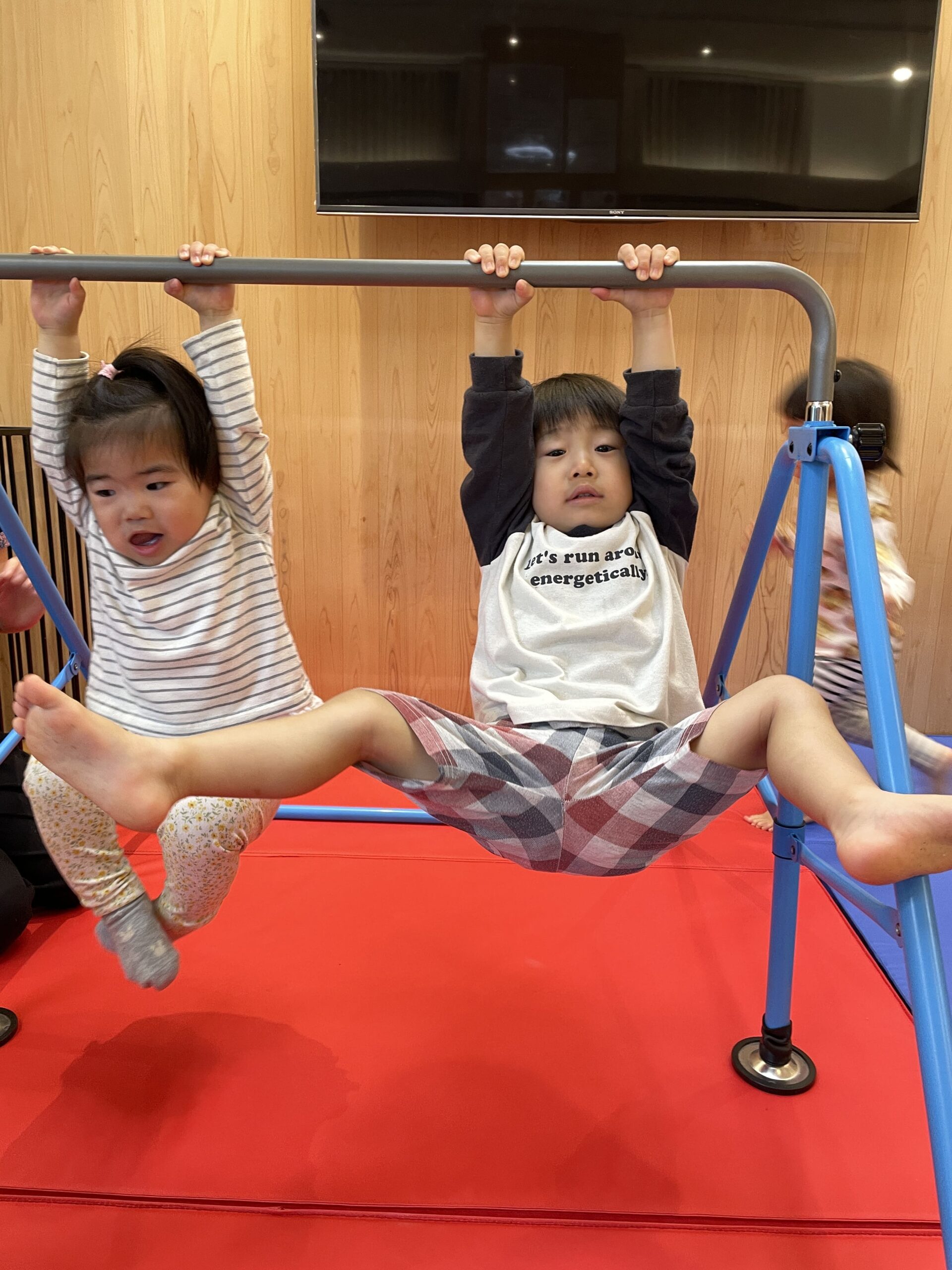 その後は安田式の運動遊びに。みんなで動物のまねっこをして、「わんわん!」「ぴょーん!」と、犬やカエルになりきって歩きました。鉄棒ではぶら下がって「できた!」と笑顔。先生が「頑張ったね!」と声をかけると、「もういっかいやる!」とやる気満々。子どもの意欲がぐんぐん伸びています。トンネルくぐりも大人気で、「ばあ!」と出てくるたびにお友達と顔を見合わせて笑い合い、自然と仲良しの輪が広がっていきました。