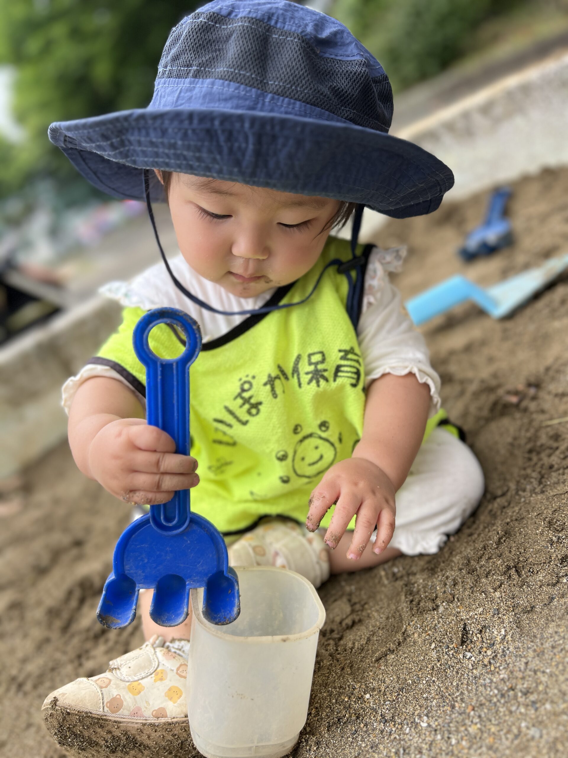 お兄さん・お姉さんの遊び方にも興味津々で、カップに砂を入れるのを真似してみたり、「ぼくもやってみる!」と手を伸ばしてみたり。子ども同士の関わりの中で、遊びの幅も広がっていきます。「○○ちゃん、じょうず!」と声をかけると、「うふふ」と照れくさそうに笑顔を返してくれる場面もあり、友だちと楽しい時間を共有する様子がたくさん見られました。