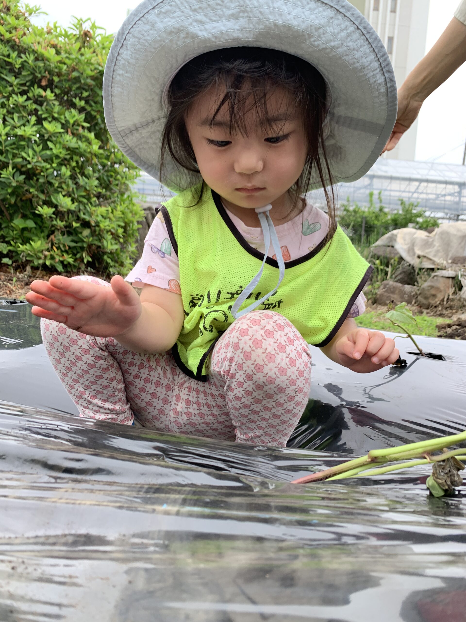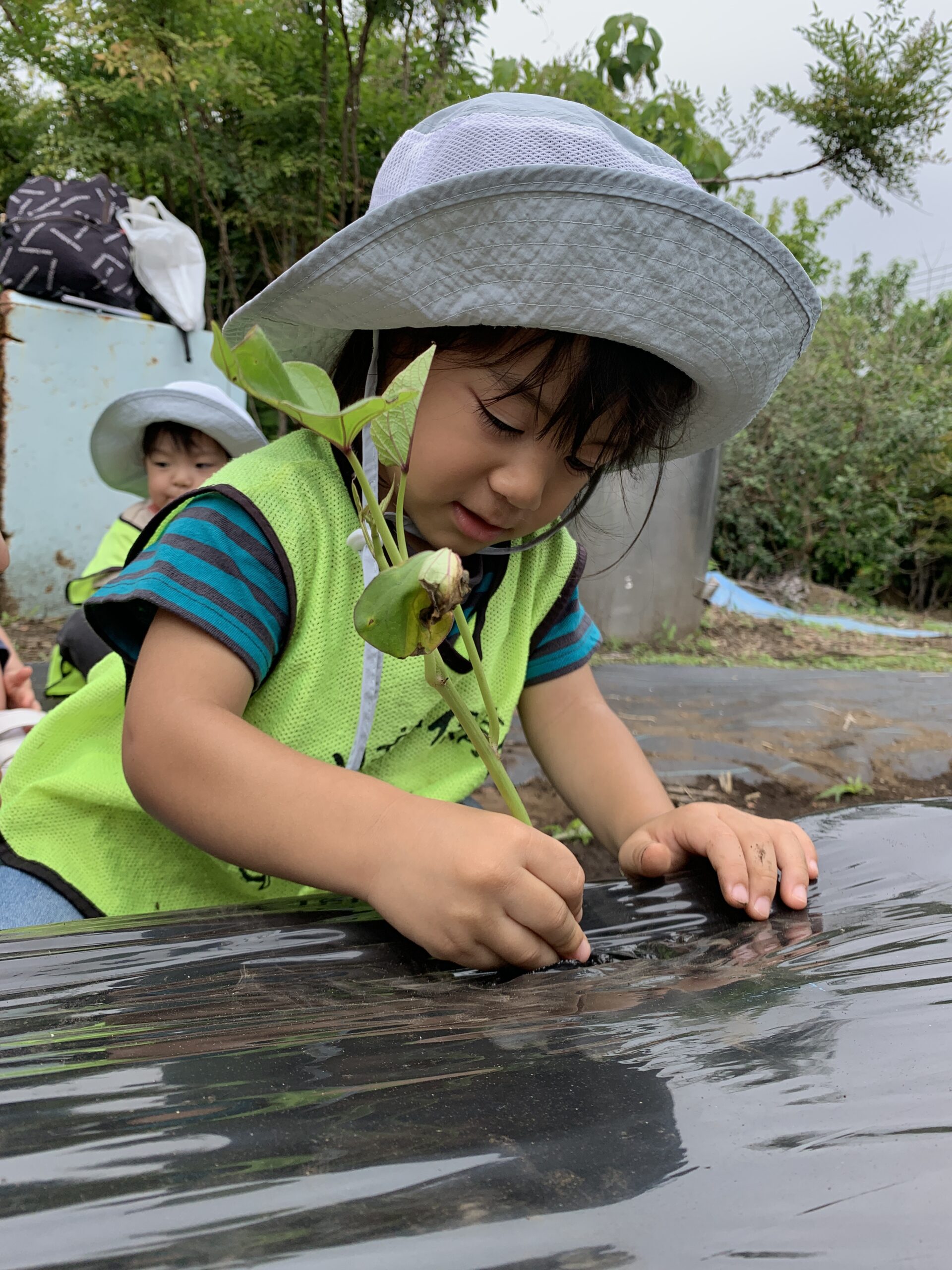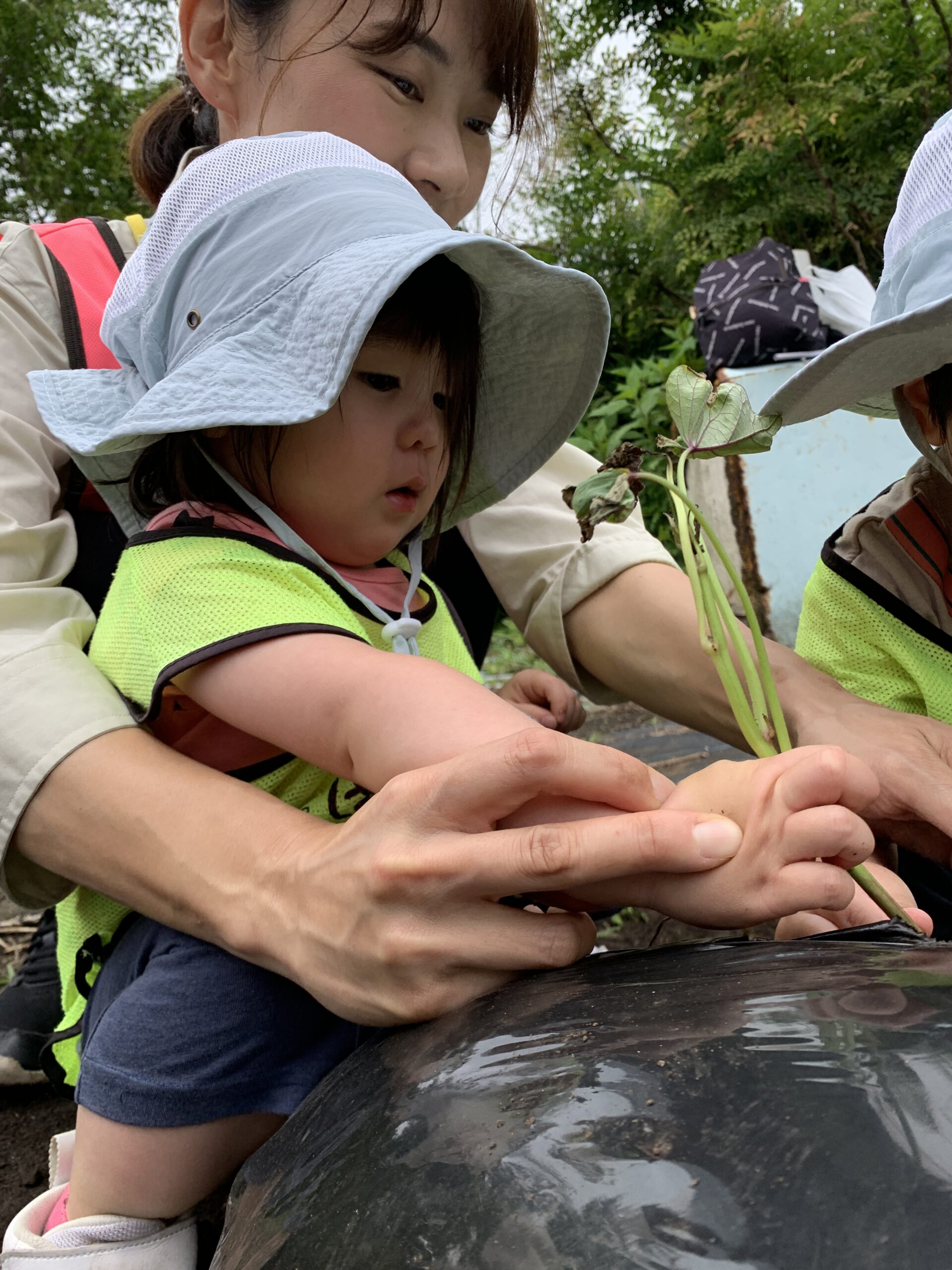 「やさしく持ってね〜」と声をかけると、小さな手でそっと苗をつかみ、丁寧に土の中へ。「おおきくなあれ〜!」と優しい声で話しかけながら植える姿はとても感動的で、一人ひとりが苗に気持ちを込めている様子が伝わってきました。