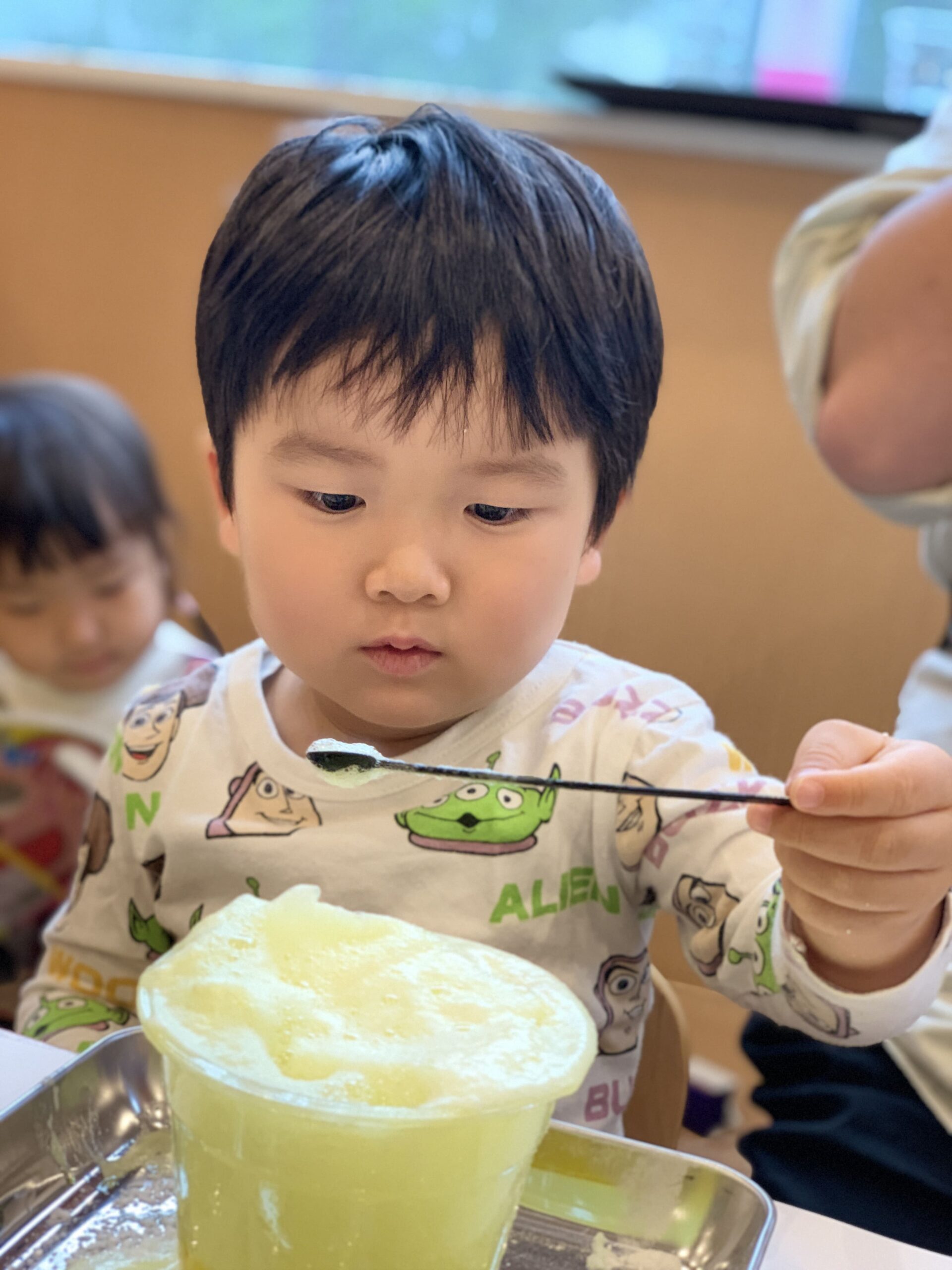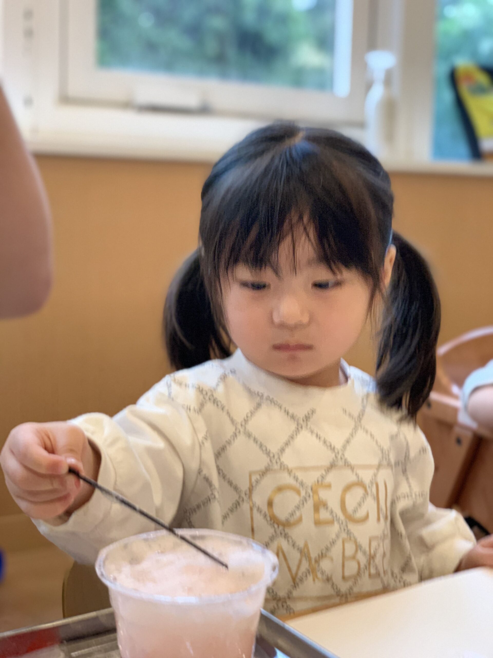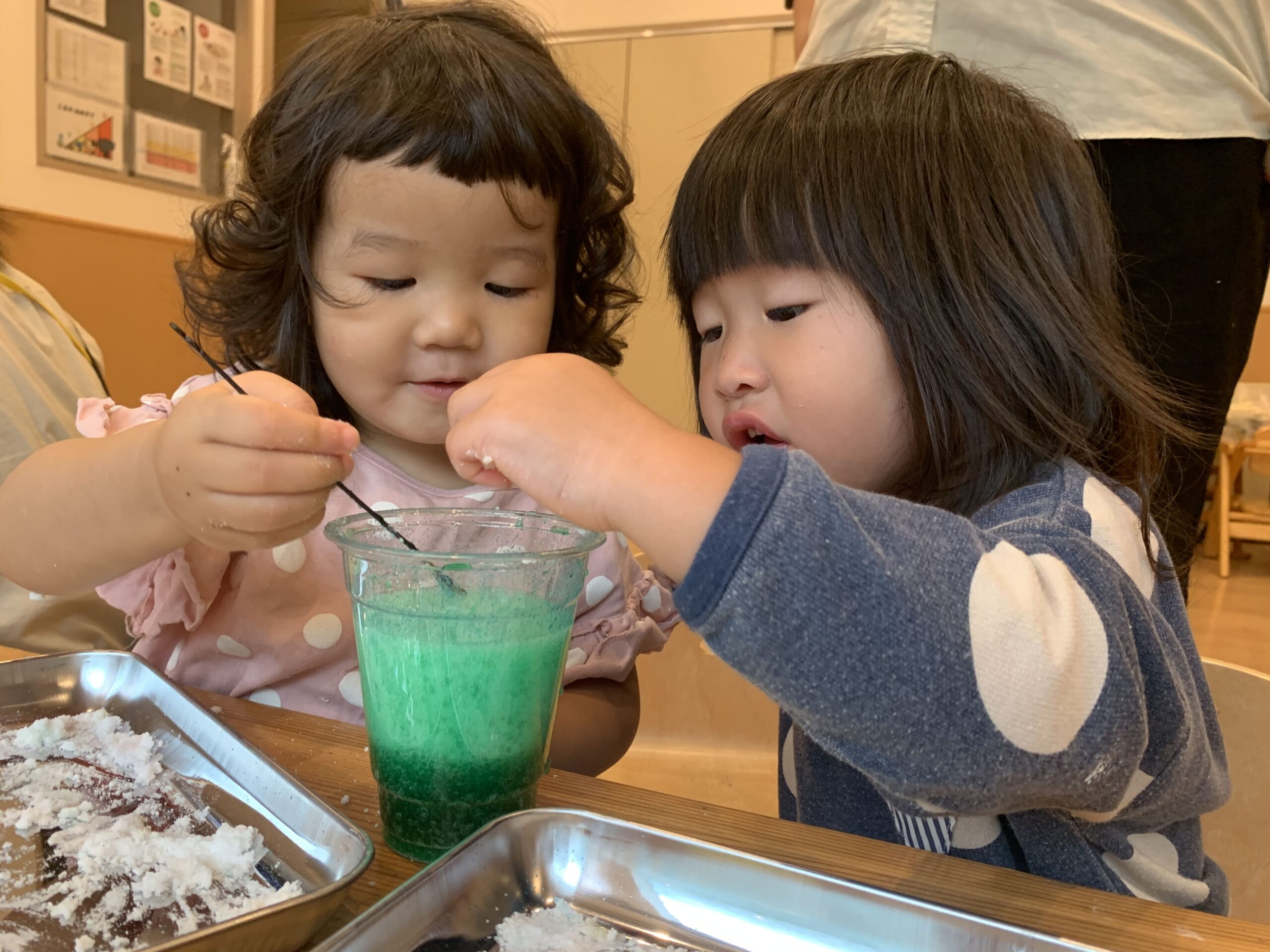 「みて、ぶどうジュース!」「こっちはメロン!」 と創造力たっぷりの遊びになりました。