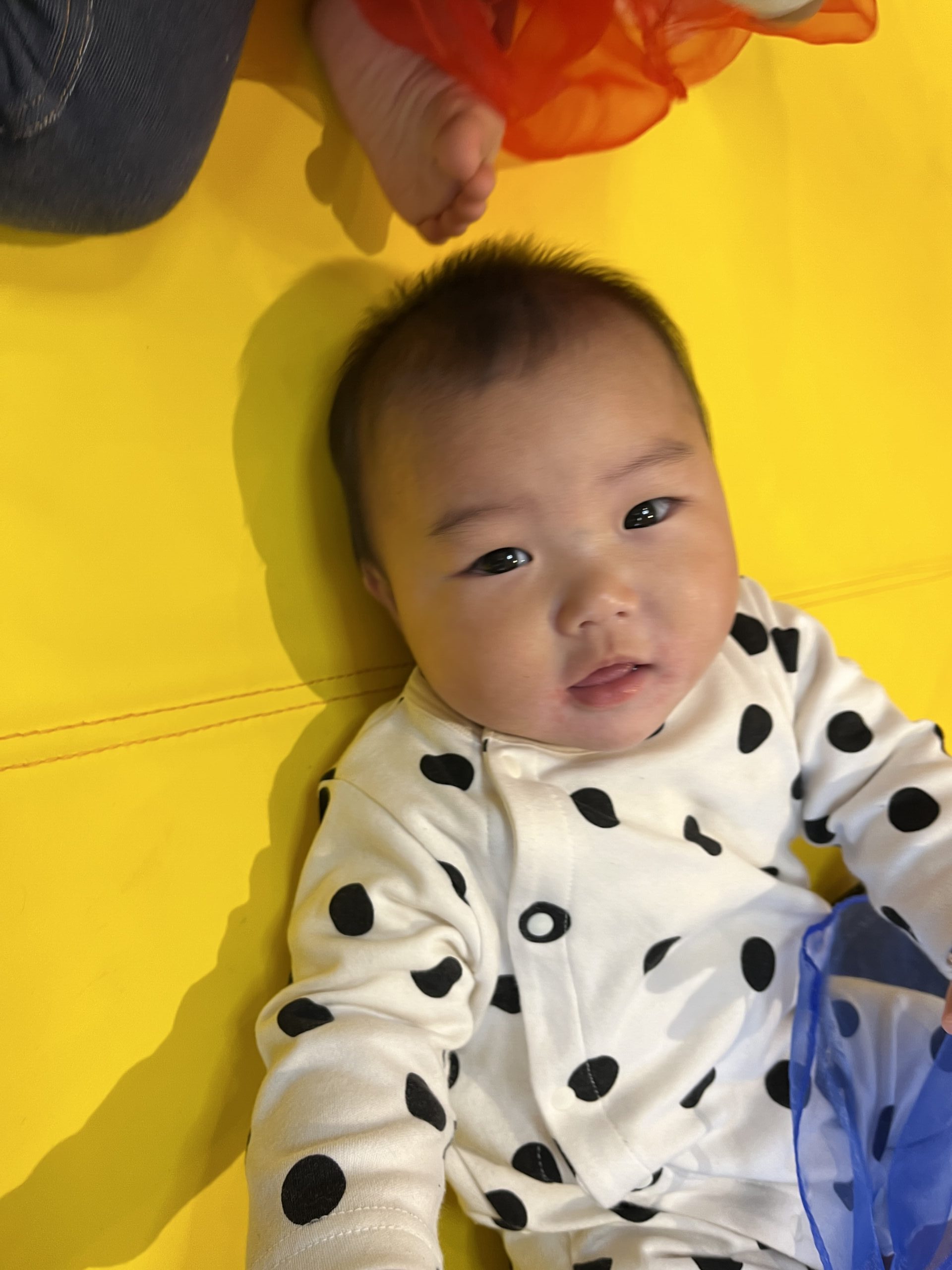 黄色と青のマットを用意して、保育者が「黄色!」「青!」と声をかけると、その色に合わせて子どもたちがマットの上へと集まります。色を認識する力だけでなく、「見て・聞いて・動く」という複数の感覚を同時に使うこの活動は、乳児期にとても大切な認知の発達を促します。