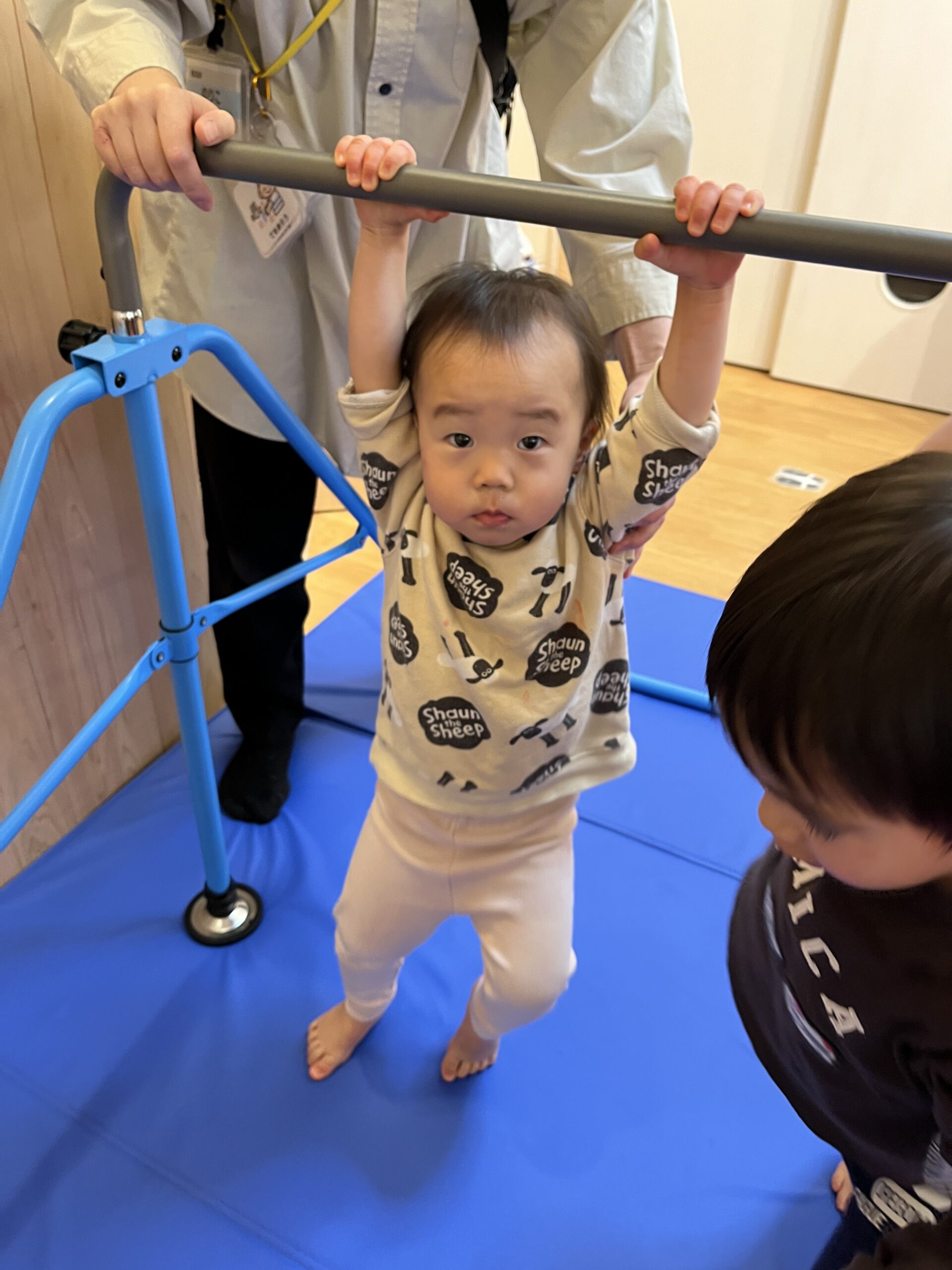 保育室の一角にトランポリンやトンネル、鉄棒などを用意して、子どもたちは大喜び!