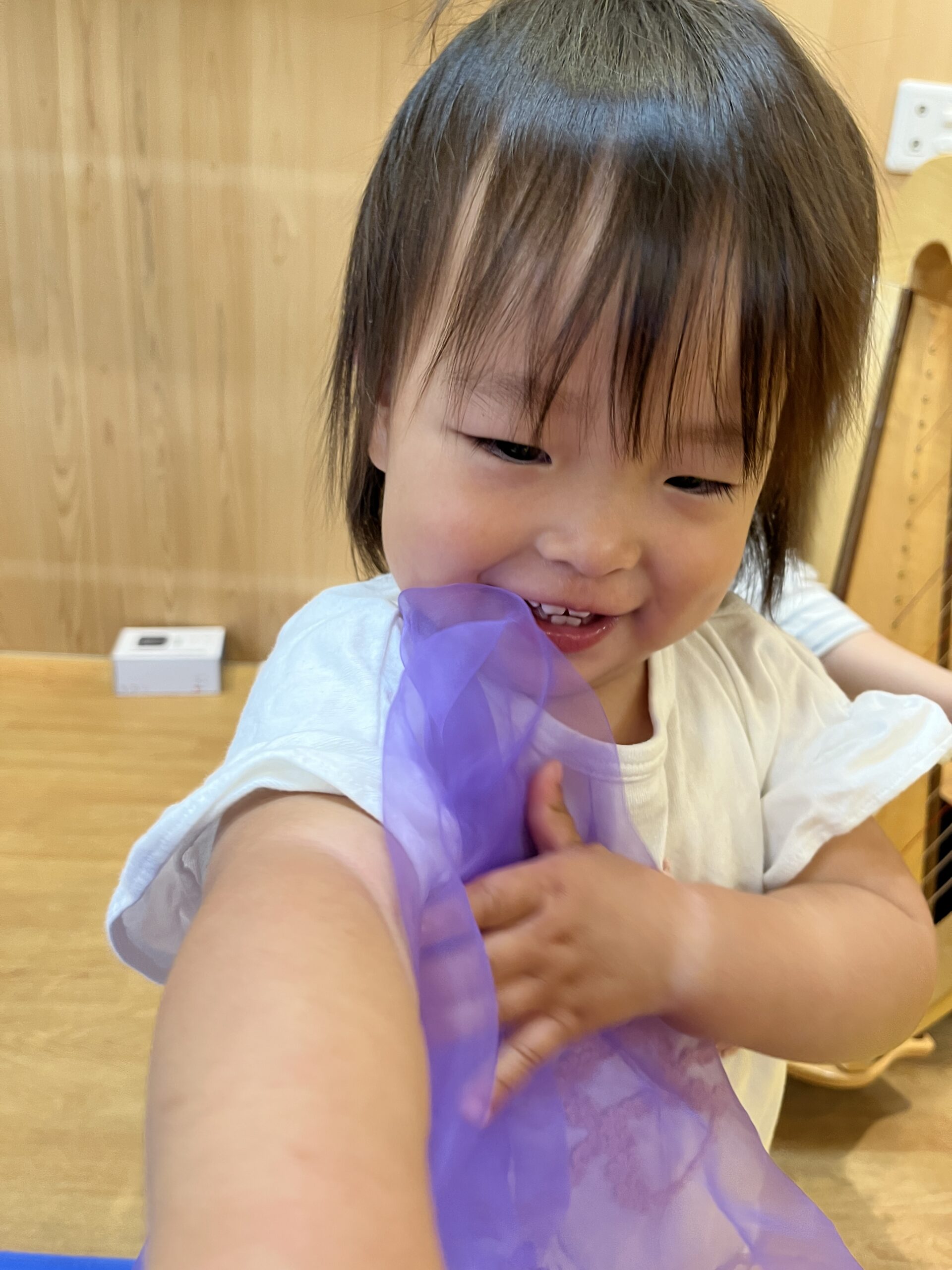 スカーフをふわっと揺らしたり、音楽のリズムに合わせてふわりと投げたりする活動では、風を感じながら「音と動き」のつながりを体験。
